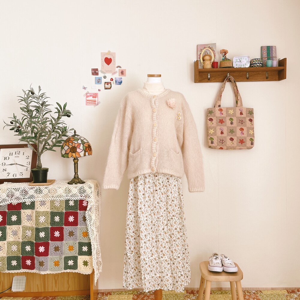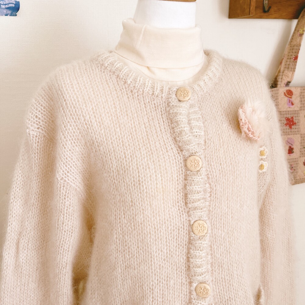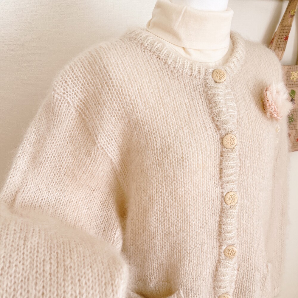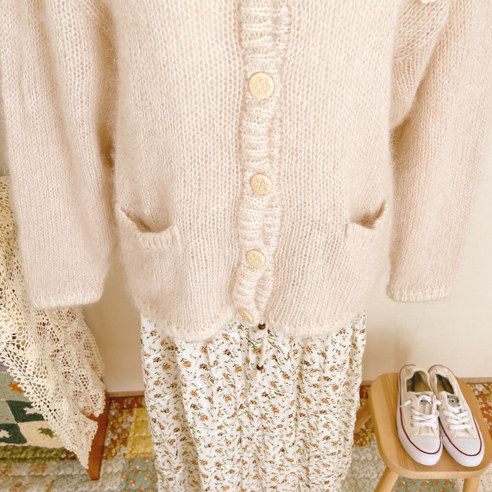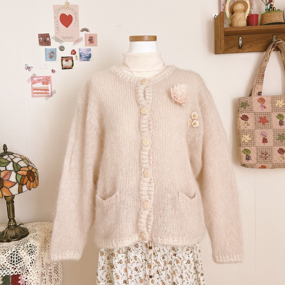 분홍빛 도는 아이보리 색감의 가디건이에요