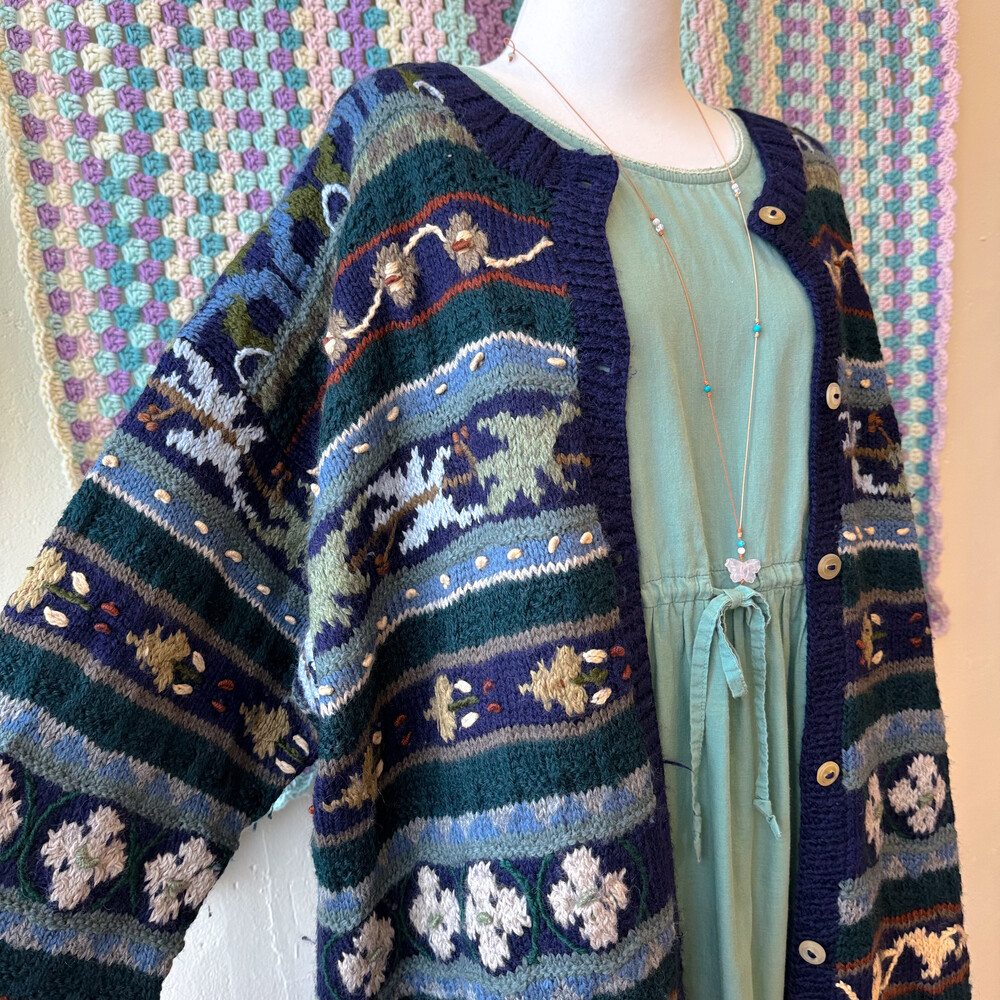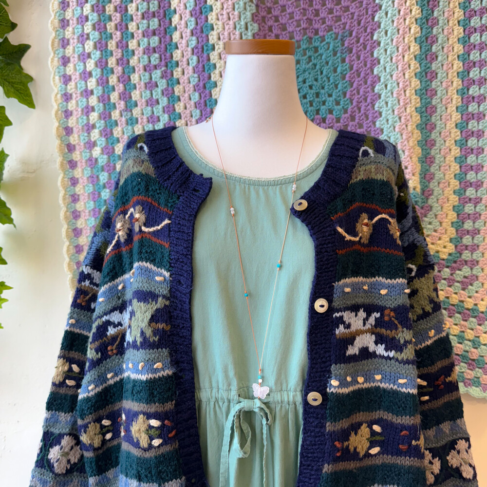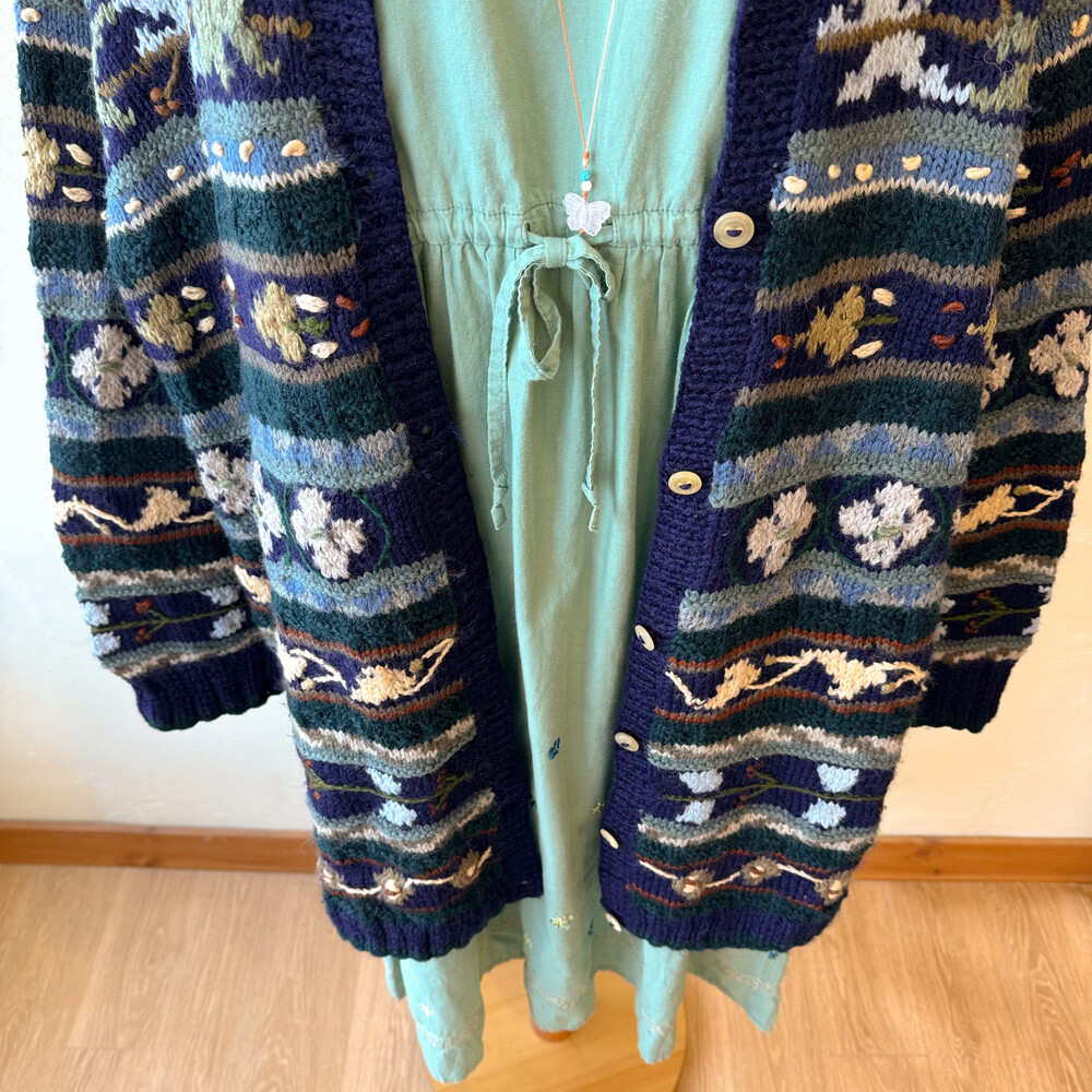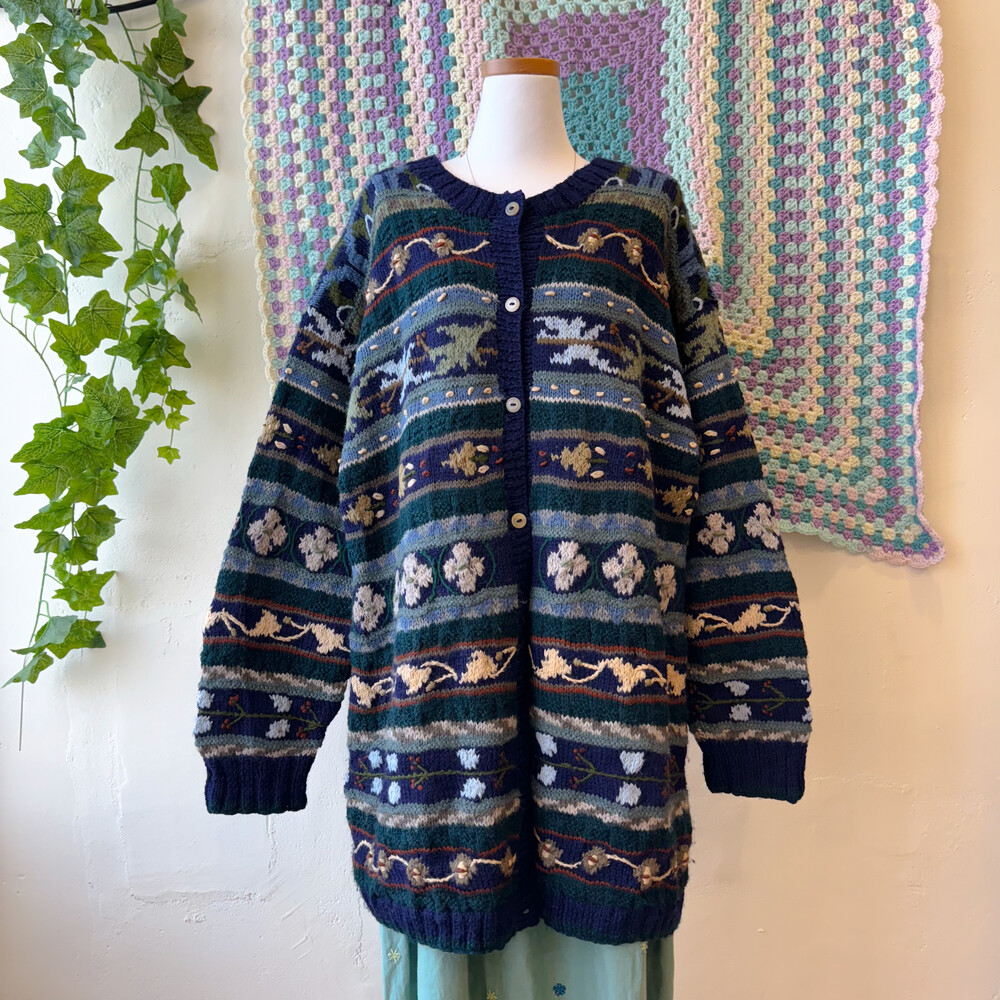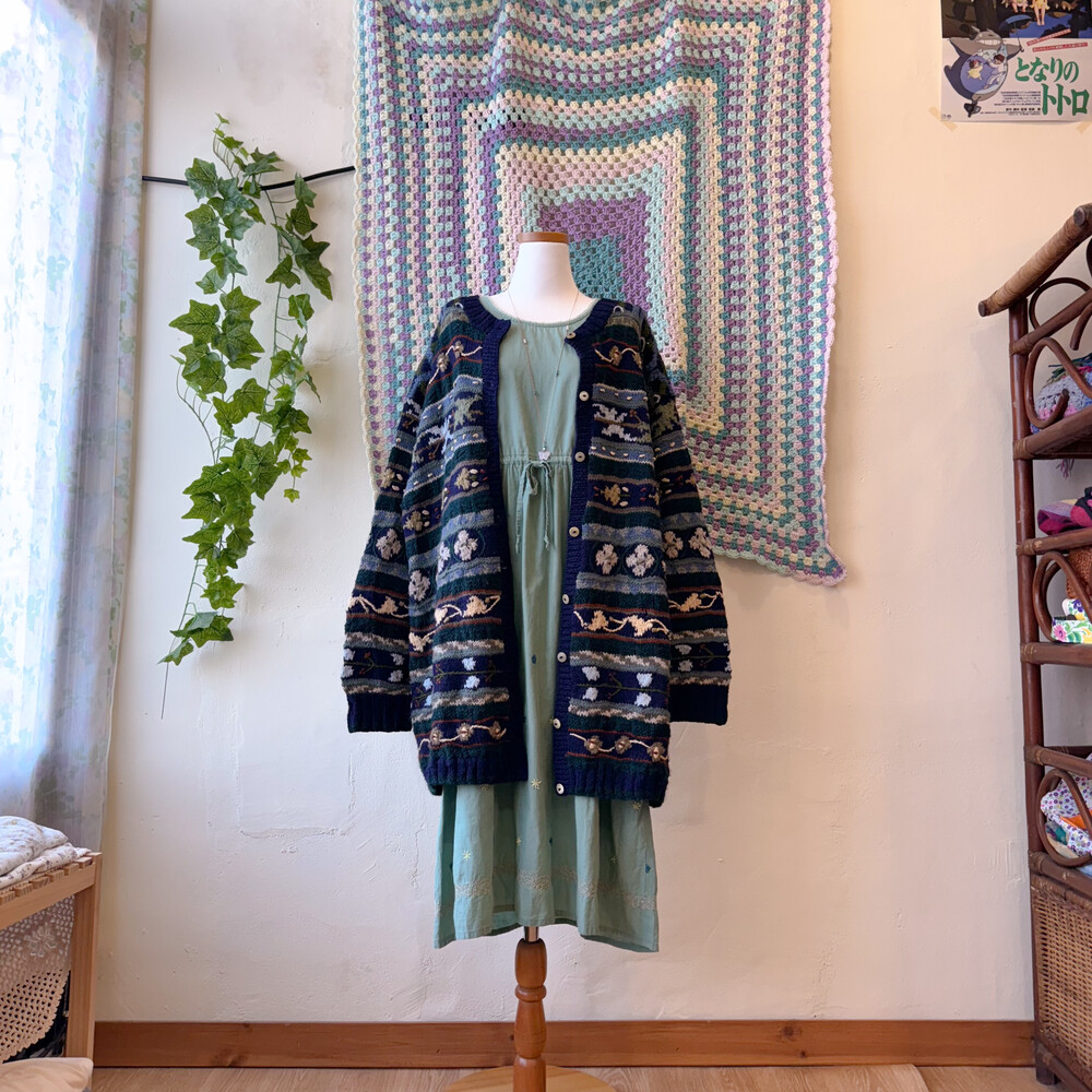 네이비, 그린 색감 등 조합의 자수 롱가디건이에요