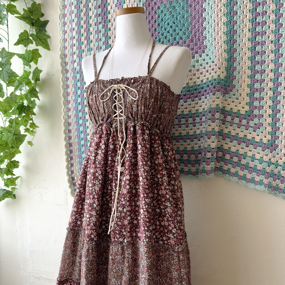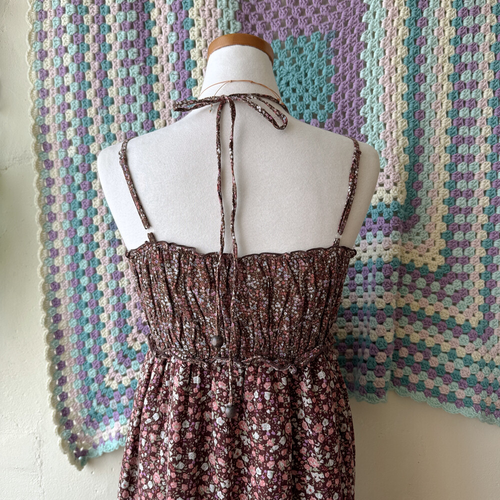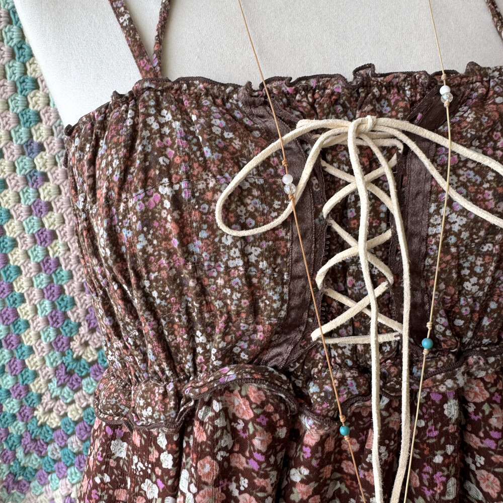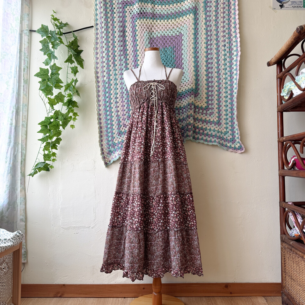 브라운 색감의 핑크 꽃무늬 패치 끈원피스예요