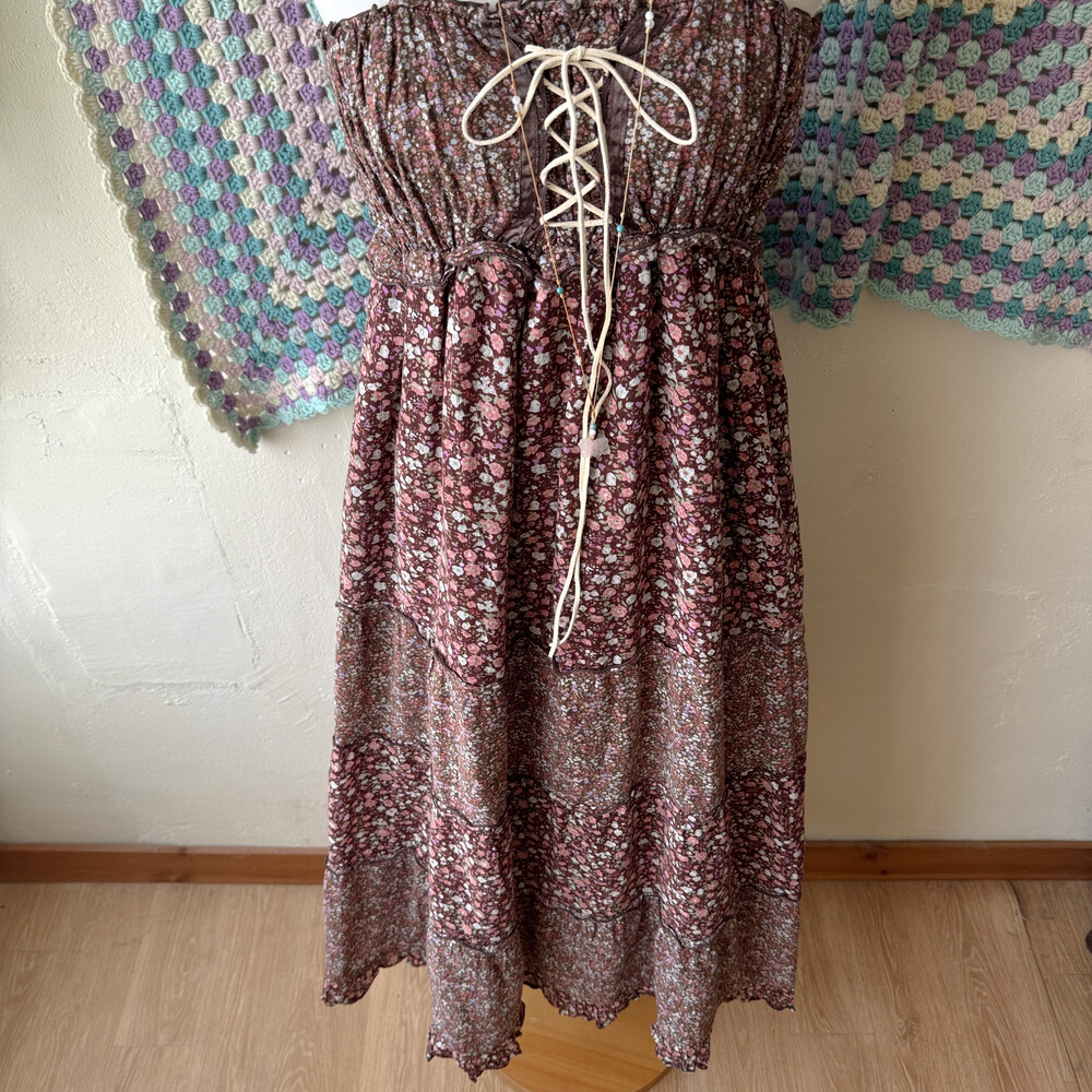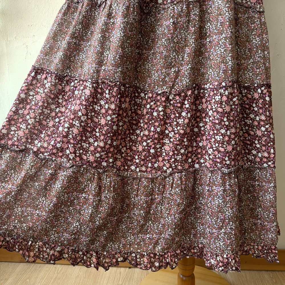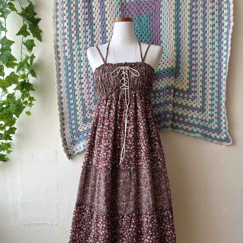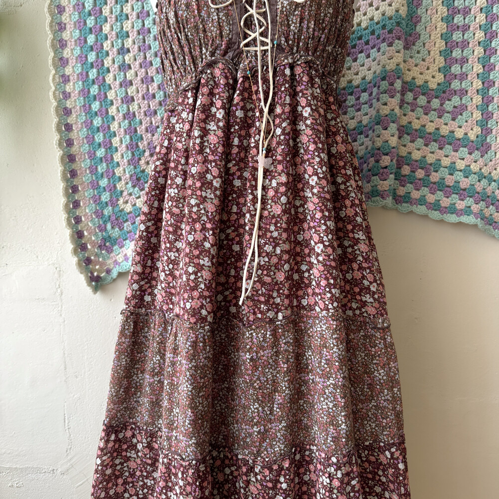 브라운 색감의 핑크 꽃무늬 패치 끈원피스예요