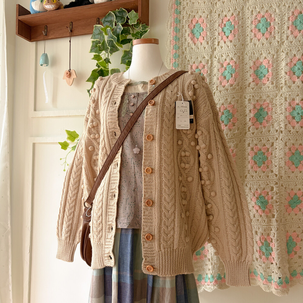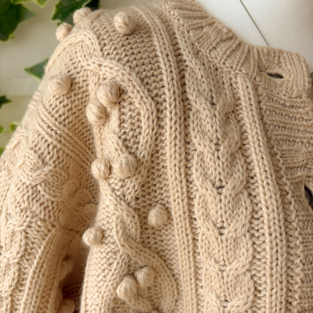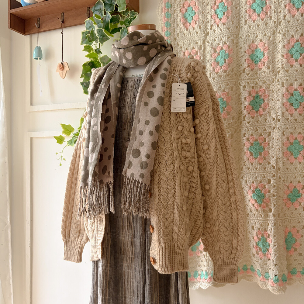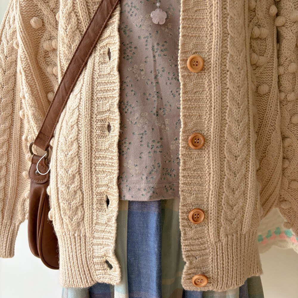 베이지 색감의 폼폼 케이블 가디건이에요