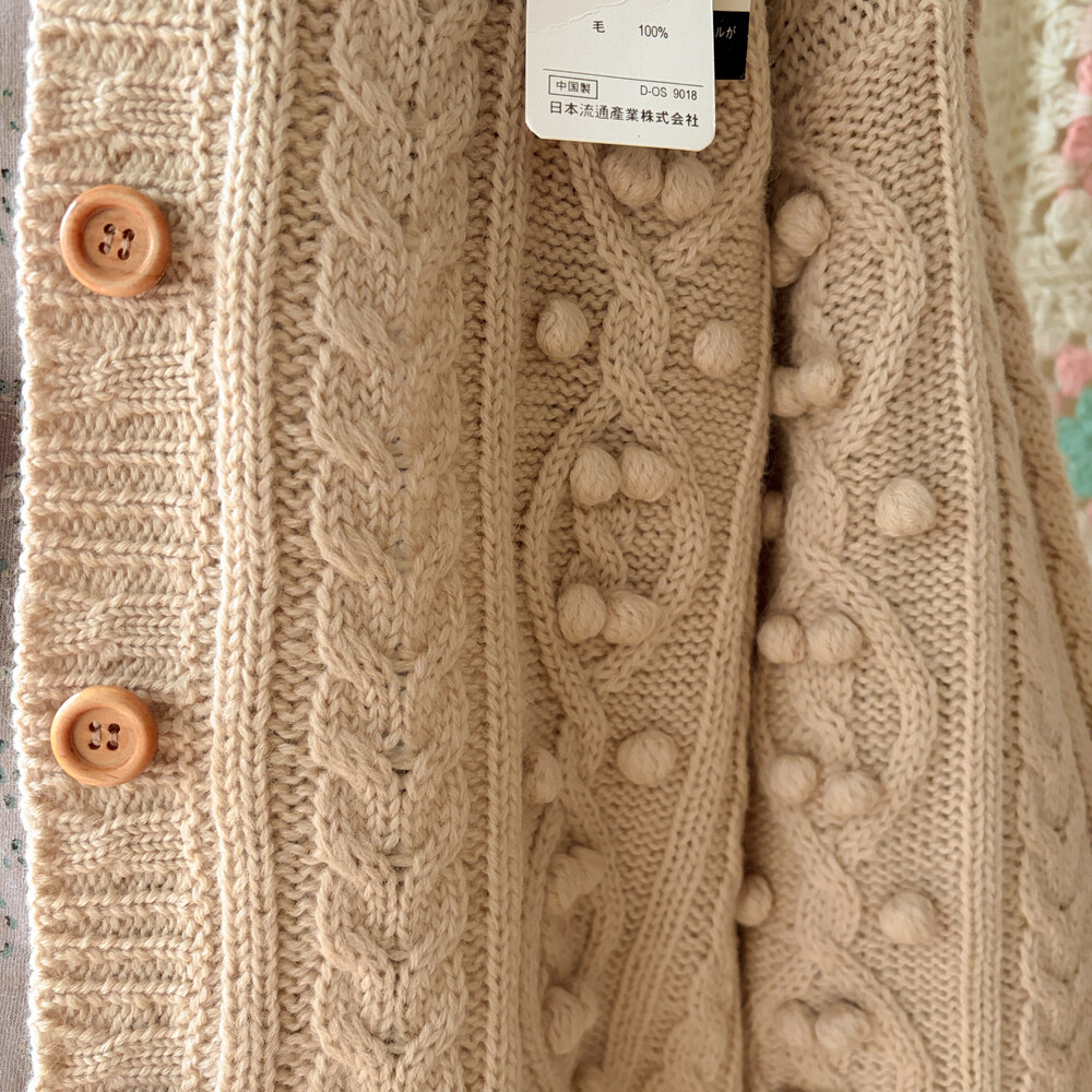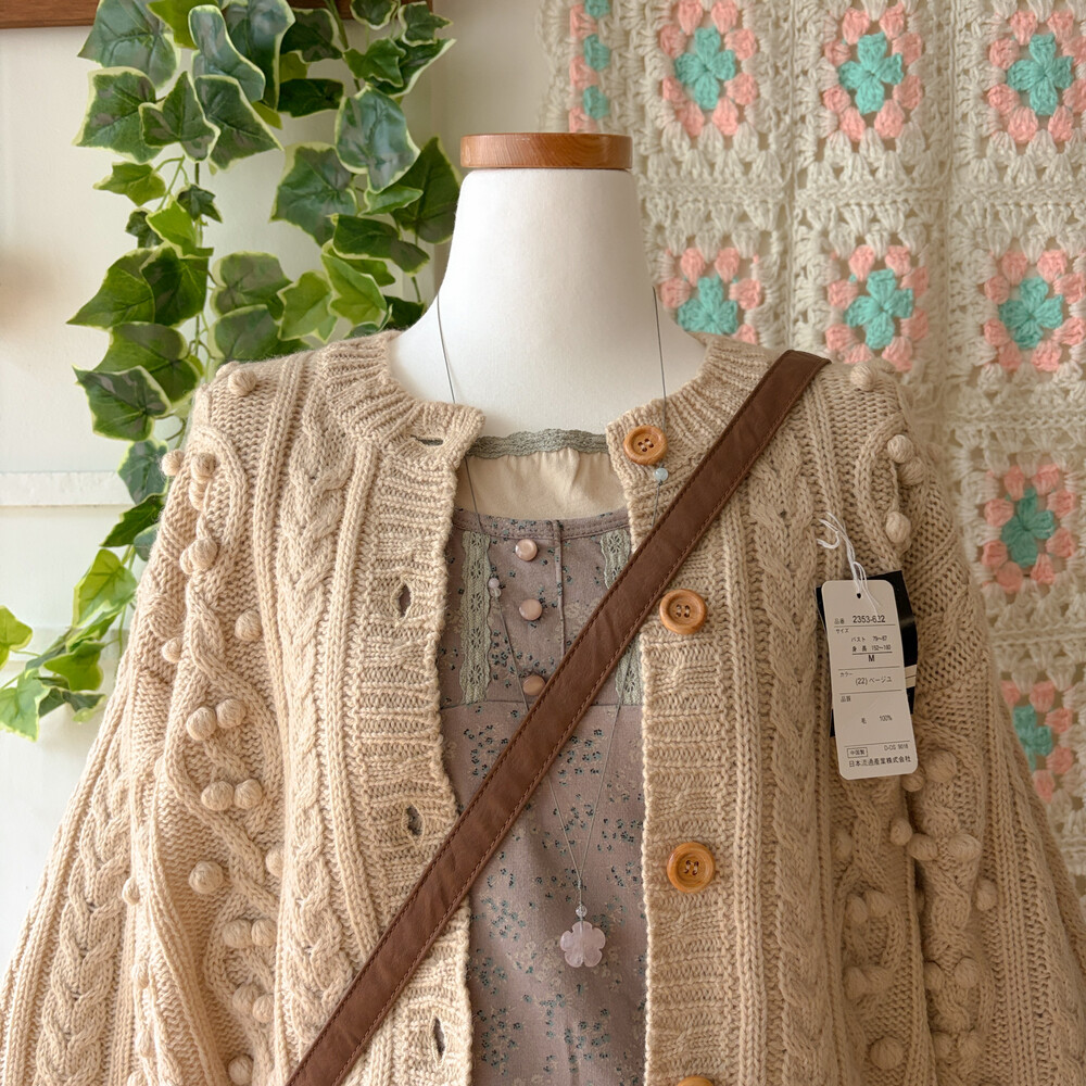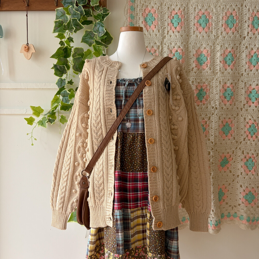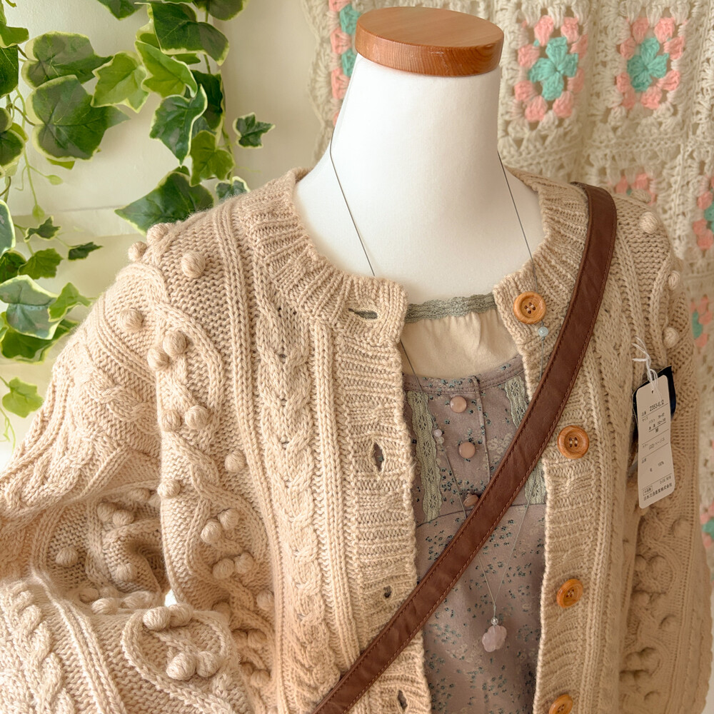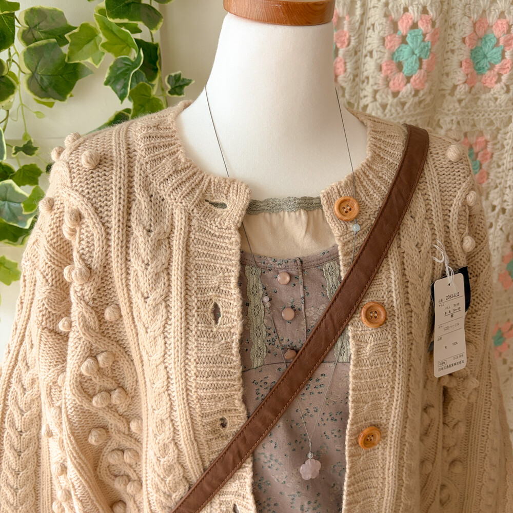 베이지 색감의 폼폼 케이블 가디건이에요