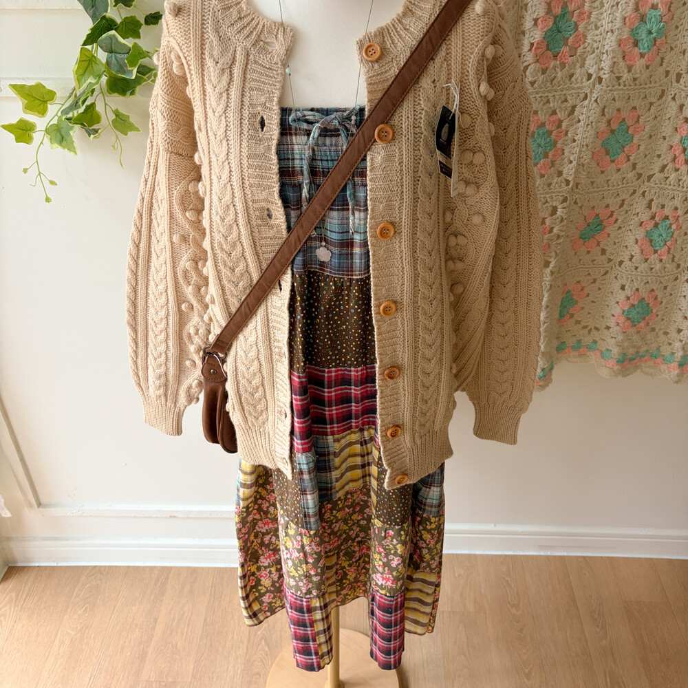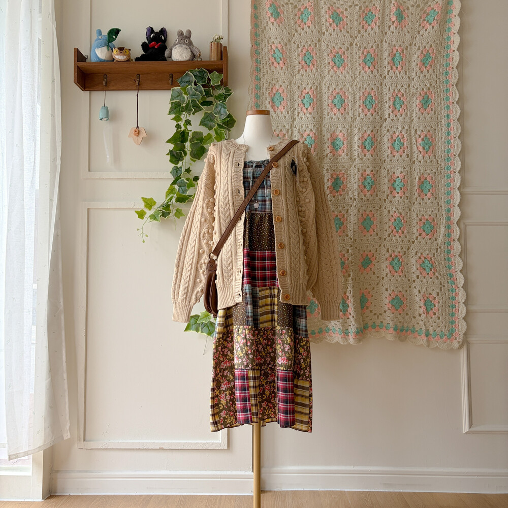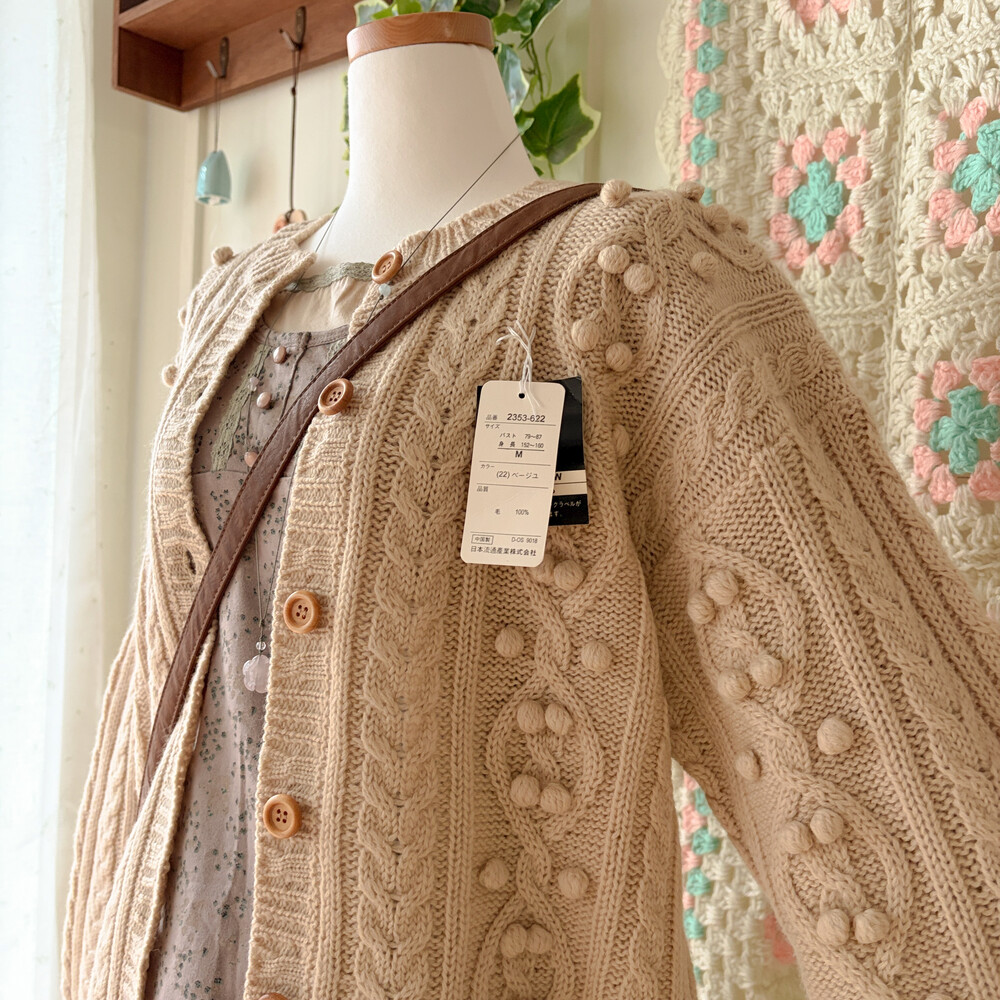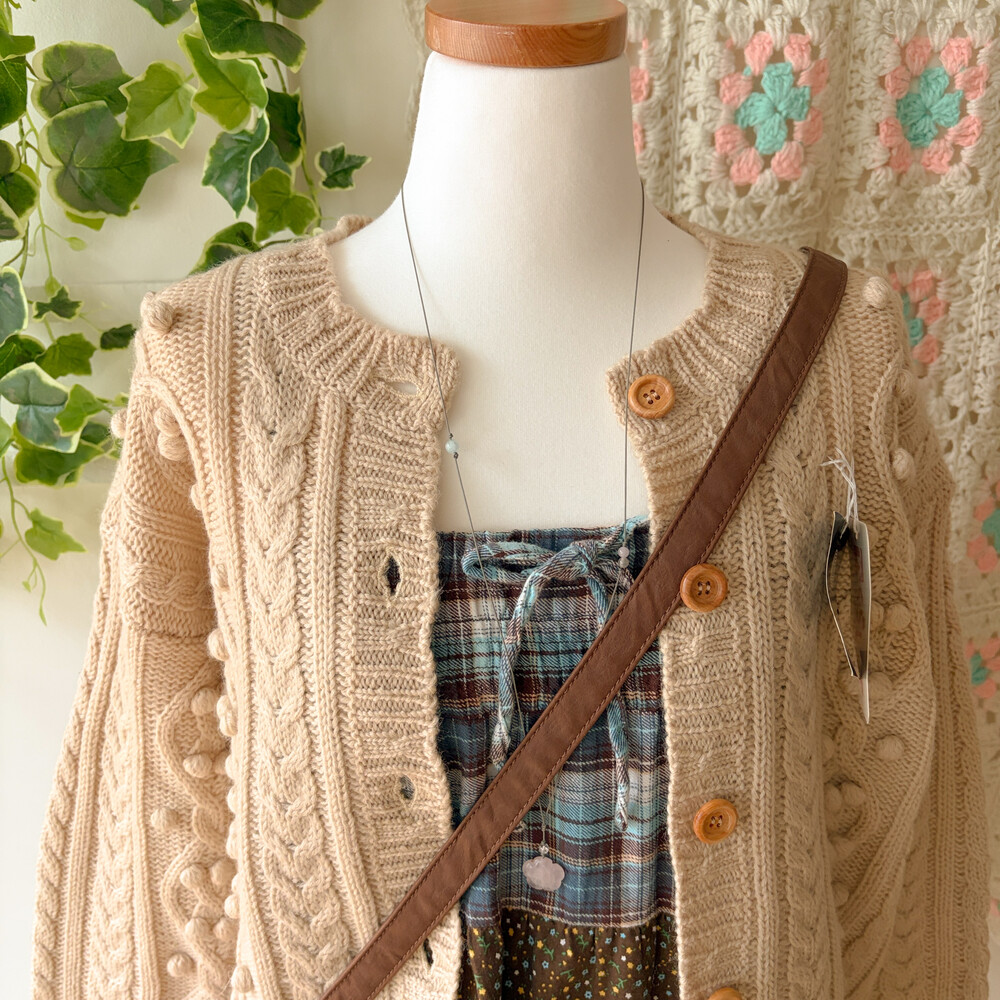 베이지 색감의 폼폼 케이블 가디건이에요