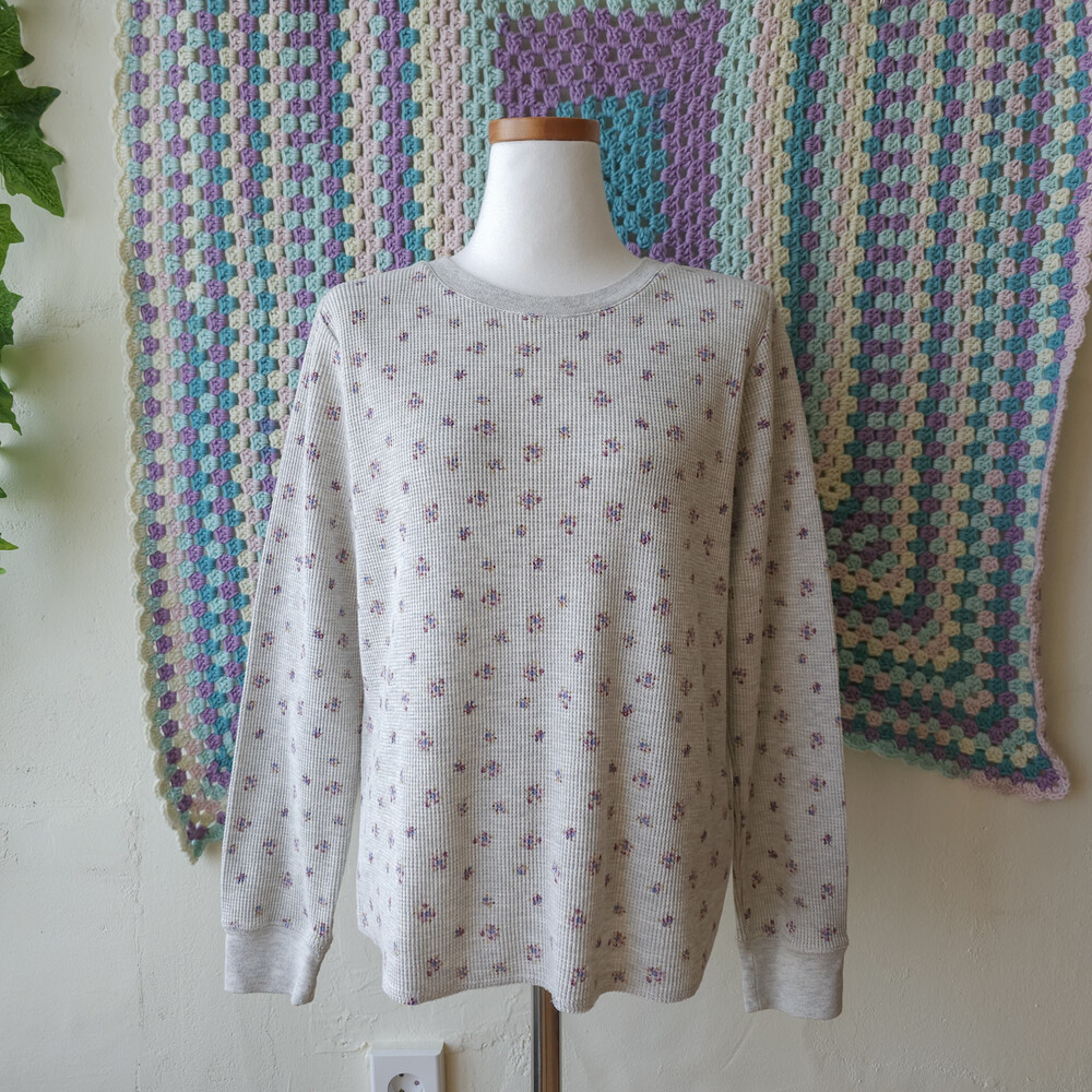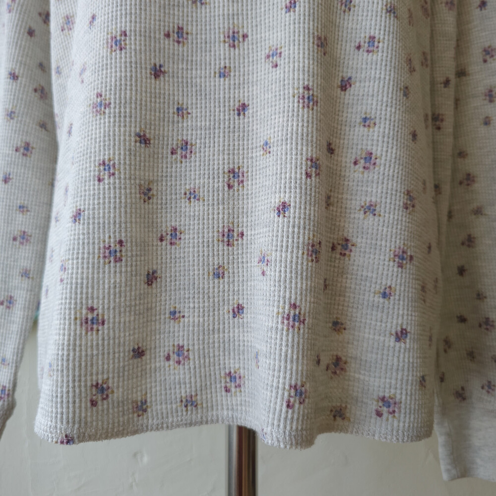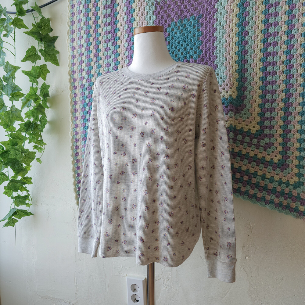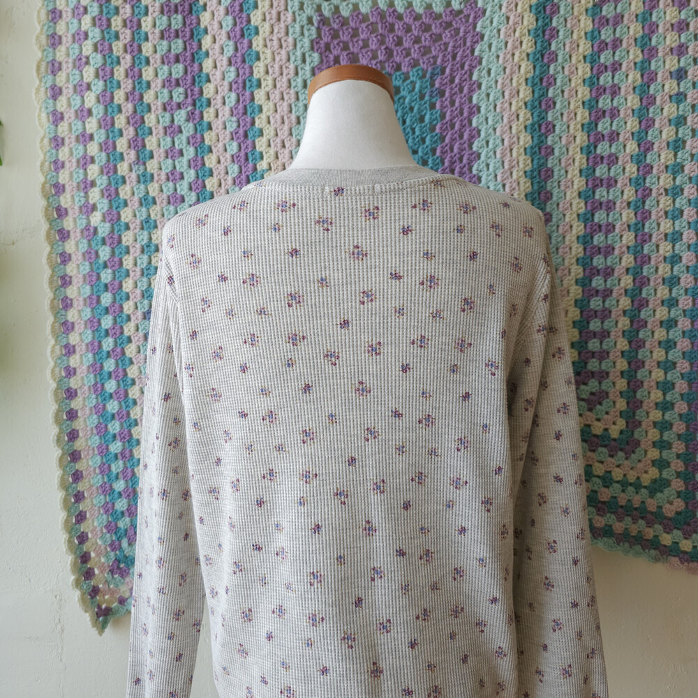 믹스 그레이 바탕에 보라 잔꽃 패턴의 와플 티셔츠예요