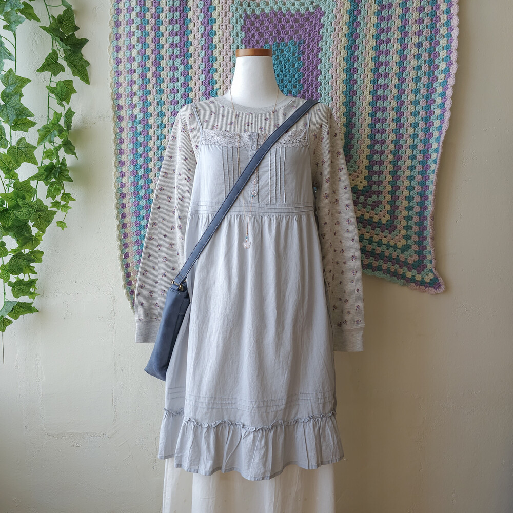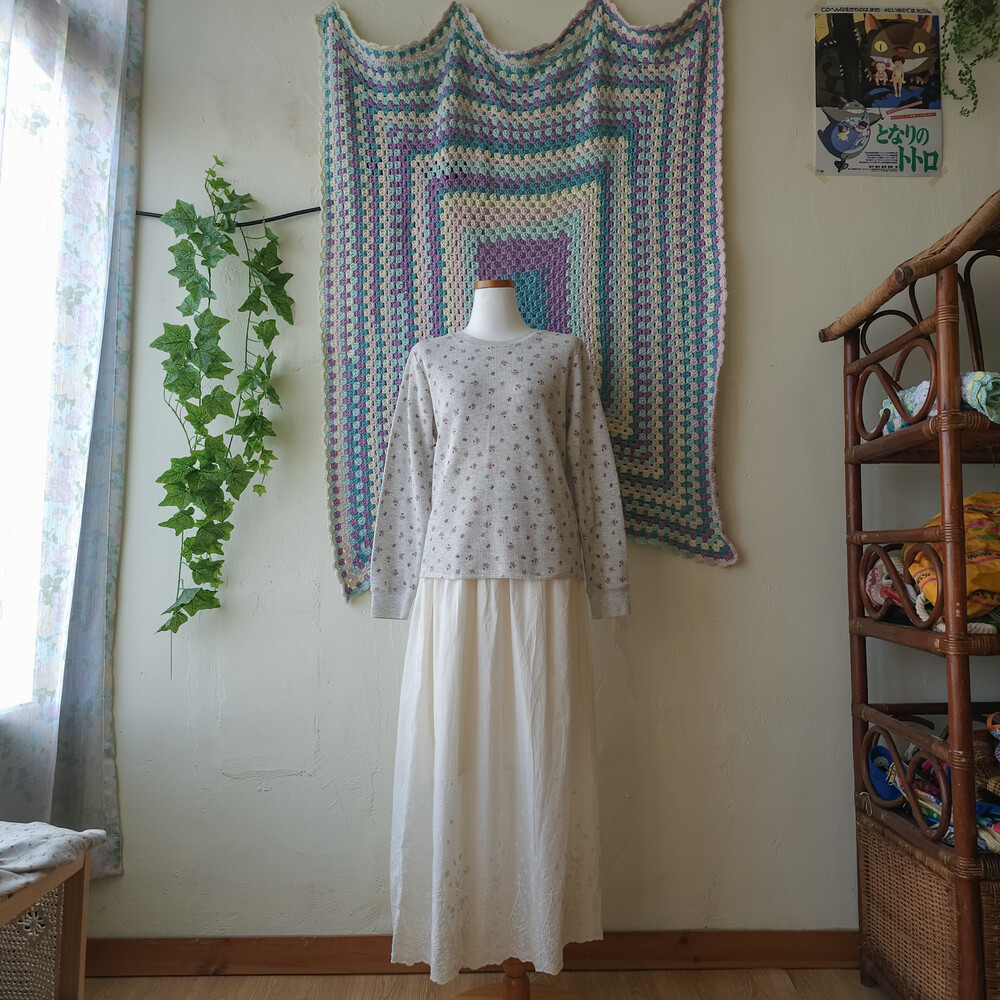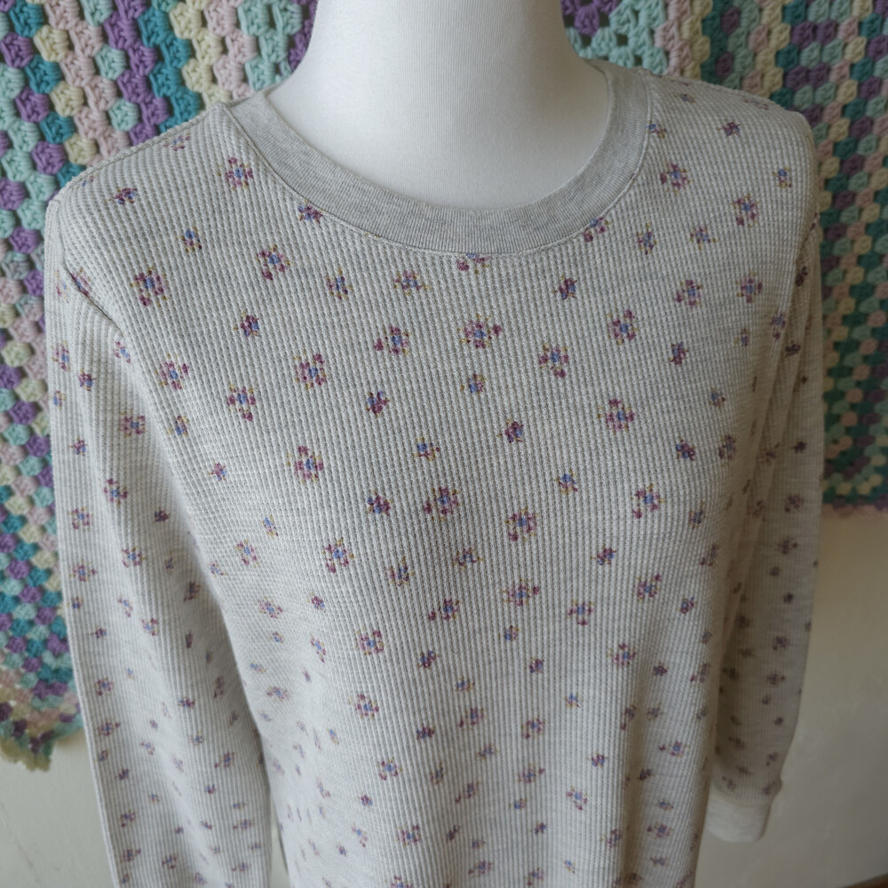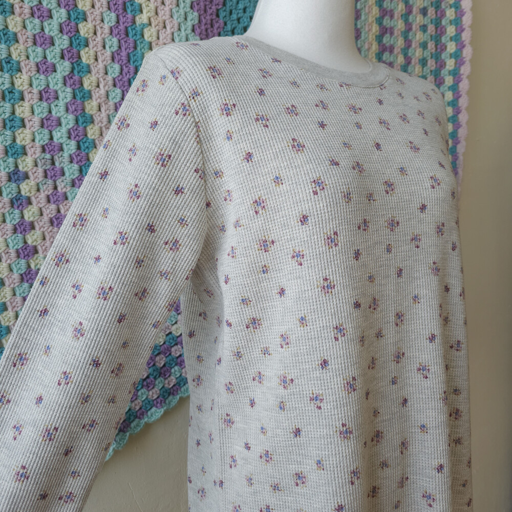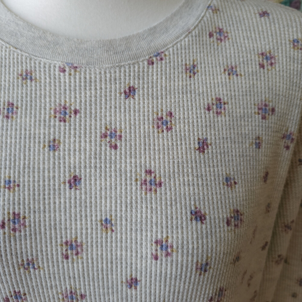 믹스 그레이 바탕에 보라 잔꽃 패턴의 와플 티셔츠예요