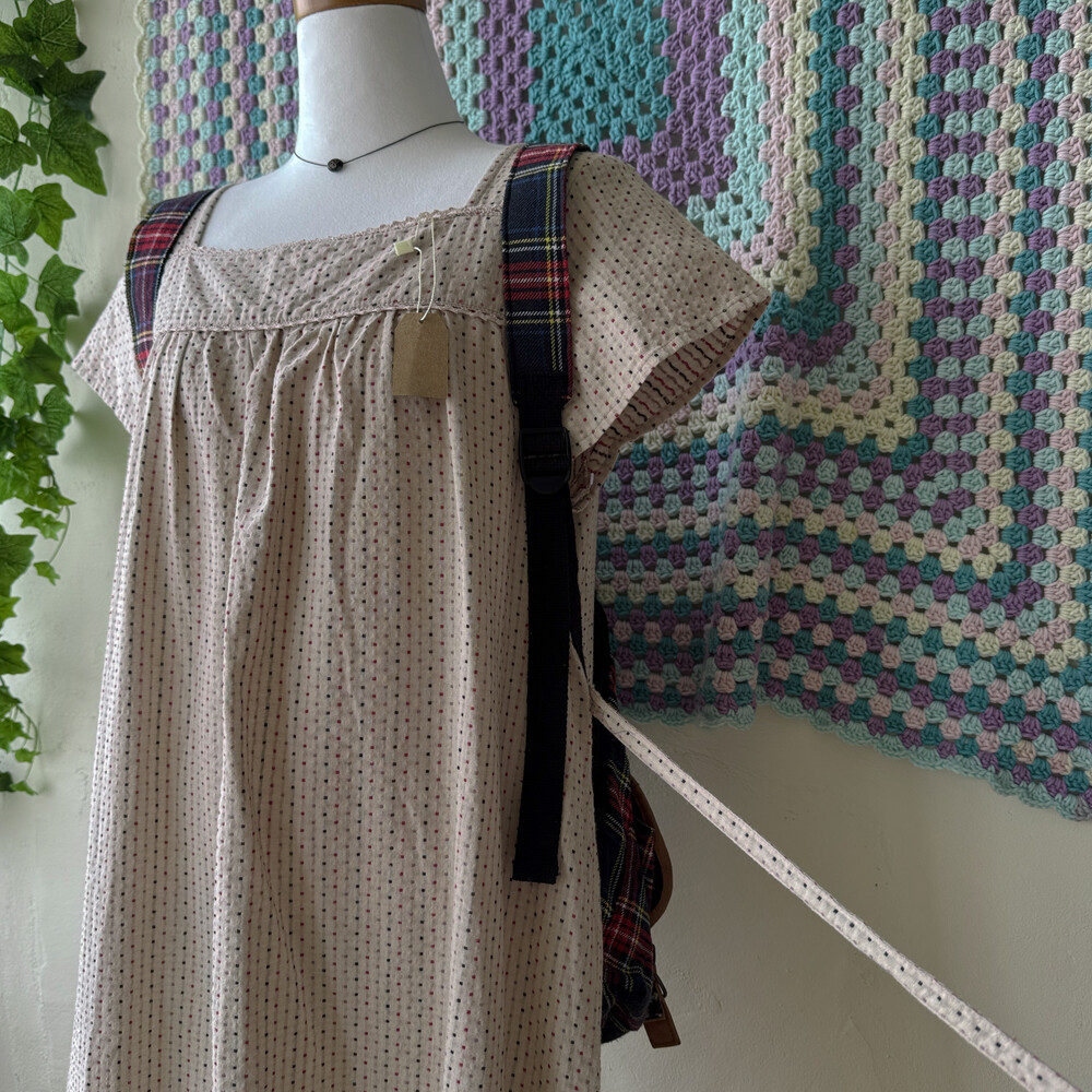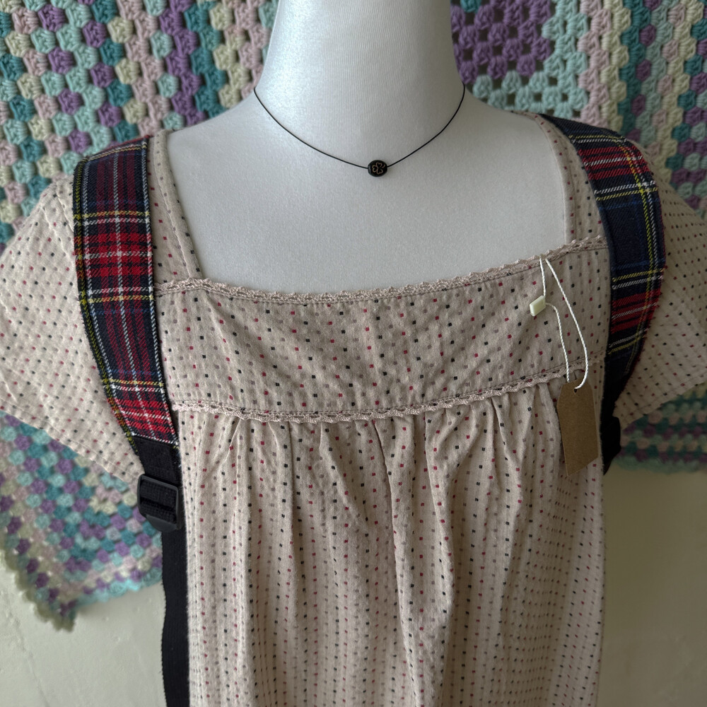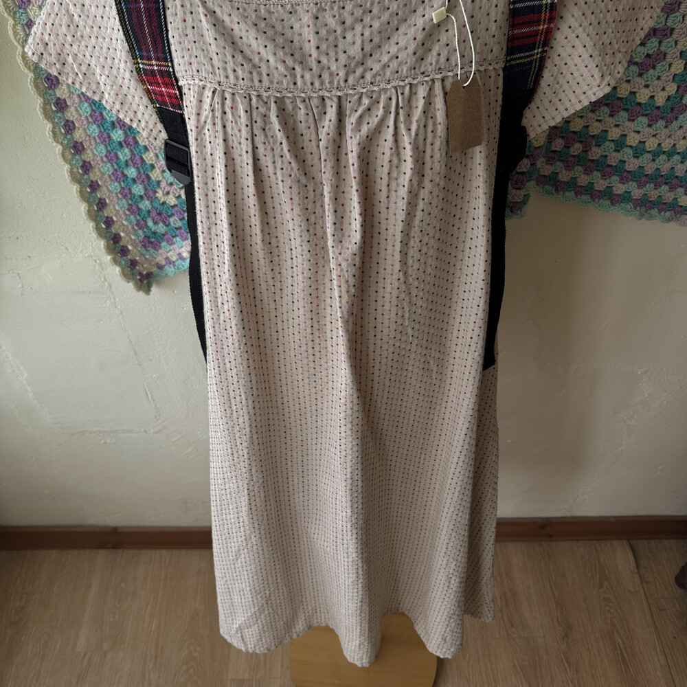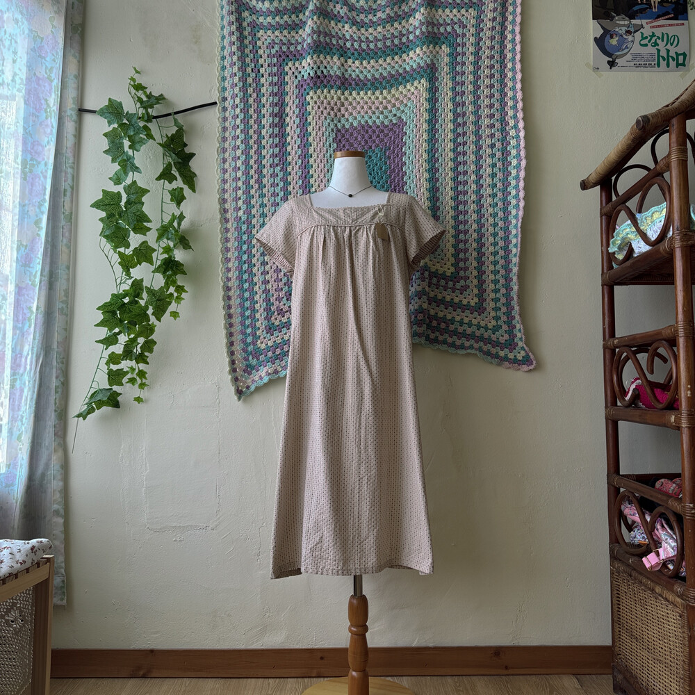 베이지 바탕에 블랙, 레드 패턴이 들어간 원피스예요