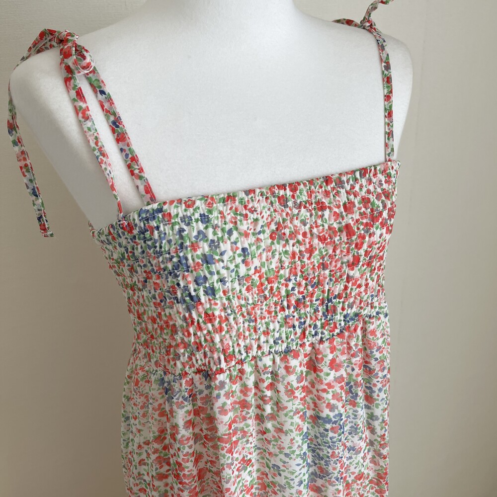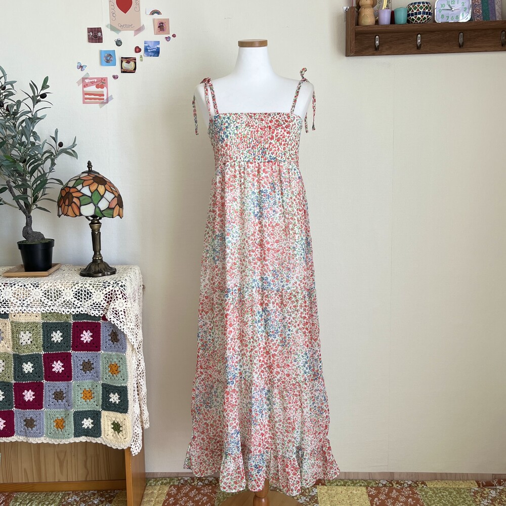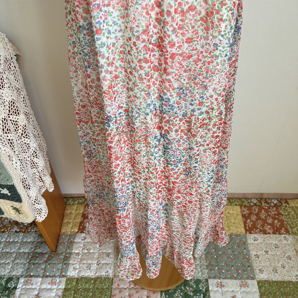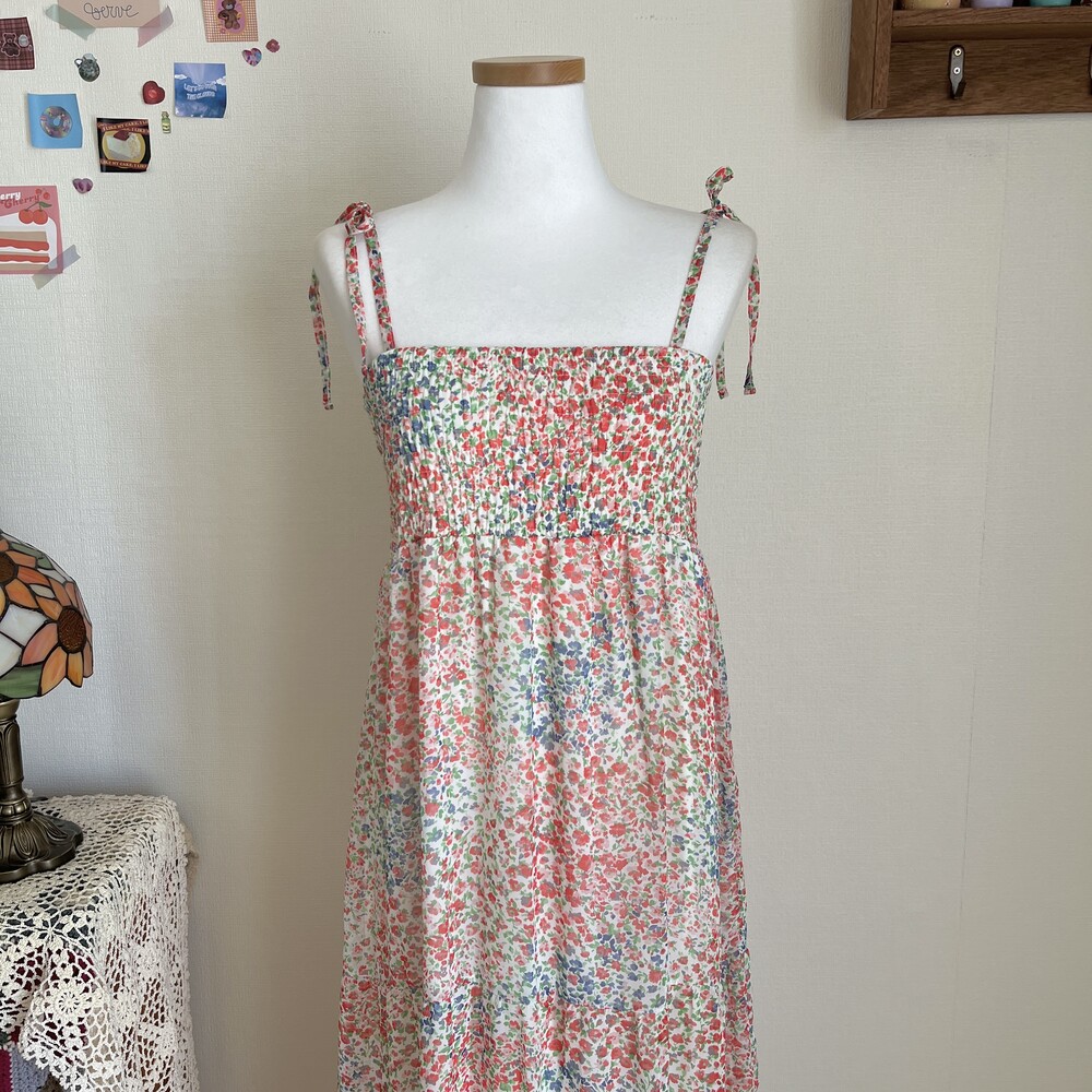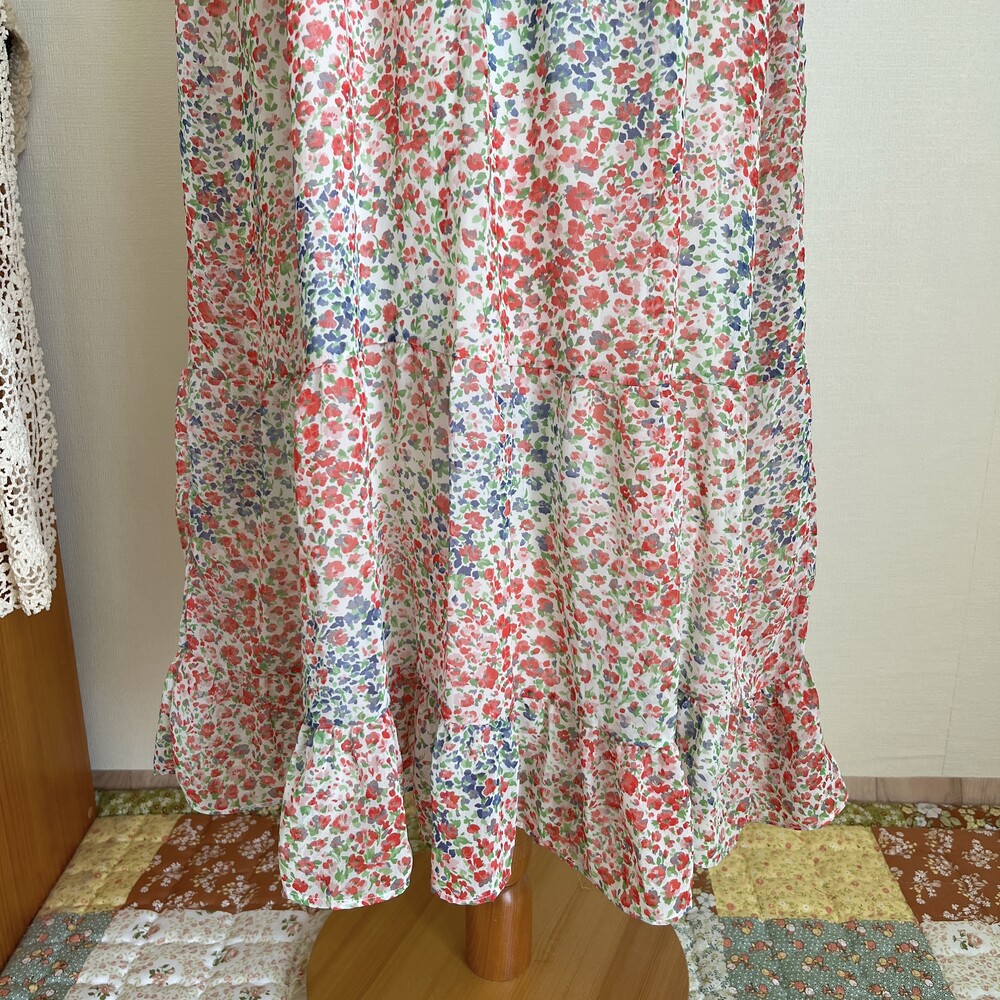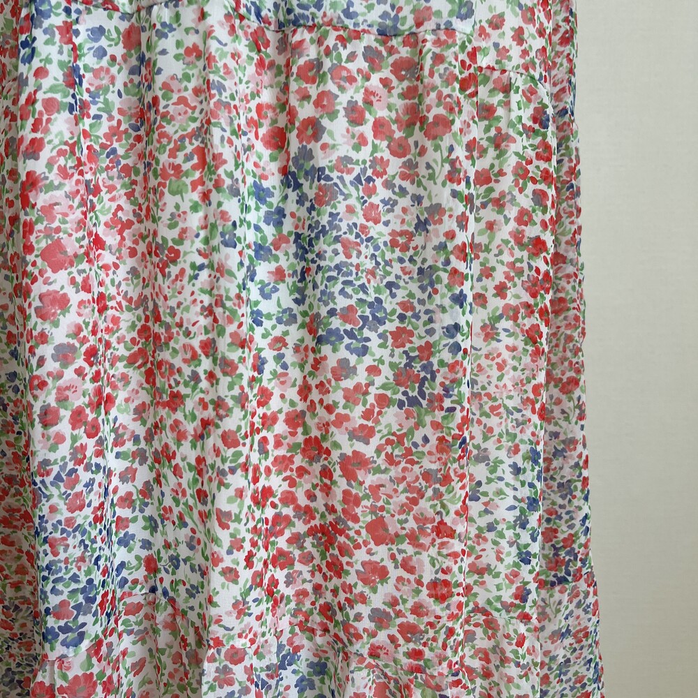 다홍, 블루 색감의 잔꽃 패턴 쉬폰 원피스예요