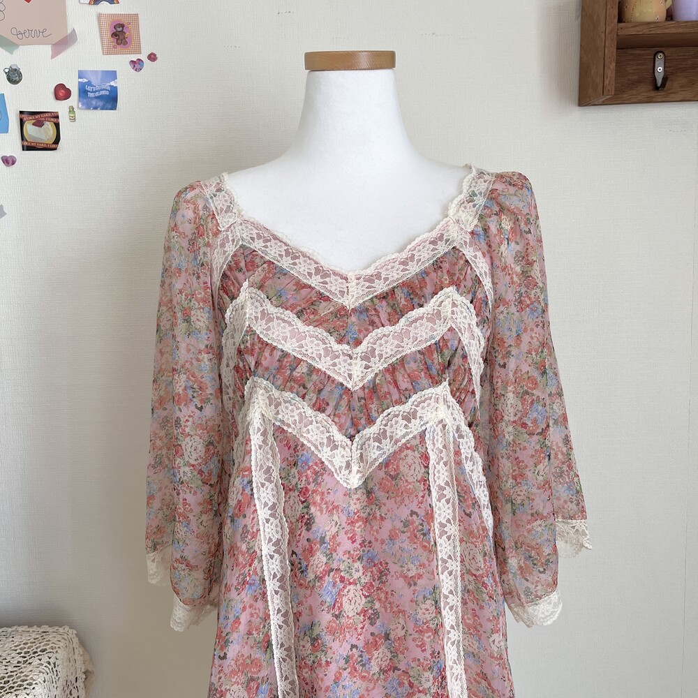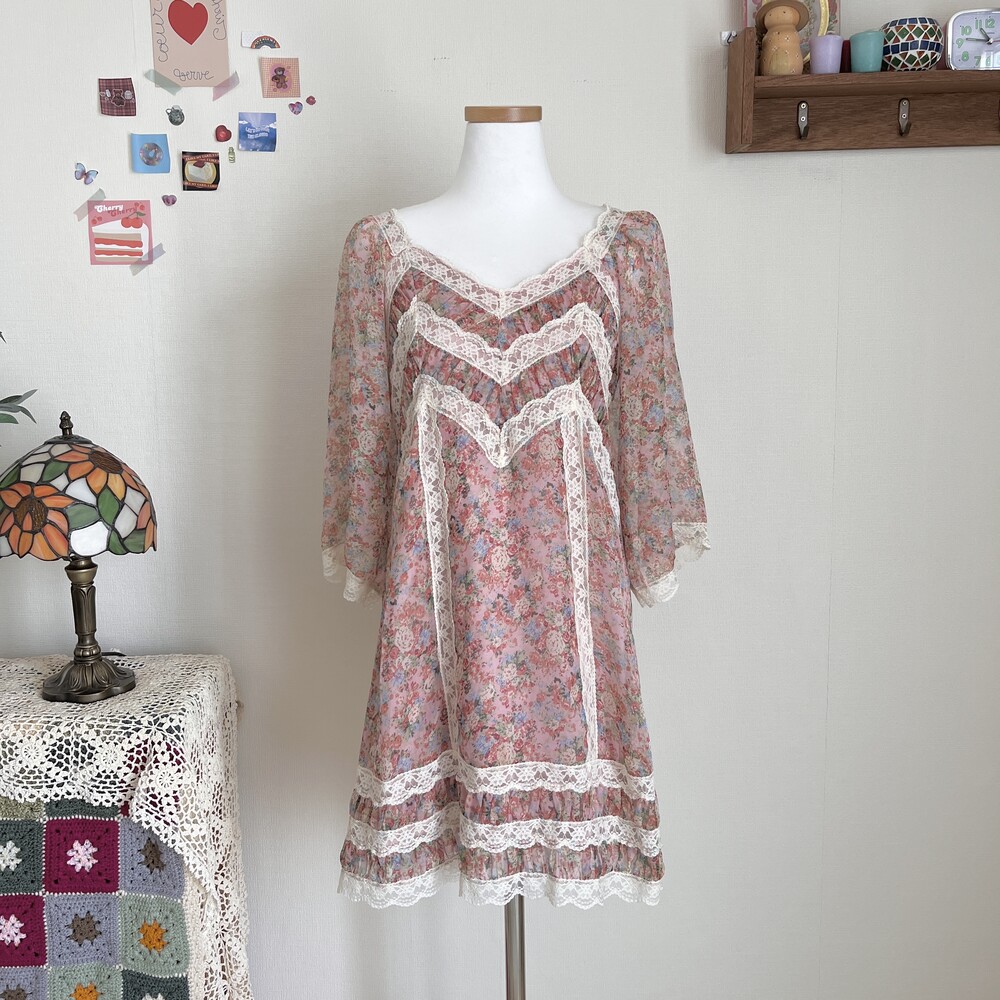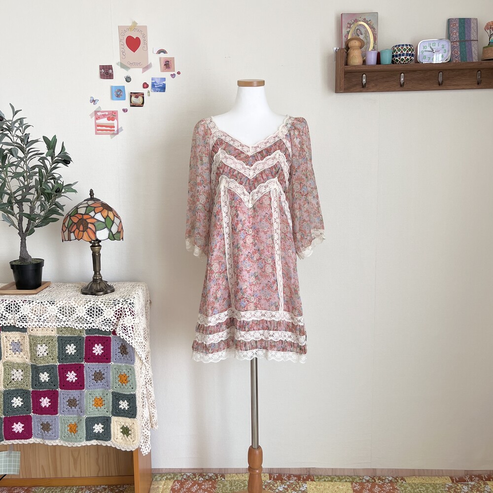 핑크 색감 베이스의 레이스 포인트 쉬폰 원피스예요