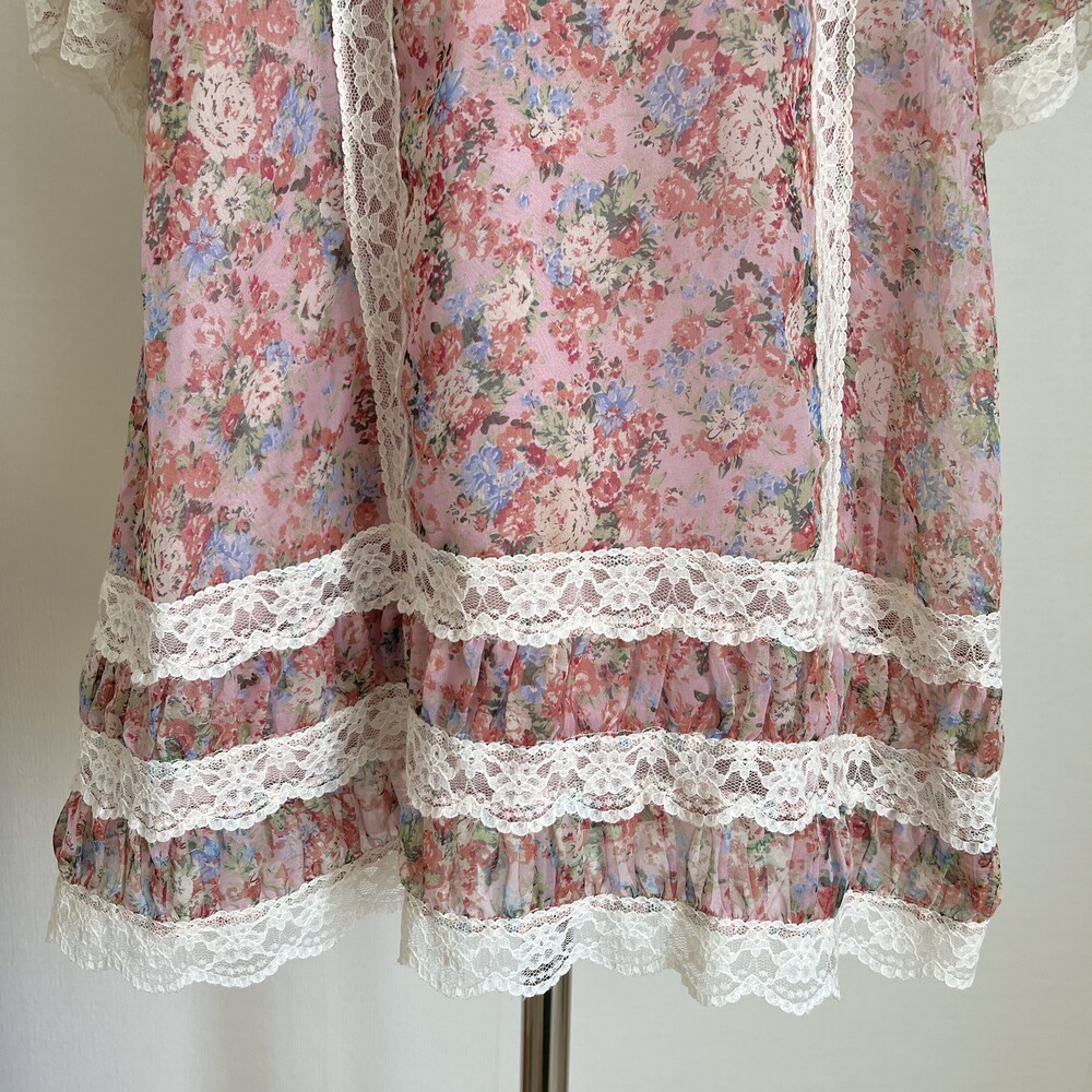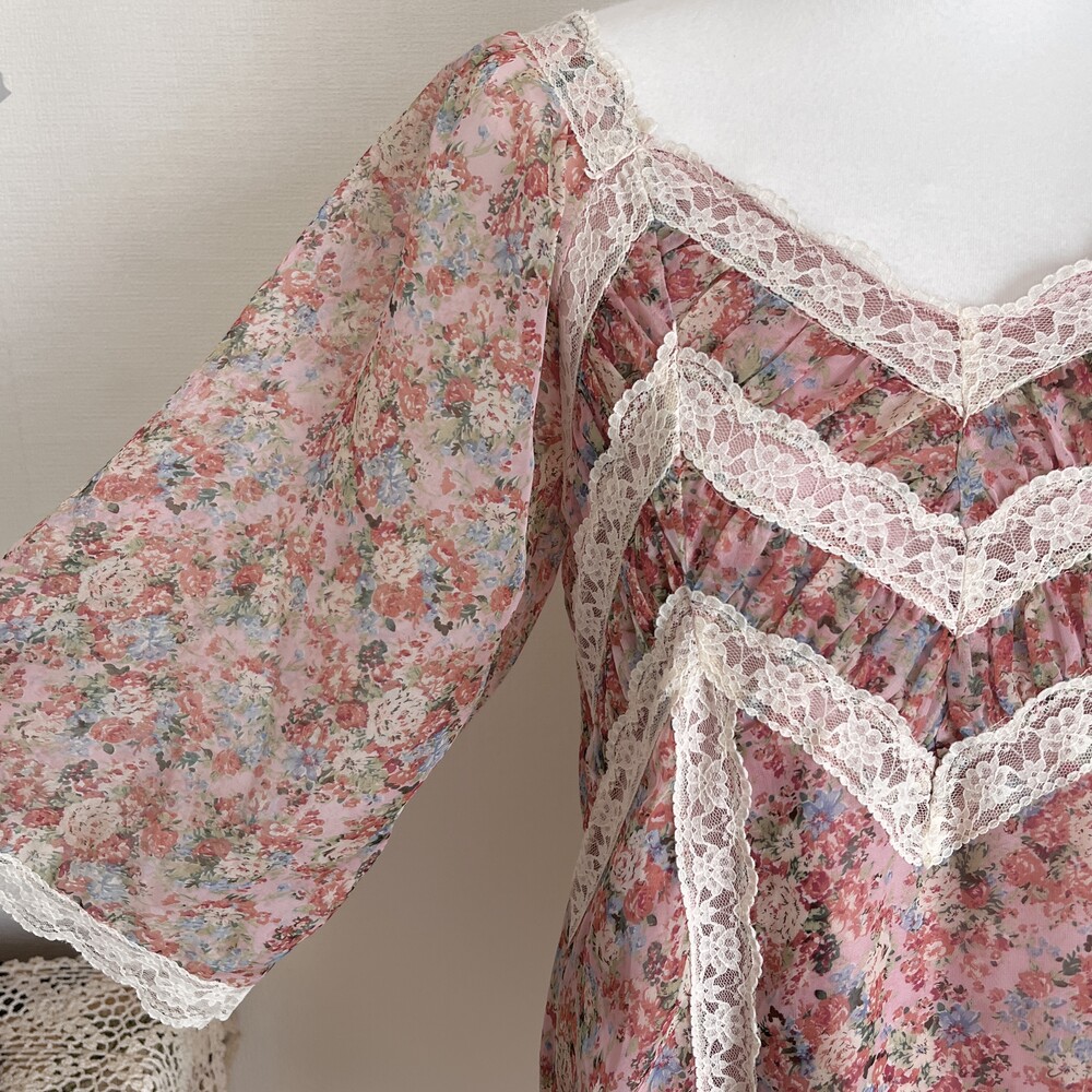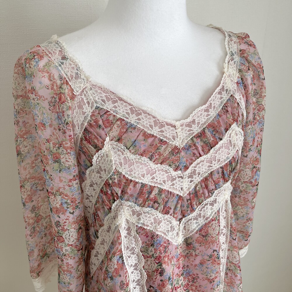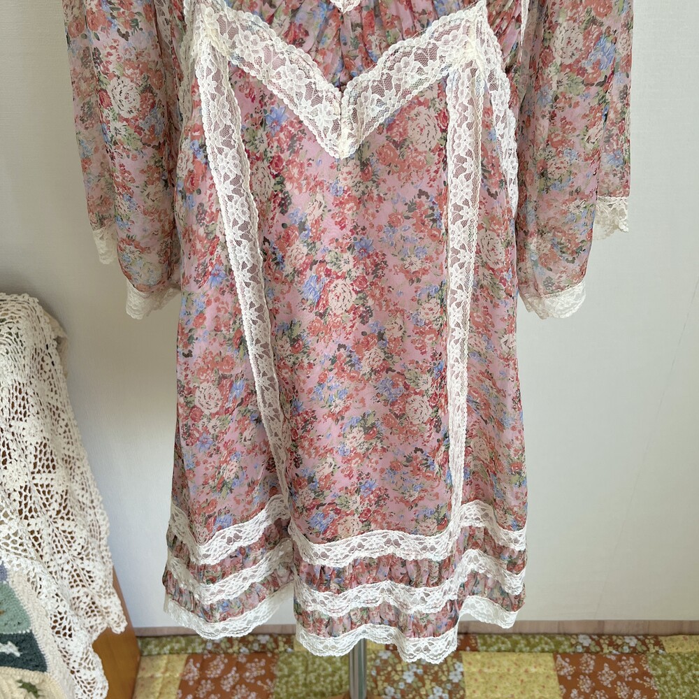 핑크 색감 베이스의 레이스 포인트 쉬폰 원피스예요