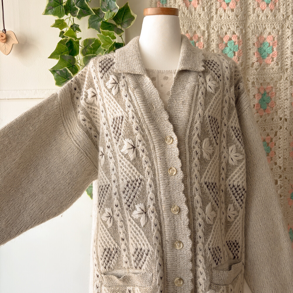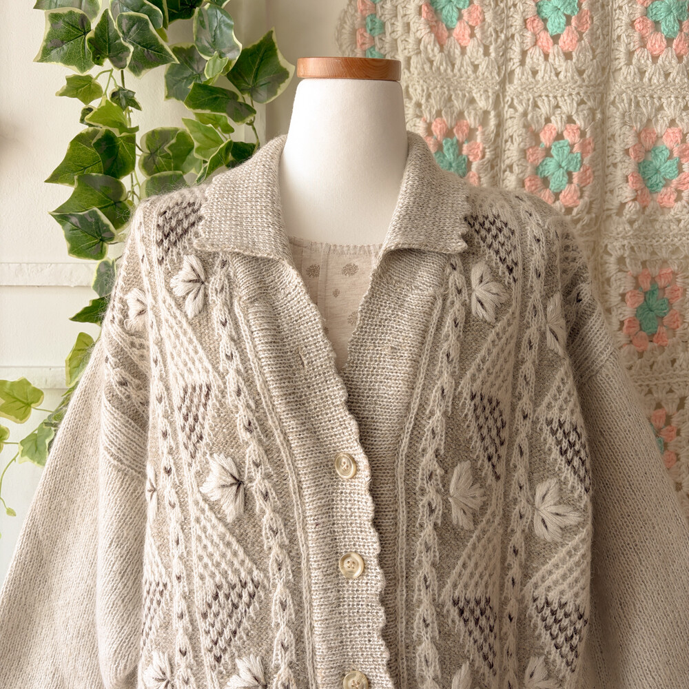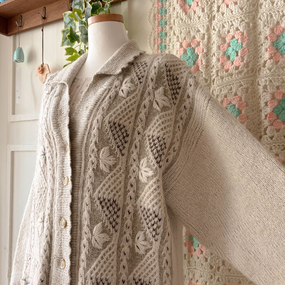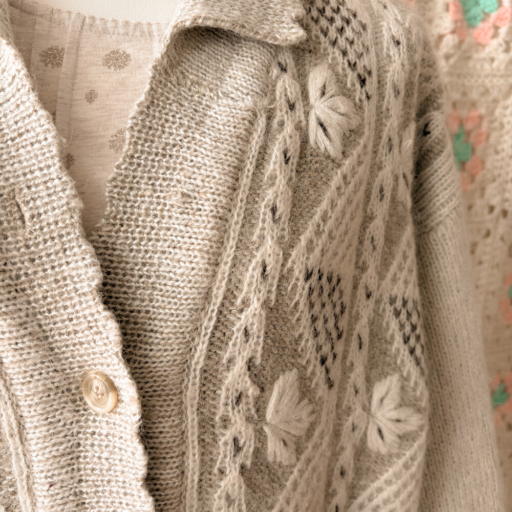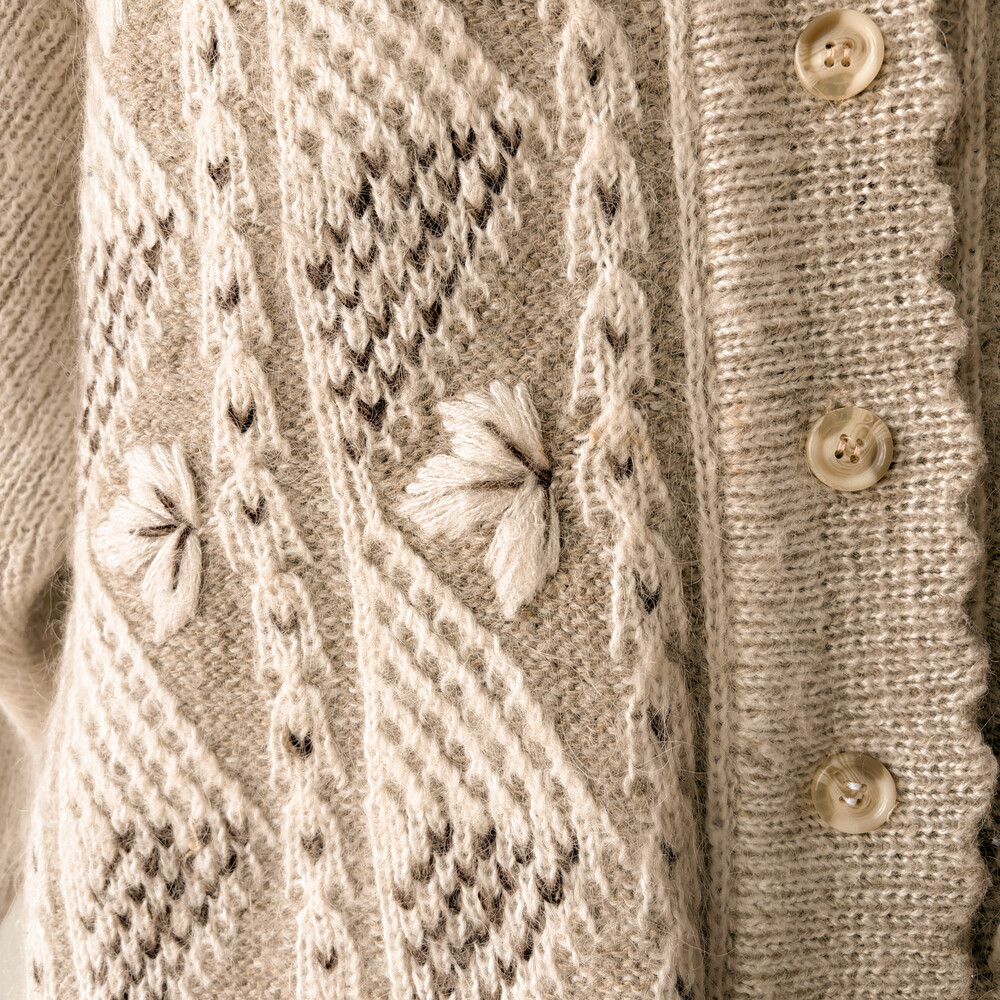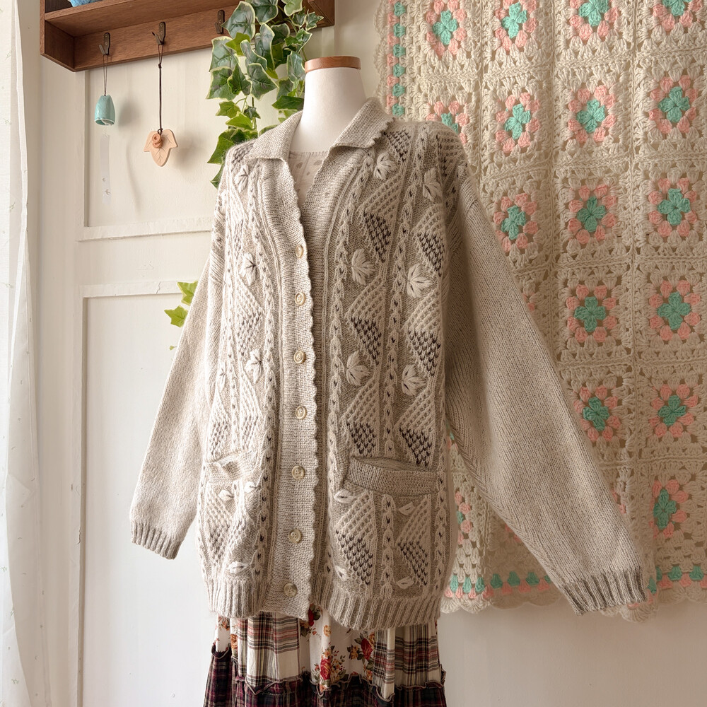 오트밀-아이보리 색감의 나뭇잎 자수 포인트의 카라 가디건이에요