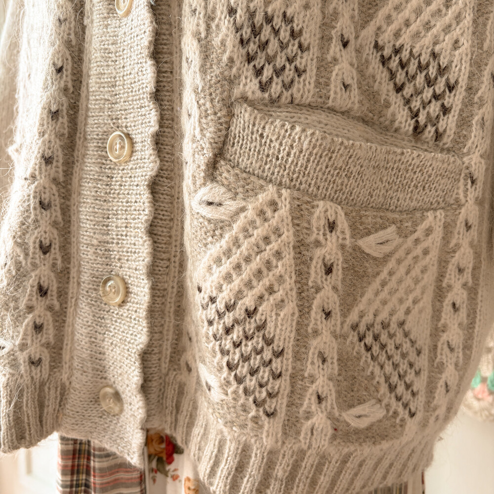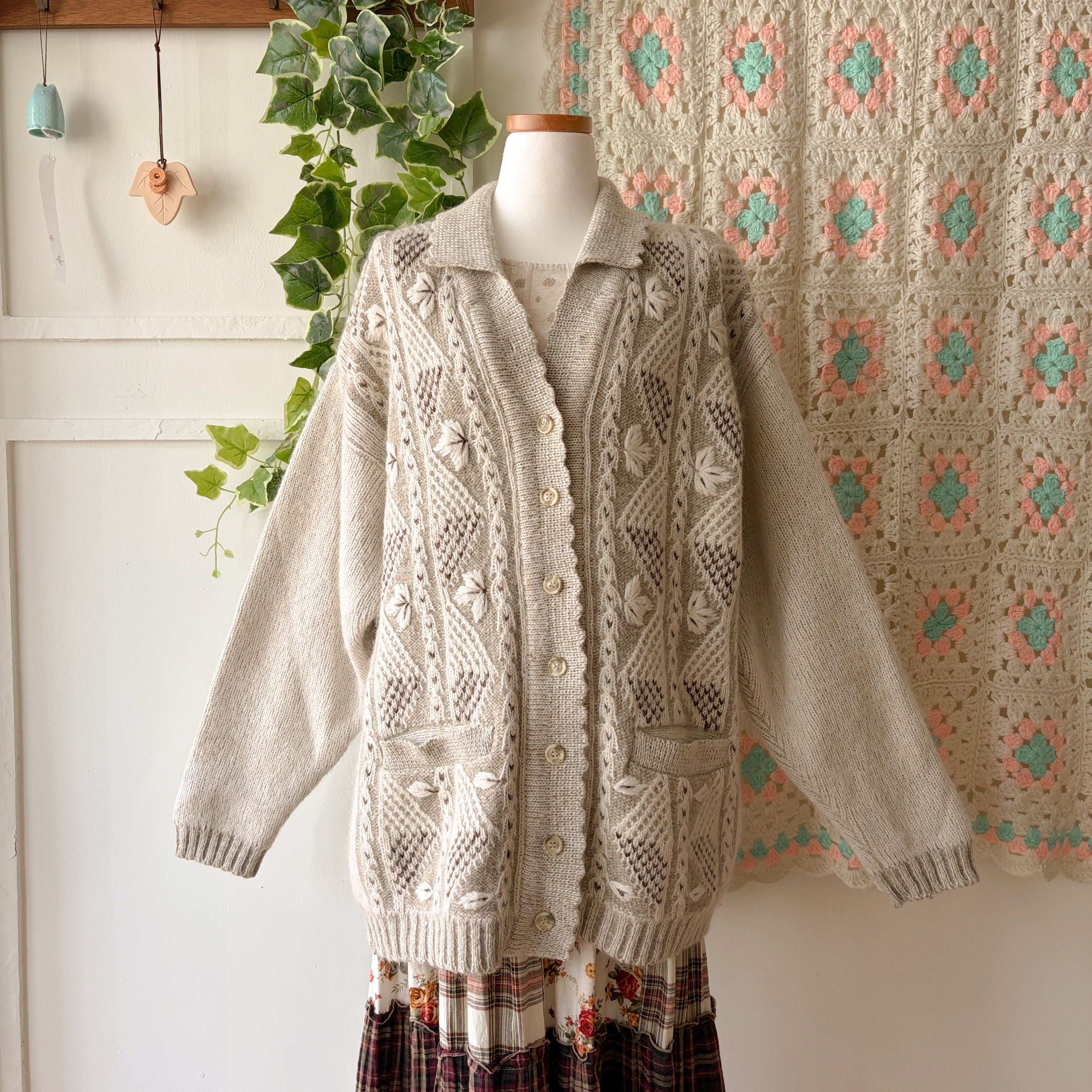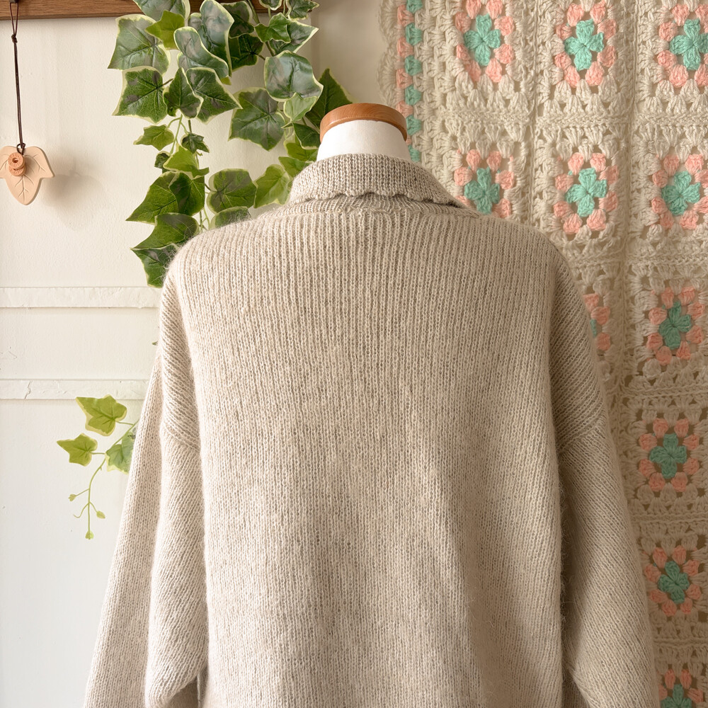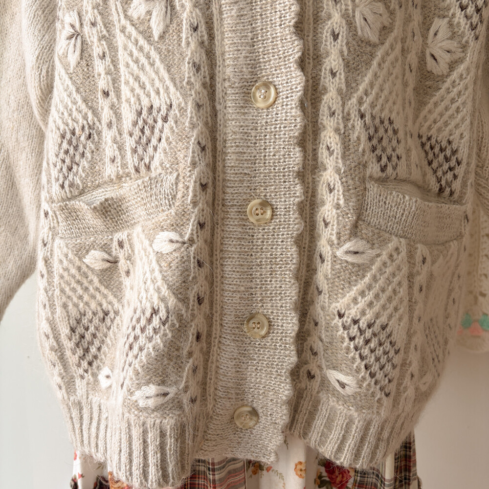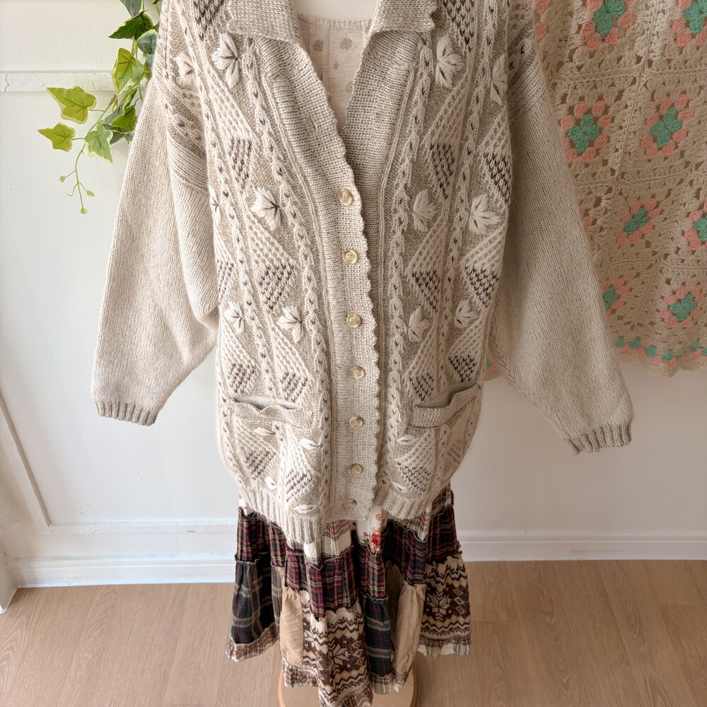 오트밀-아이보리 색감의 나뭇잎 자수 포인트의 카라 가디건이에요