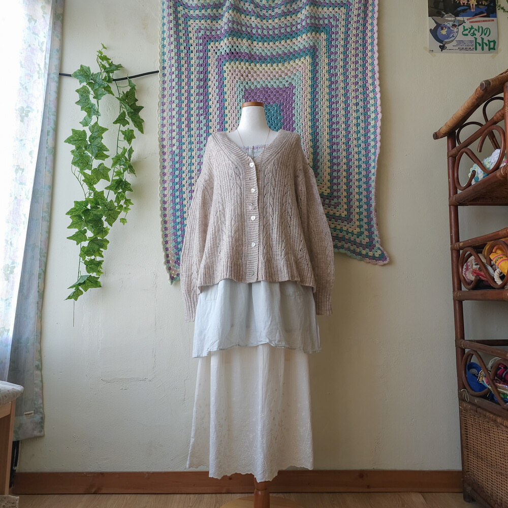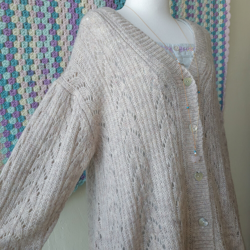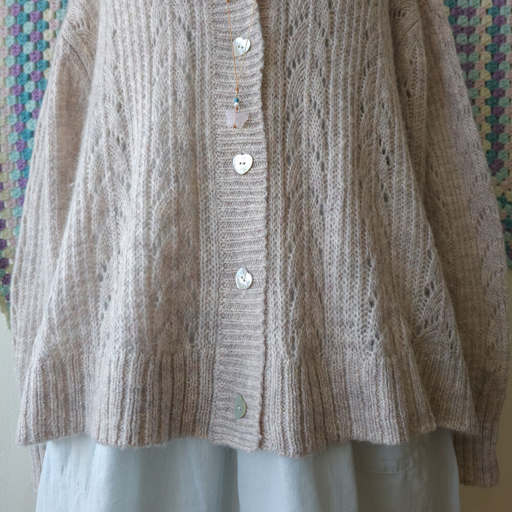 아이보리와 연보라가 믹스된 색감의 니트 가디건이에요