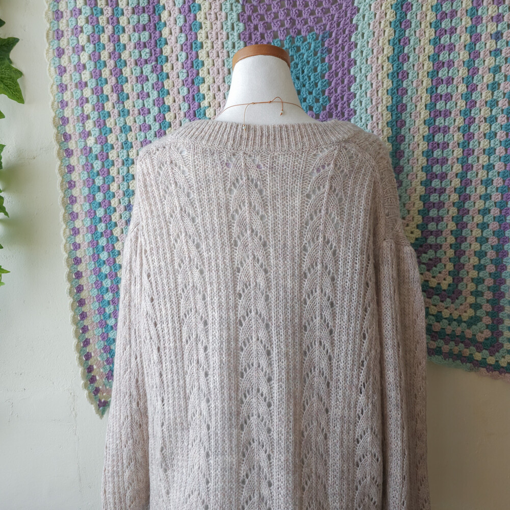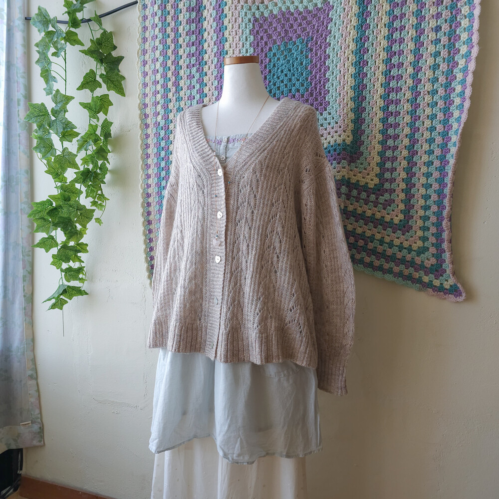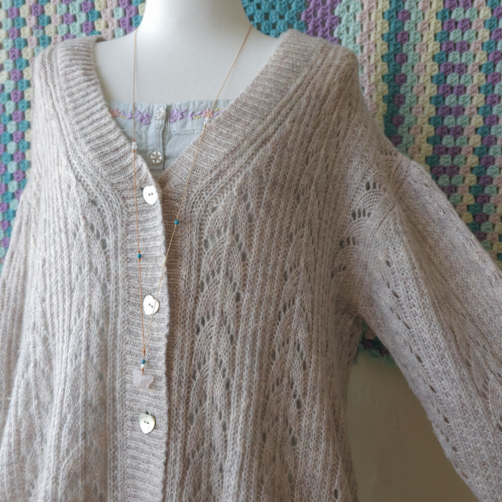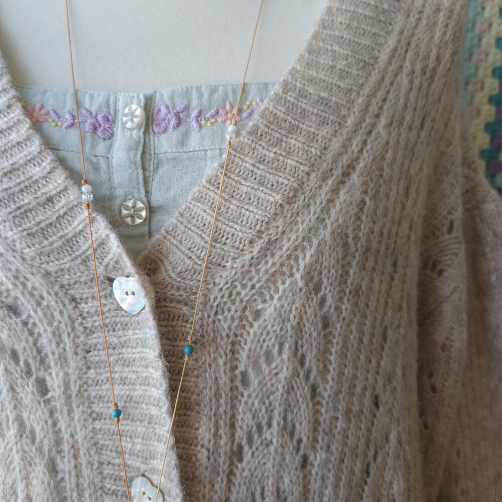 아이보리와 연보라가 믹스된 색감의 니트 가디건이에요