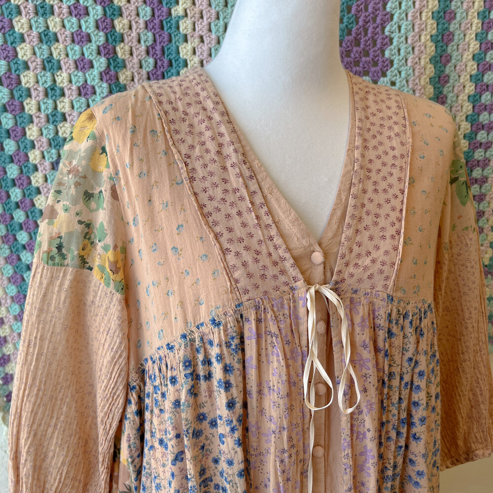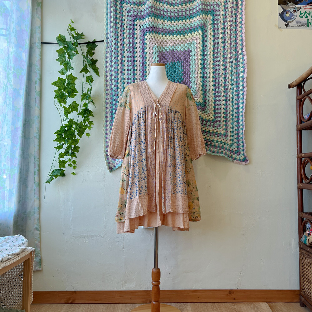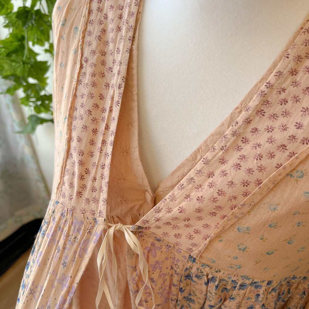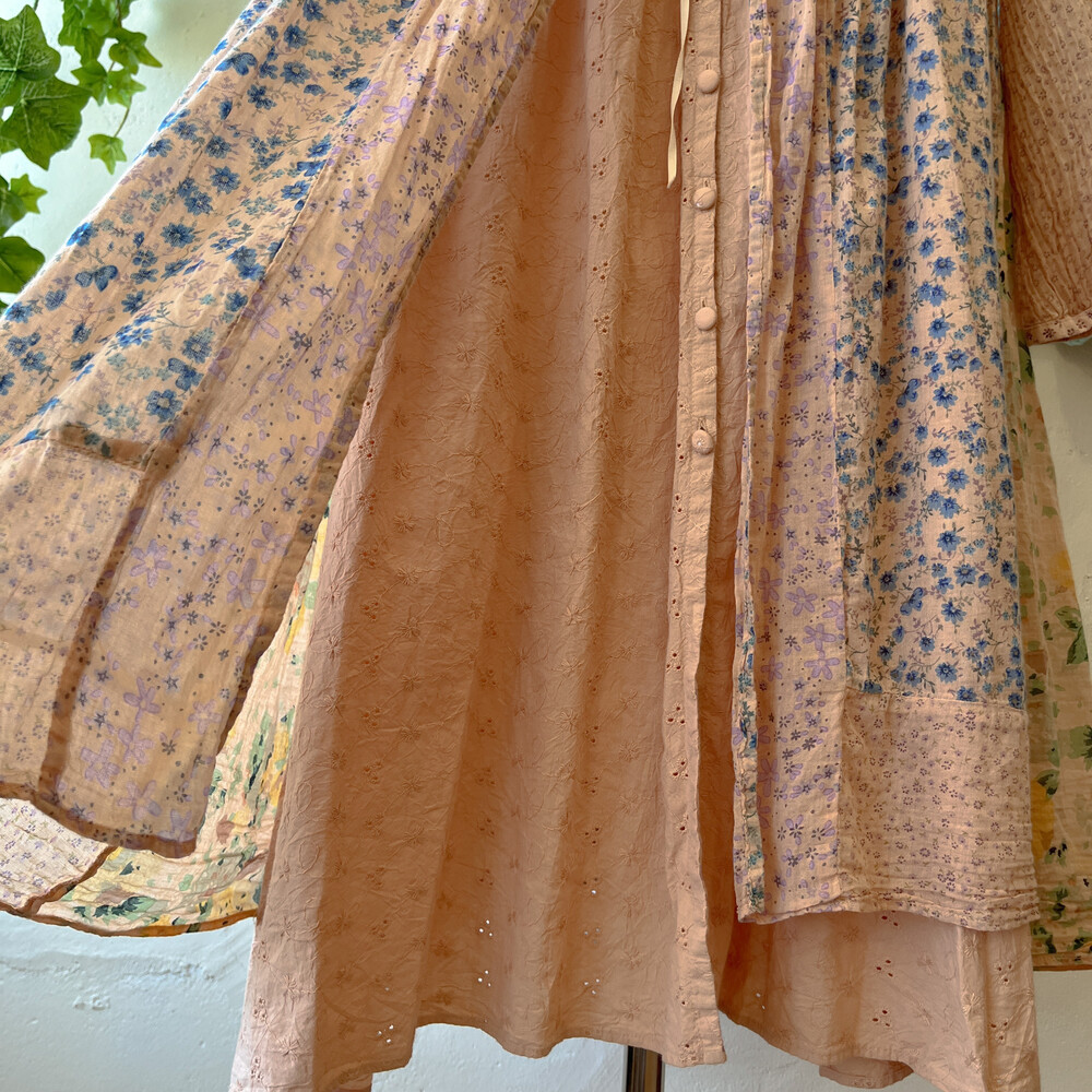 밝은 브라운 색(황토색)의 패치워크 코튼 바선생 원피스예요