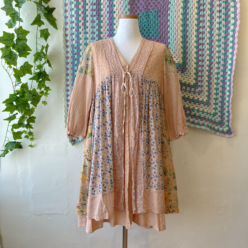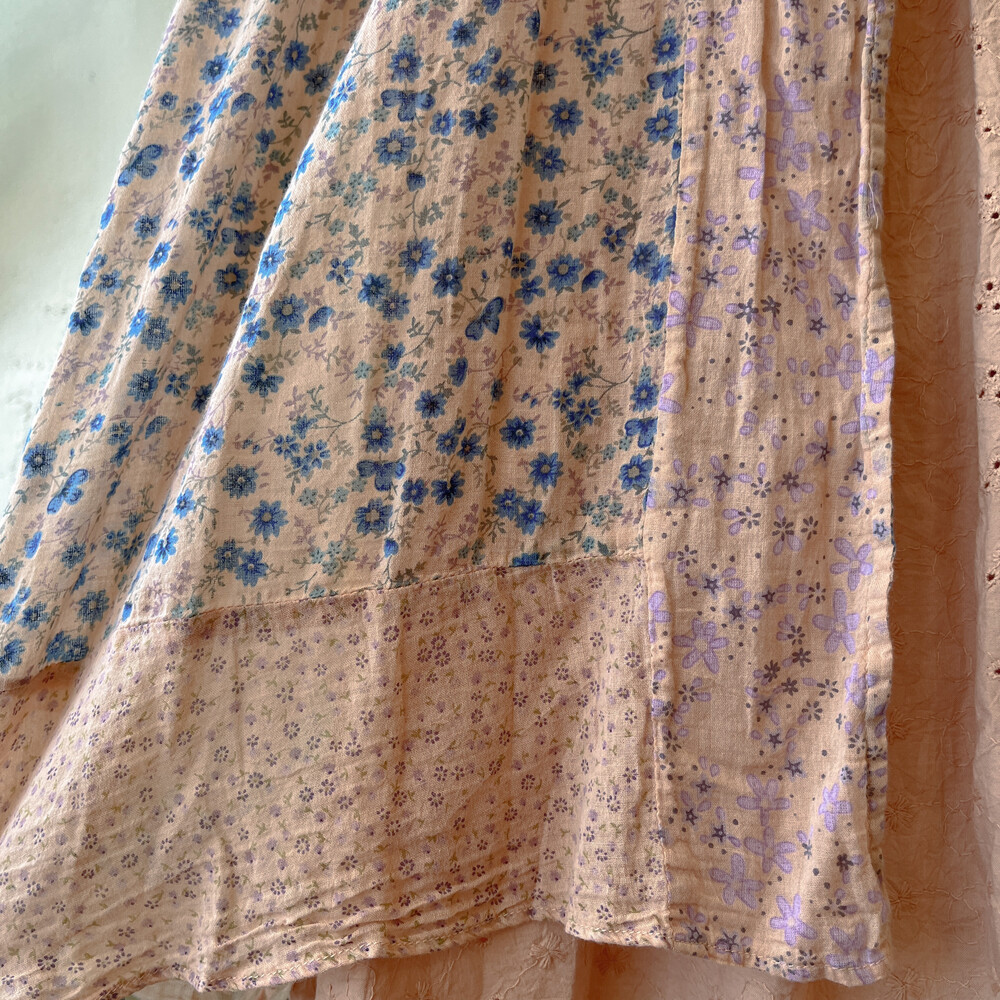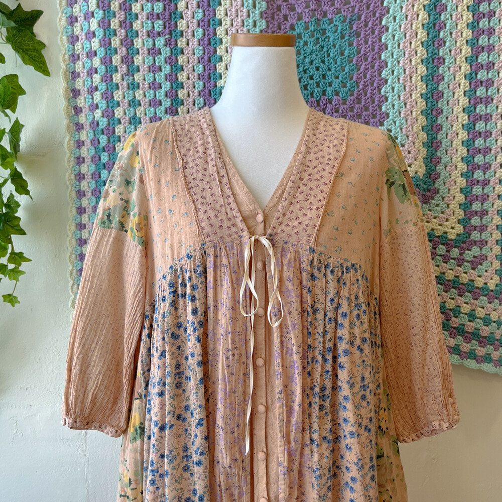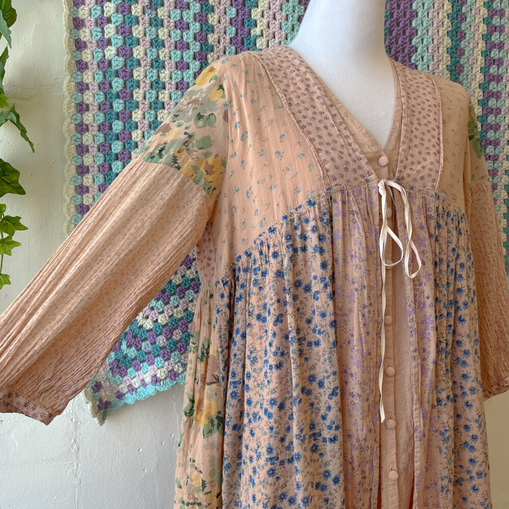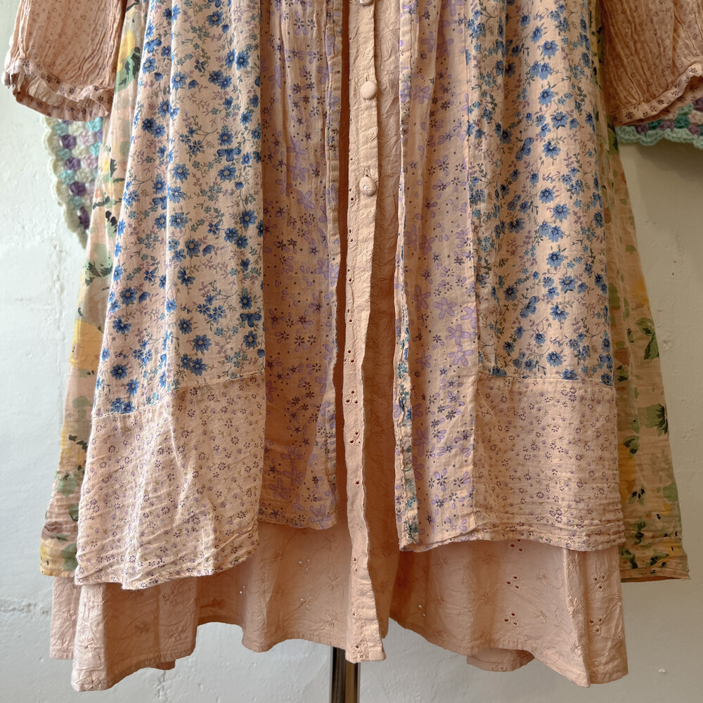 밝은 브라운 색(황토색)의 패치워크 코튼 바선생 원피스예요