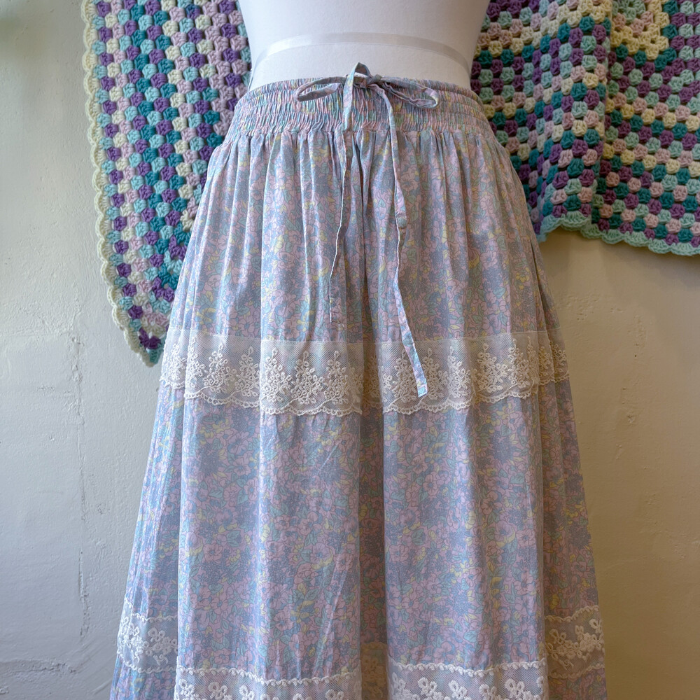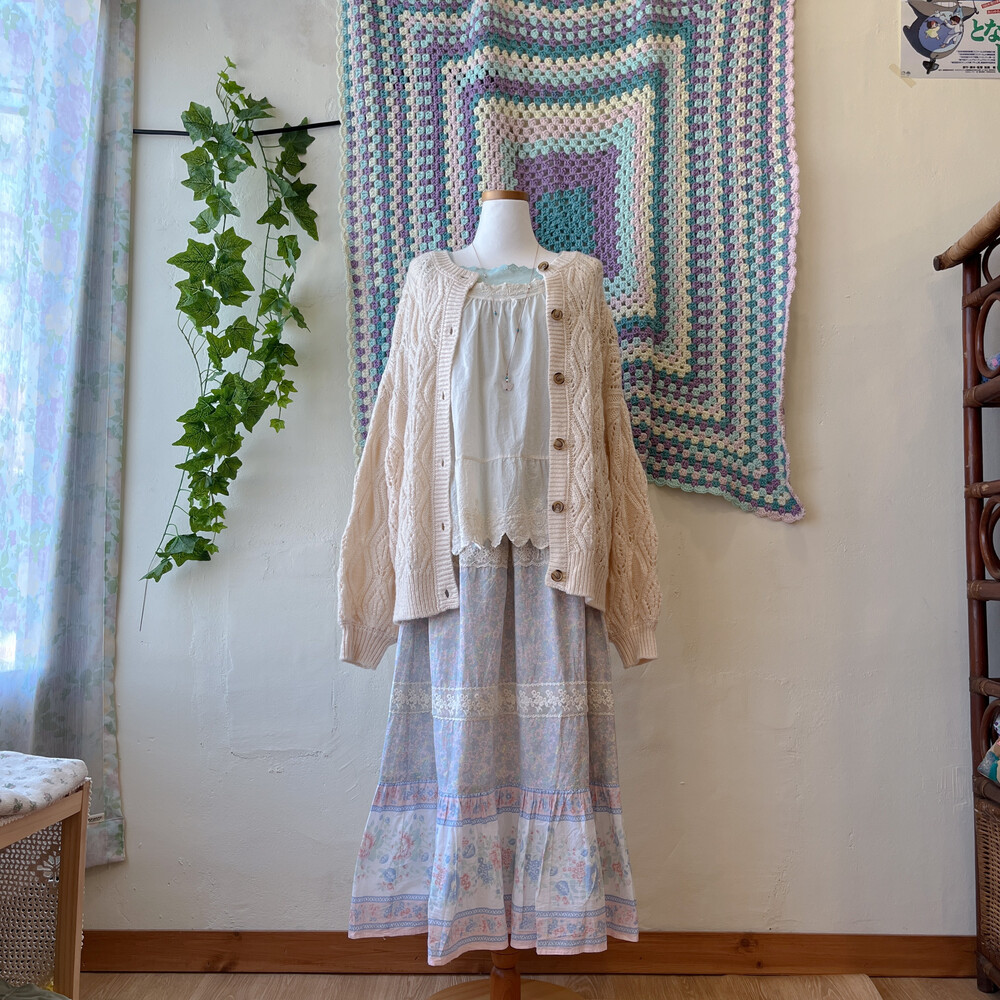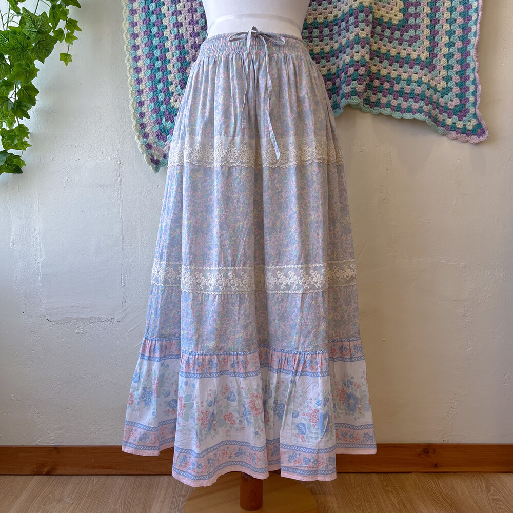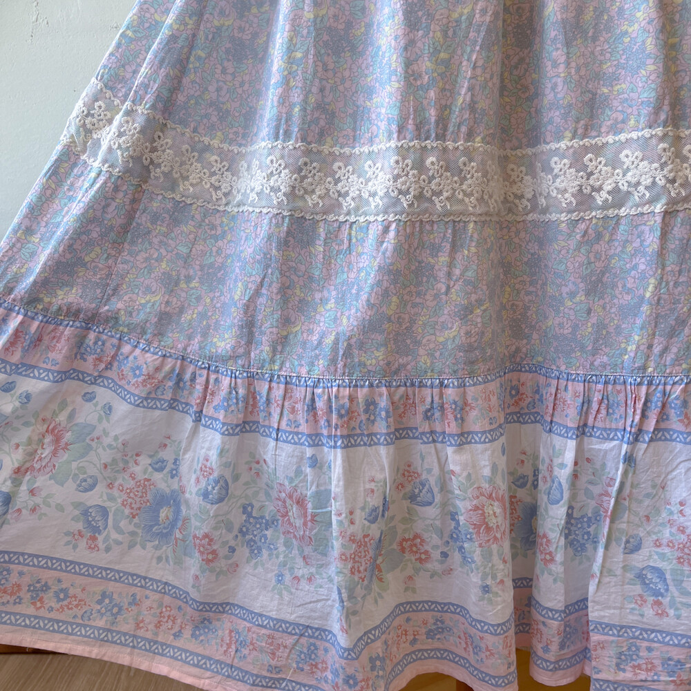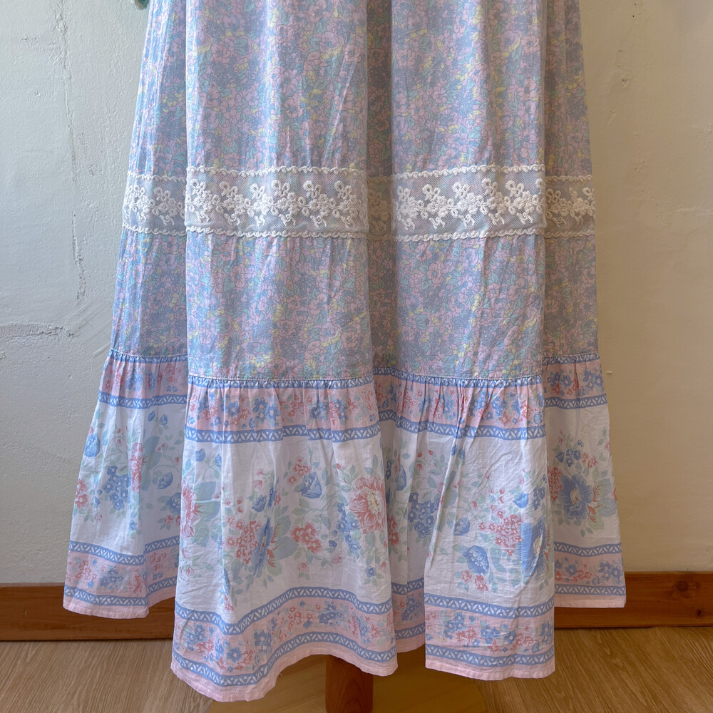 파스텔 색감의 블루, 핑크, 레몬 꽃무늬가 조합된 스커트예요