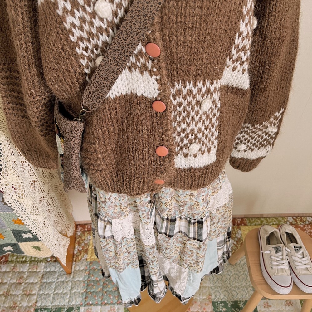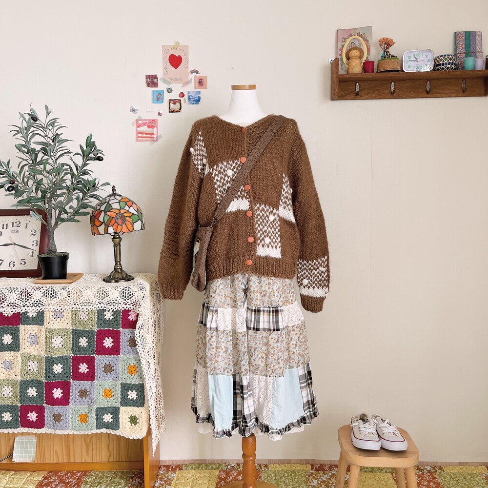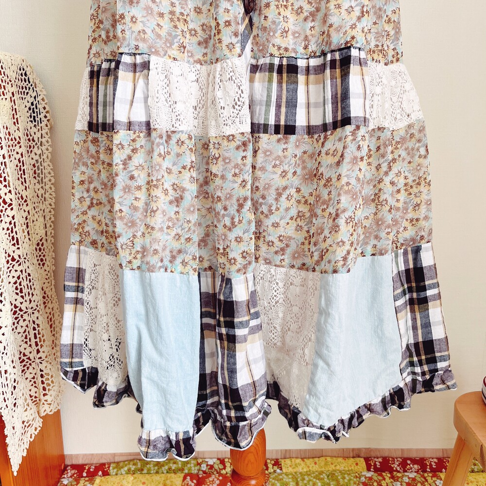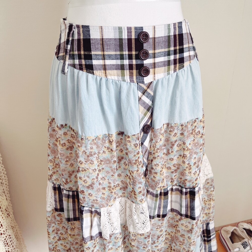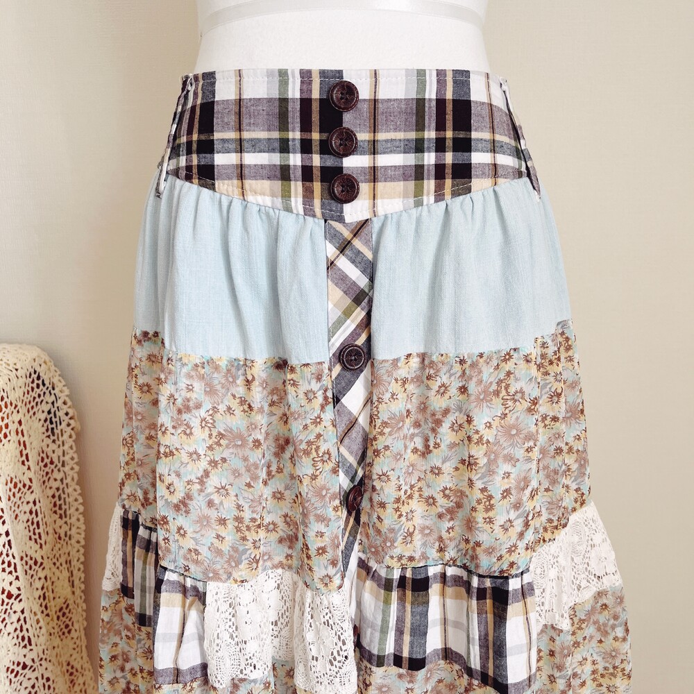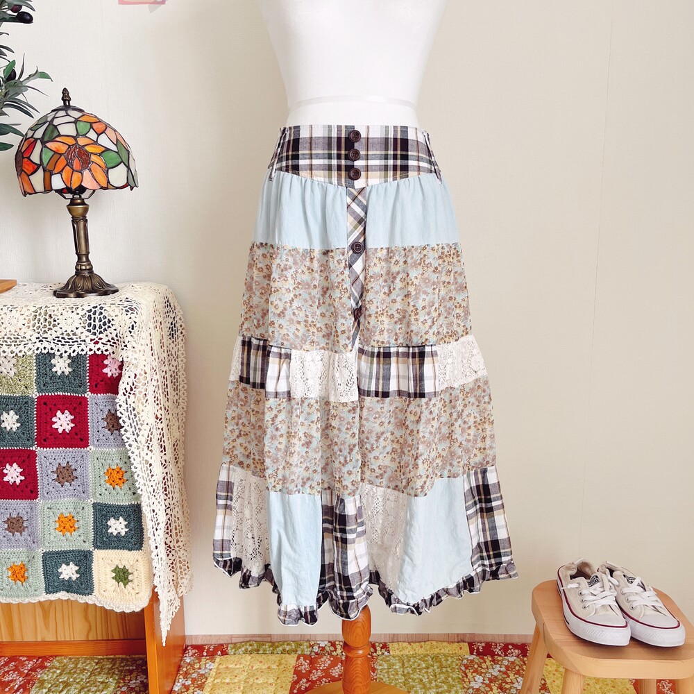 하늘색과 브라운 색감 베이스의 패치 스커트예요