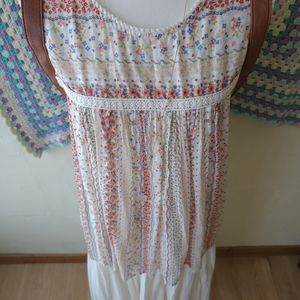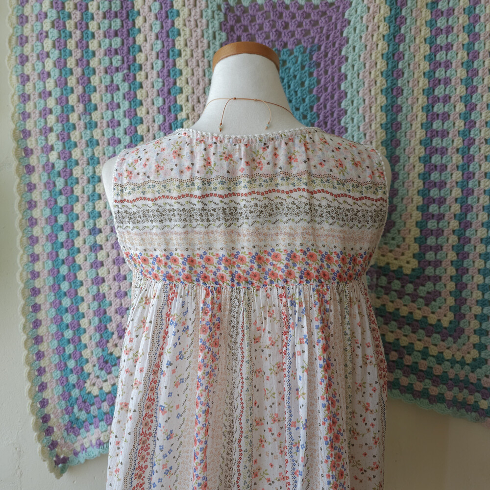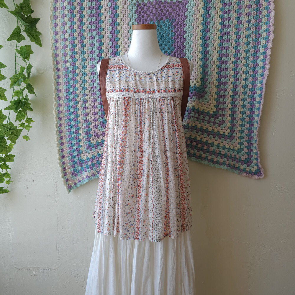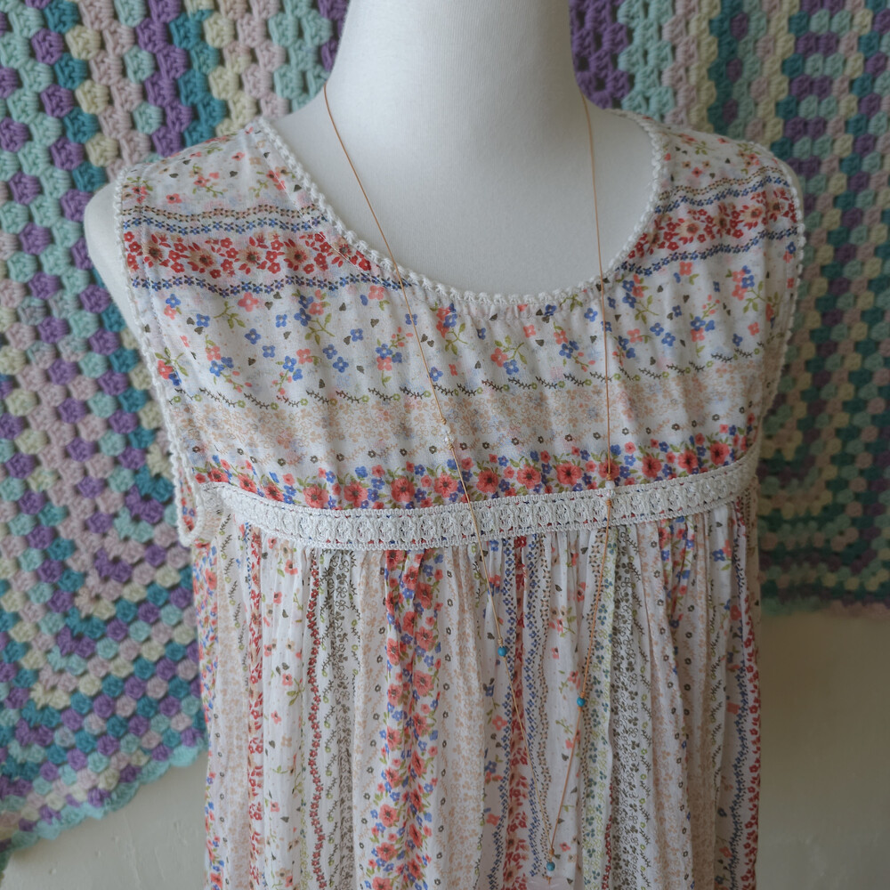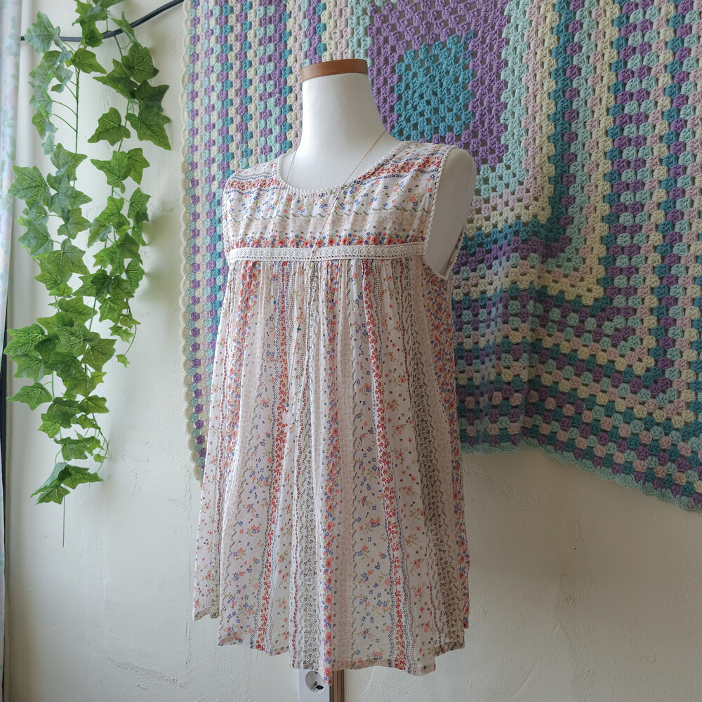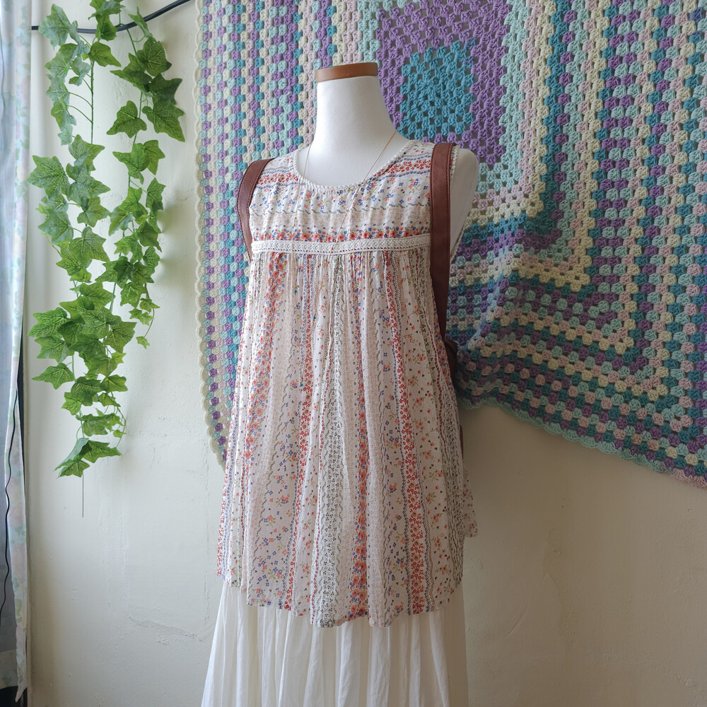 다홍, 그린 잔꽃 패턴의 민소매 블라우스예요