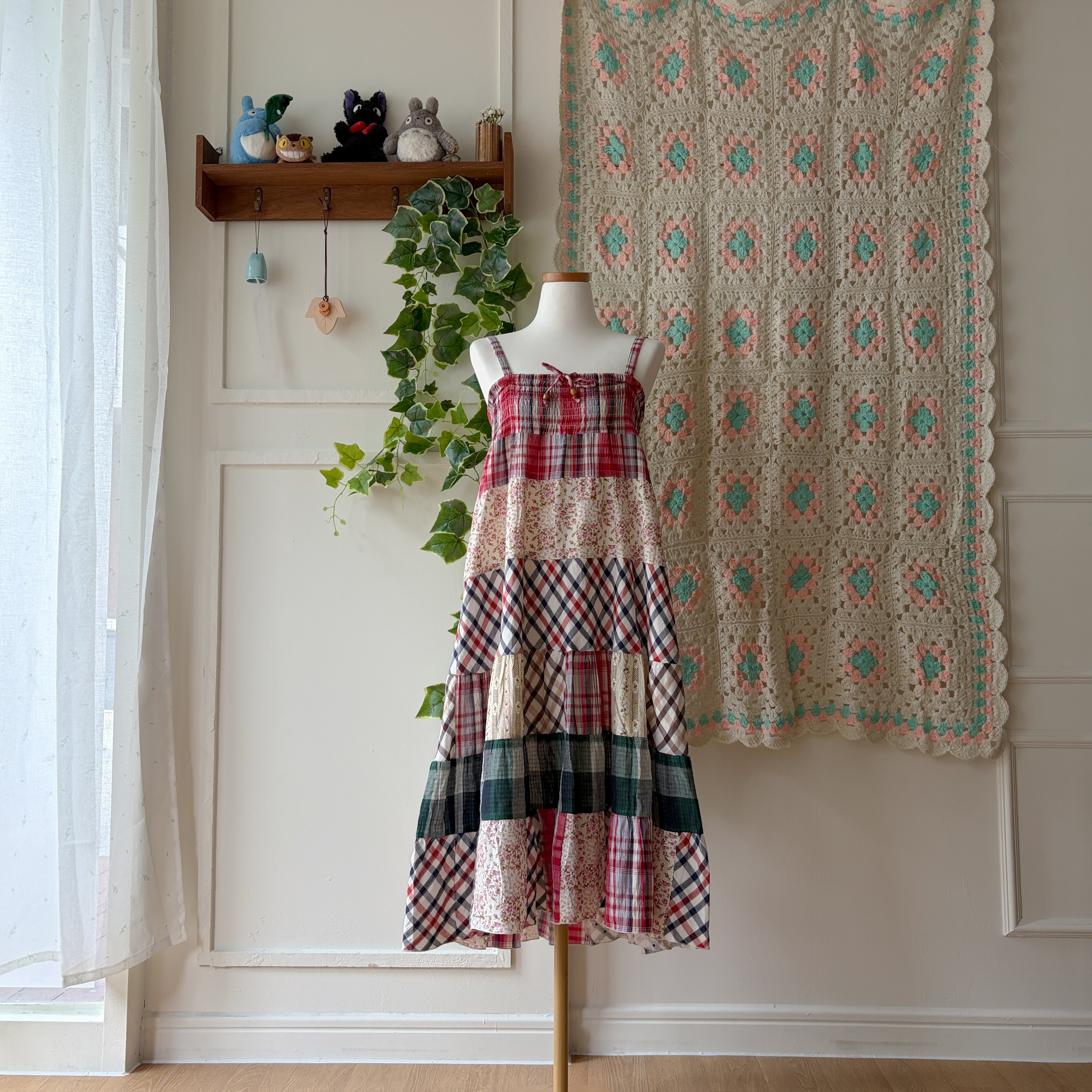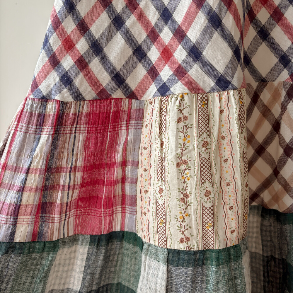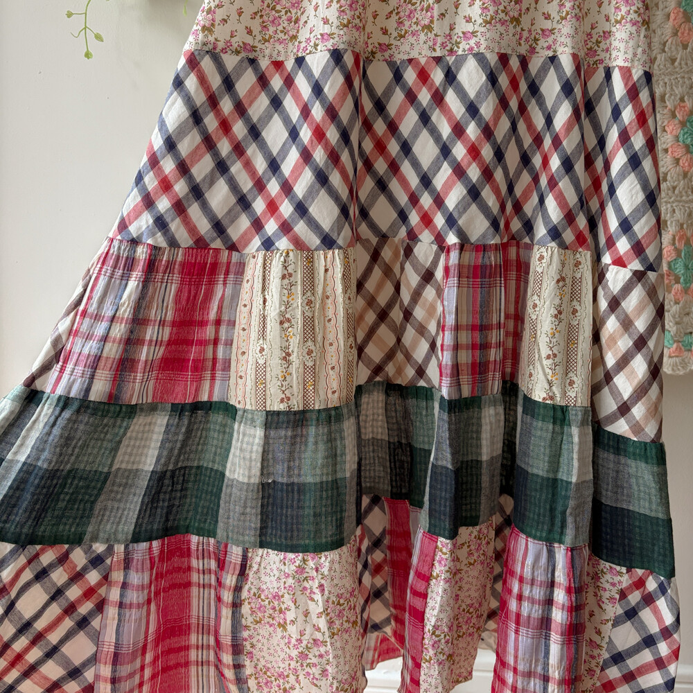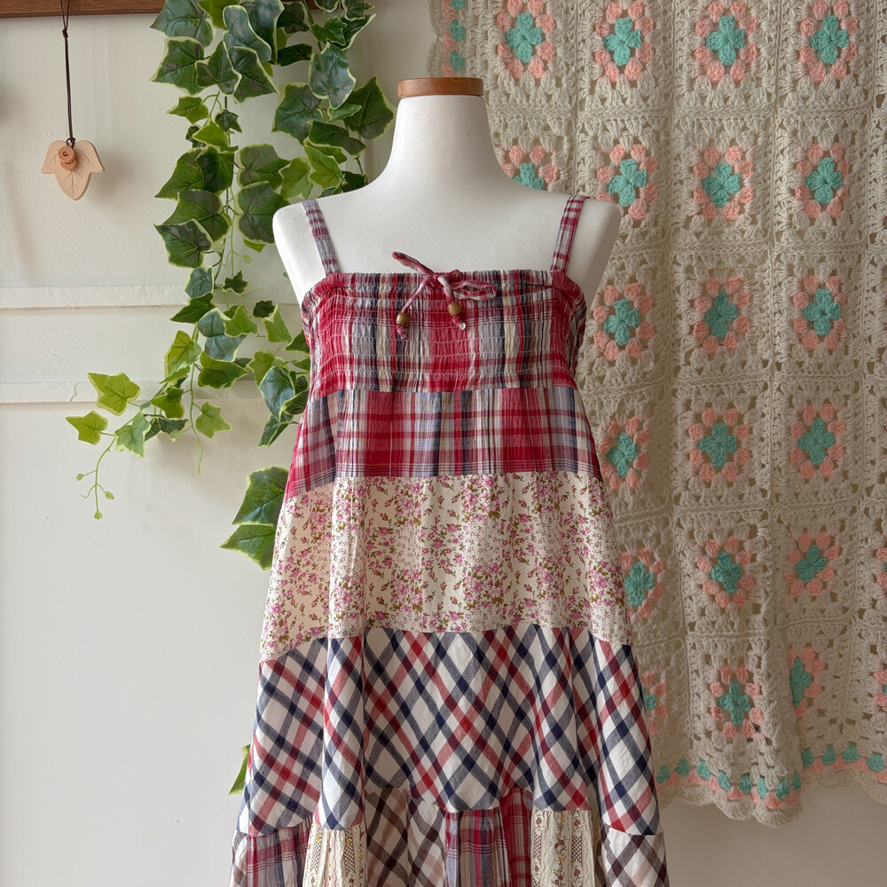 체크, 꽃무늬 등 조합의 패치 끈원피스예요