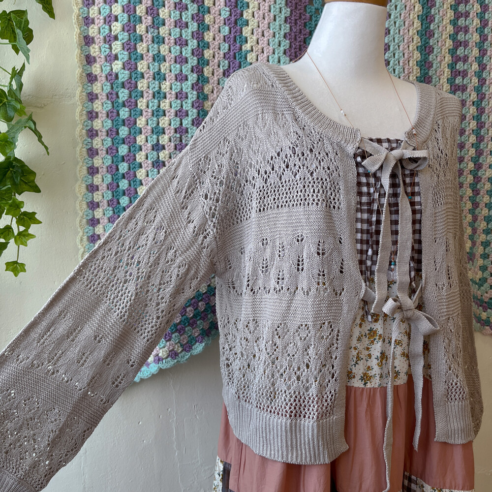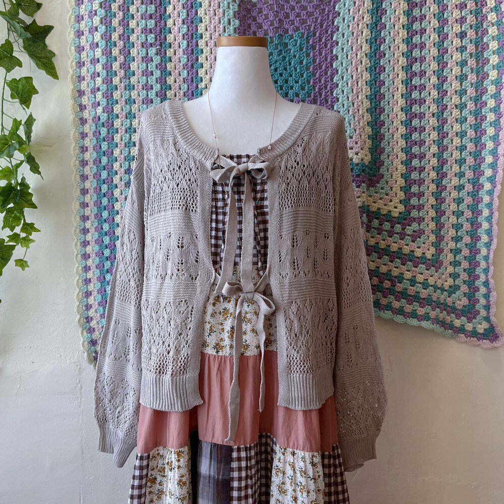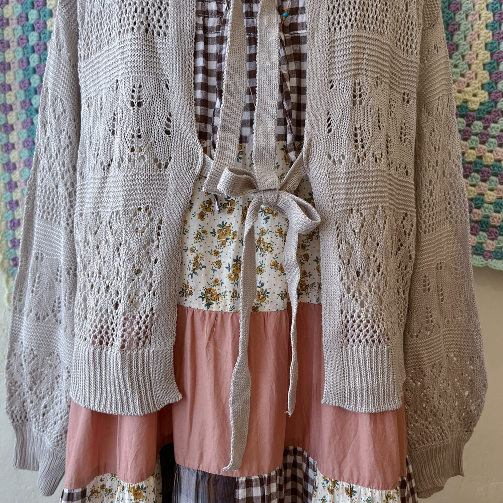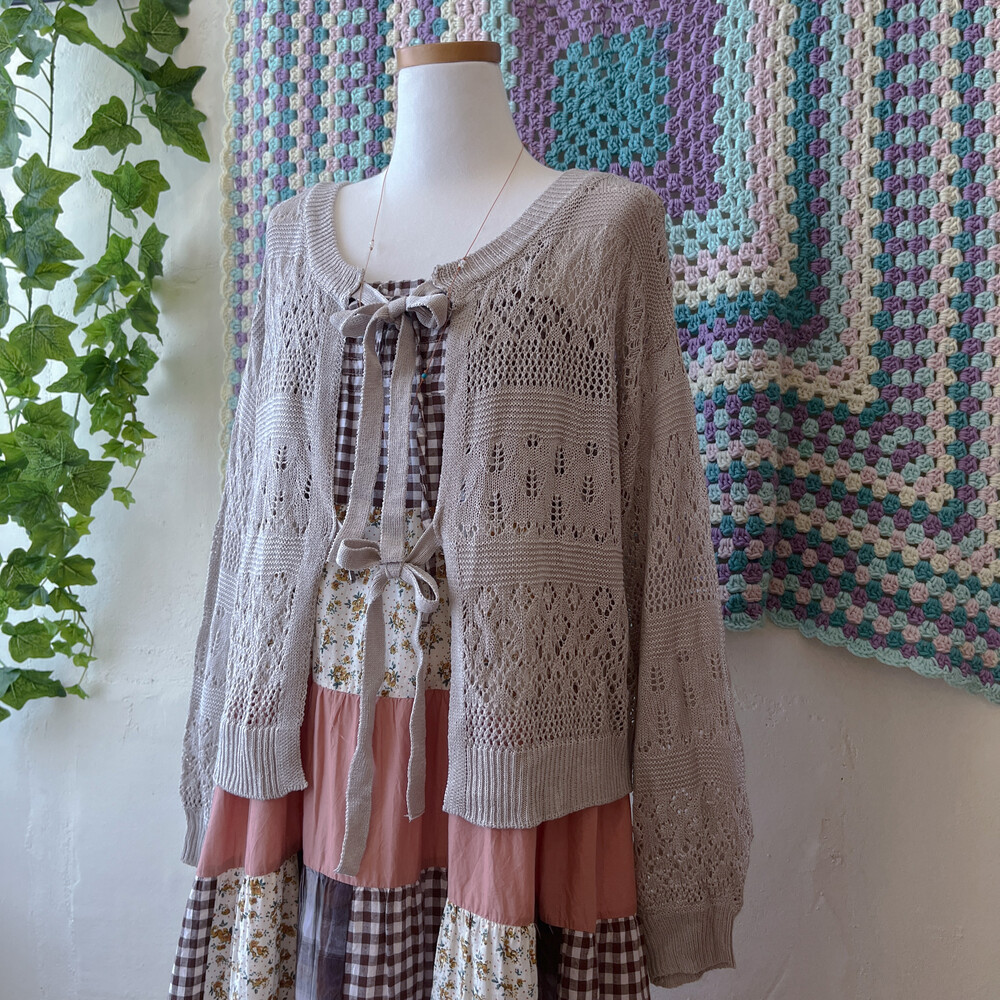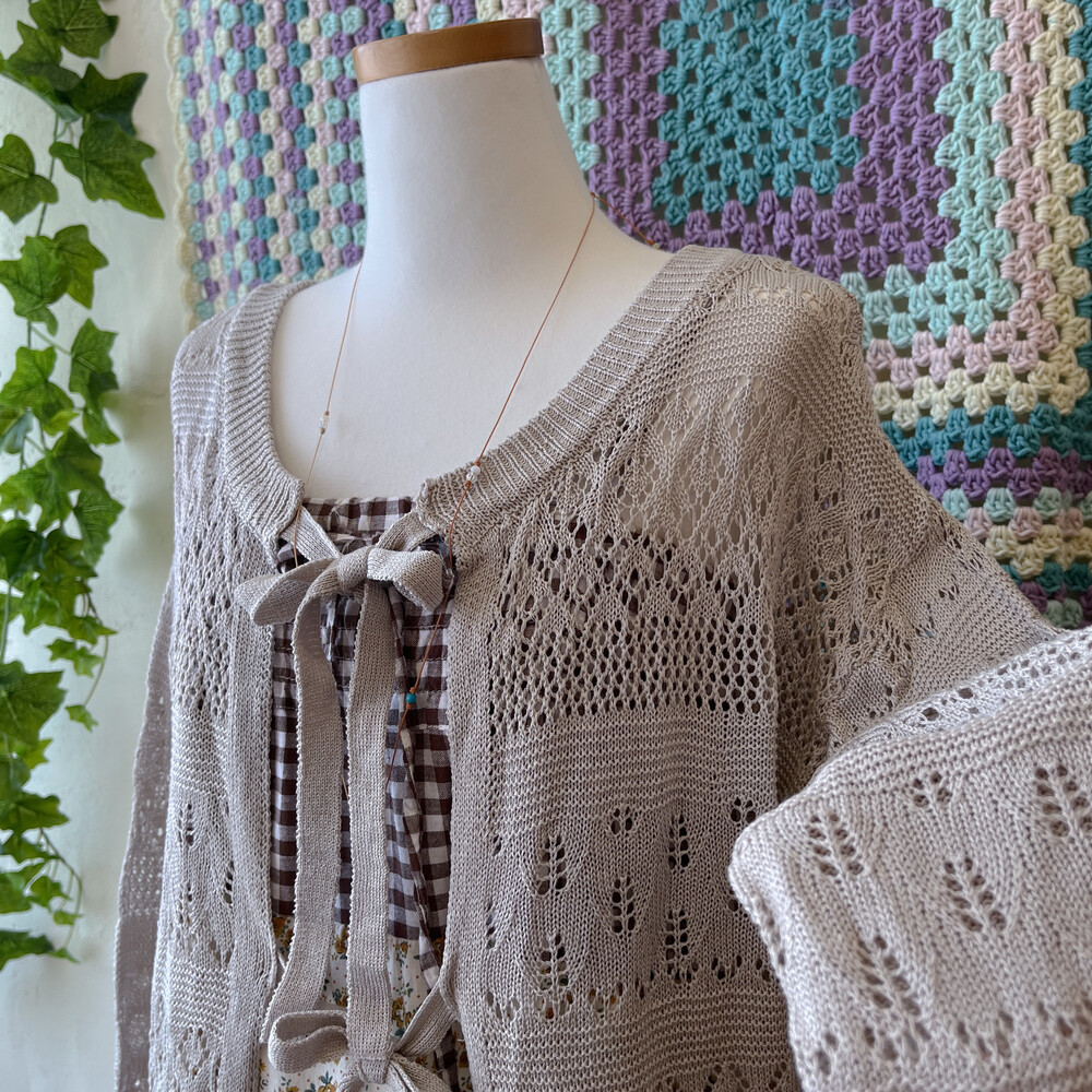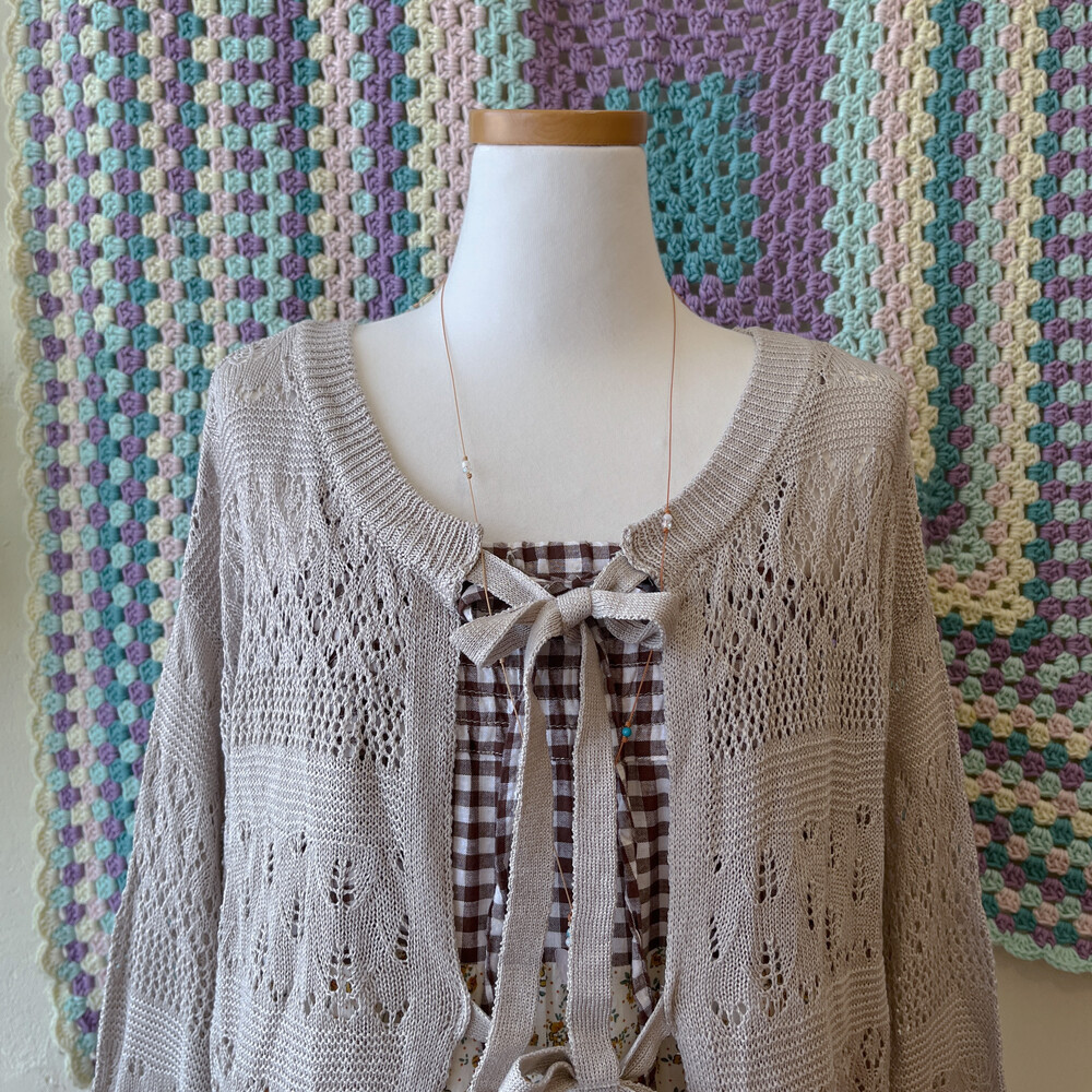 오트밀 색감의 리본 펀칭 가디건이에요
