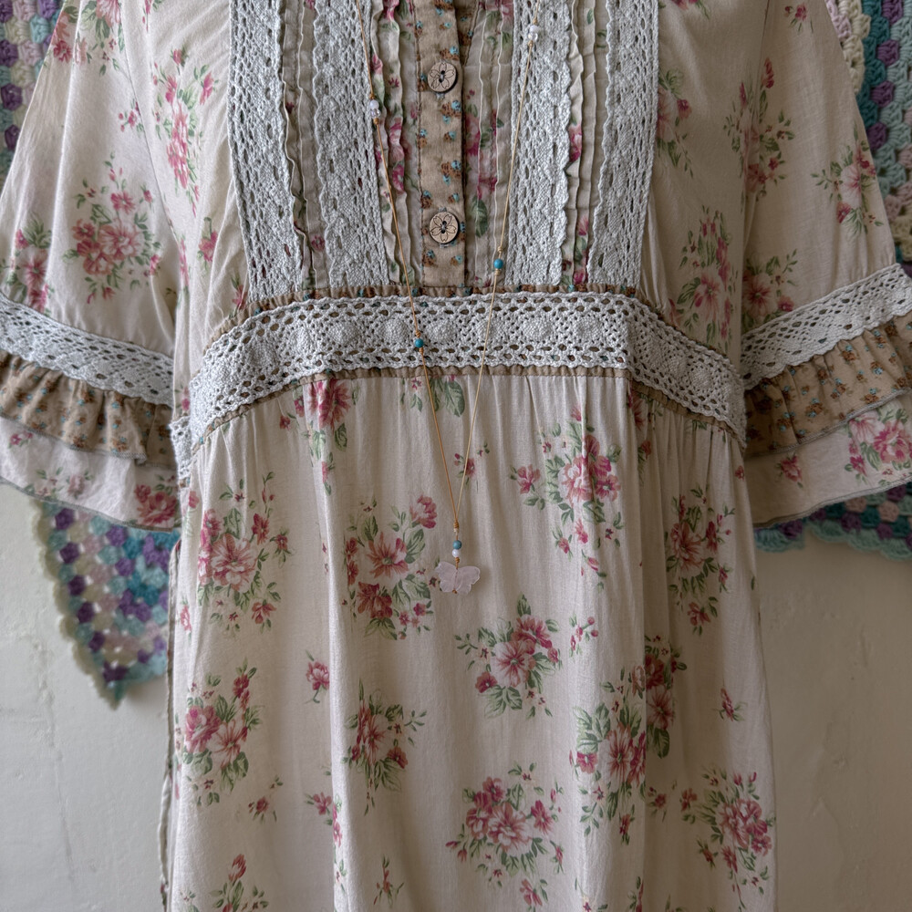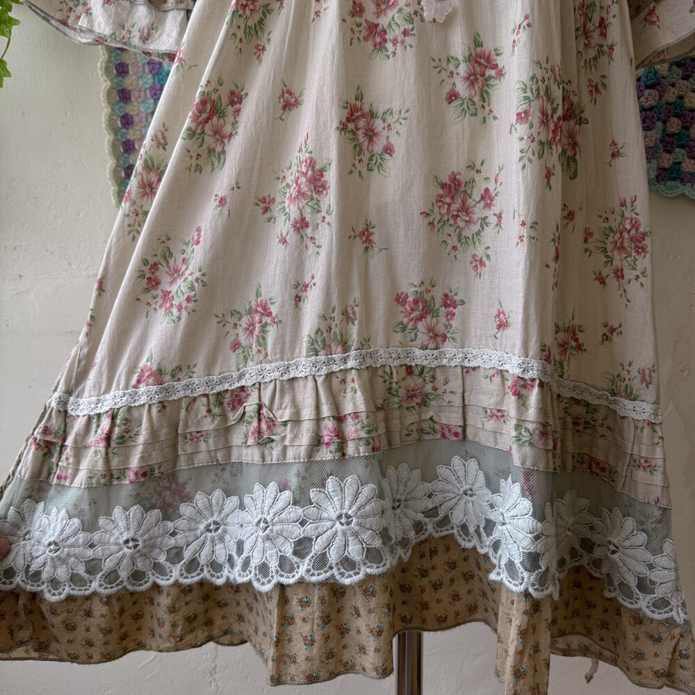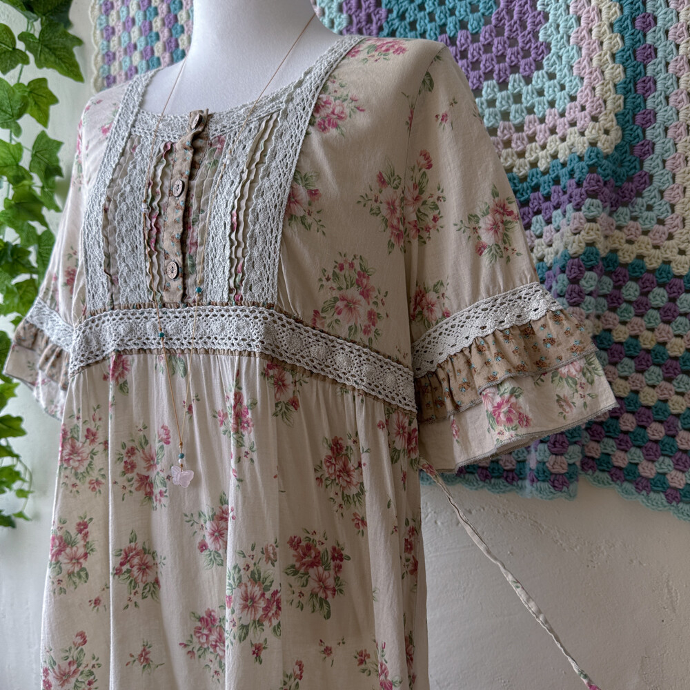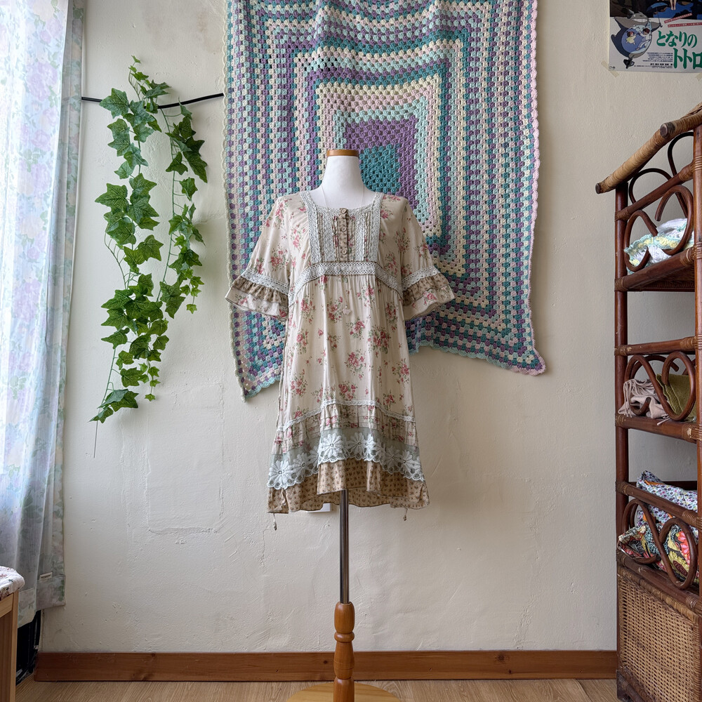 베이지 색감에 핑크 꽃무늬가 들어간 원피스예요