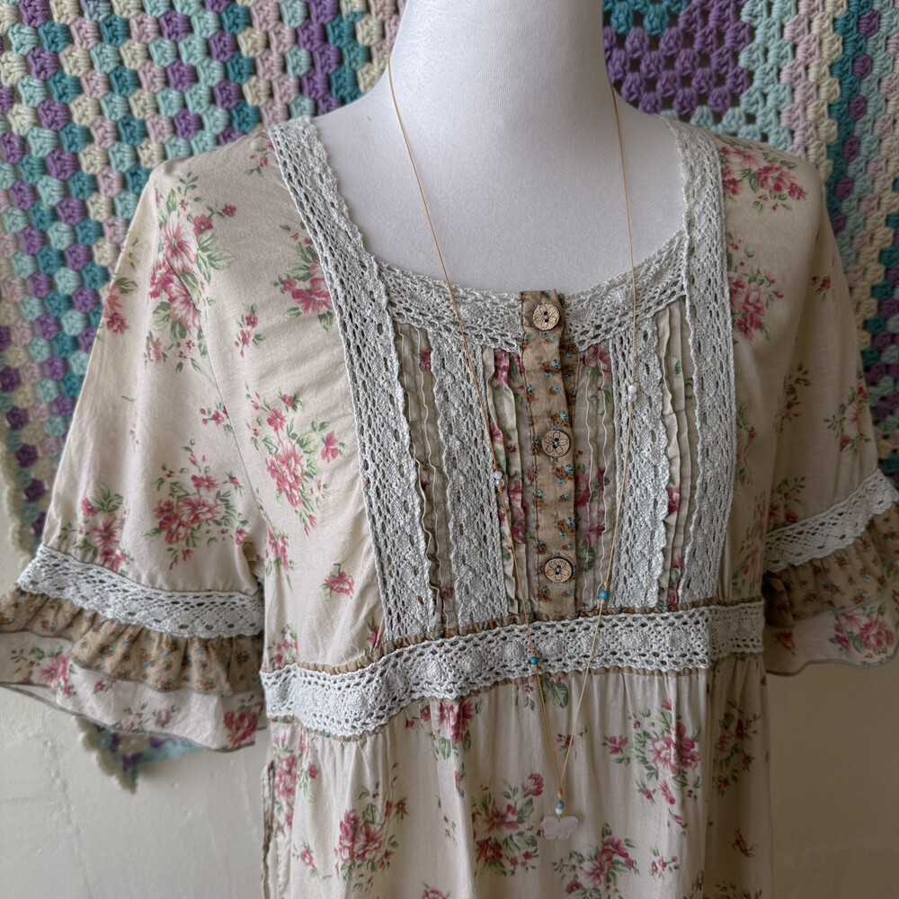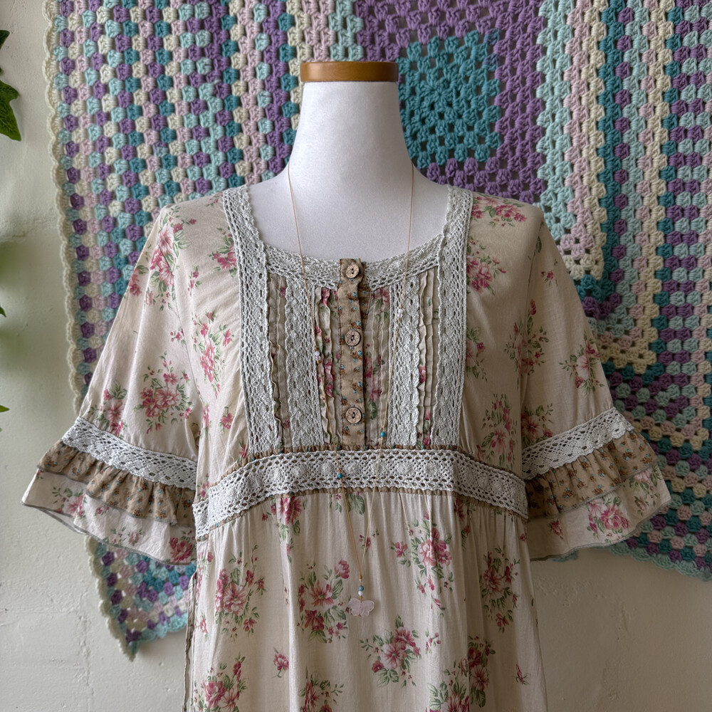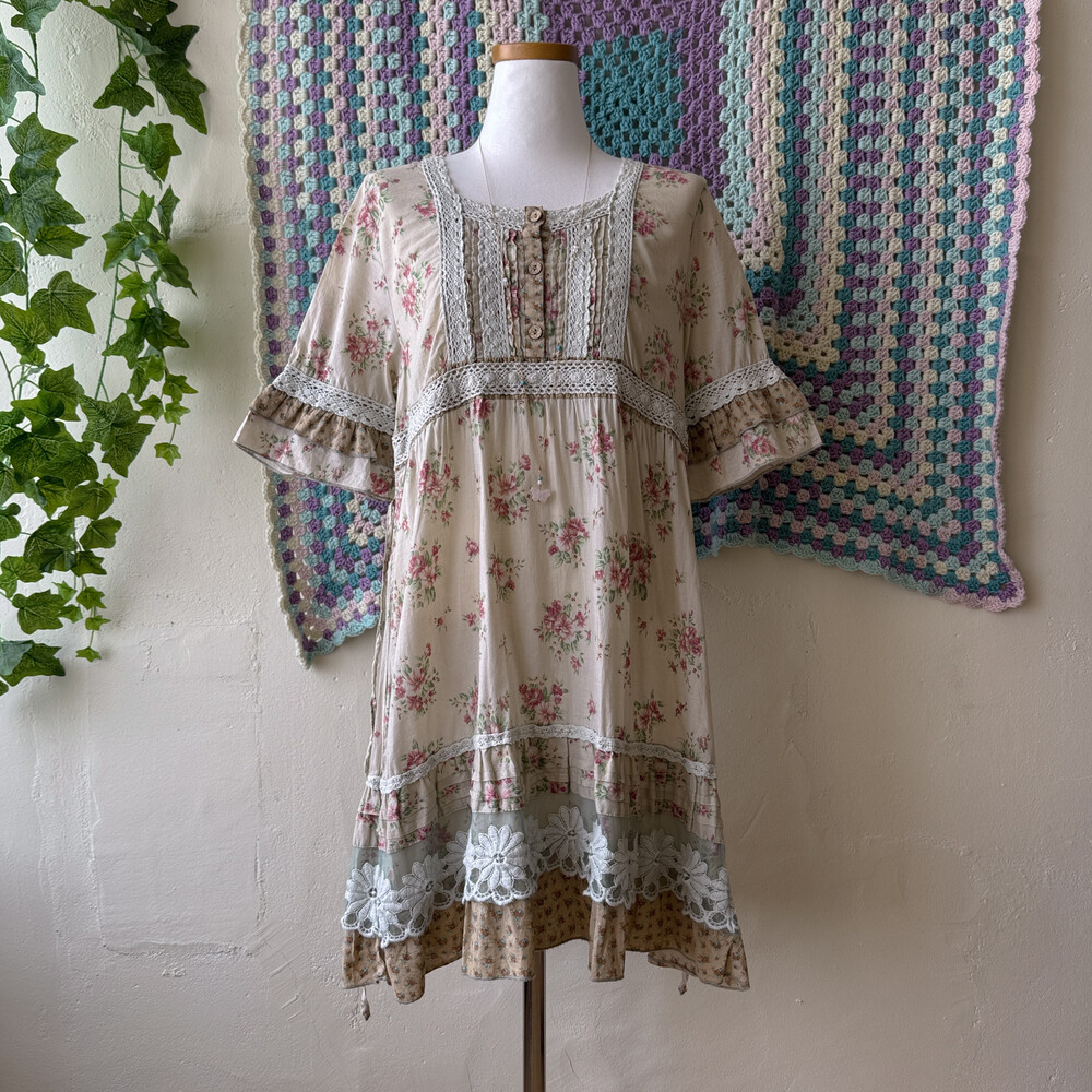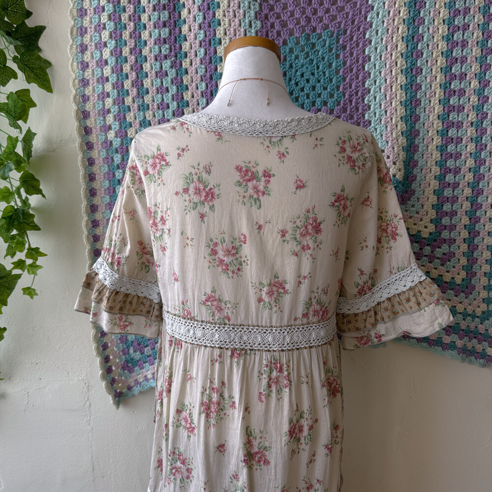베이지 색감에 핑크 꽃무늬가 들어간 원피스예요