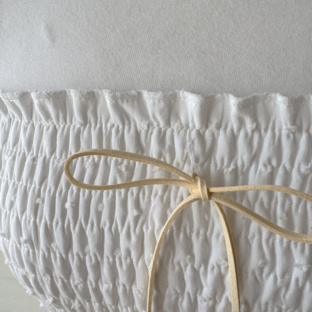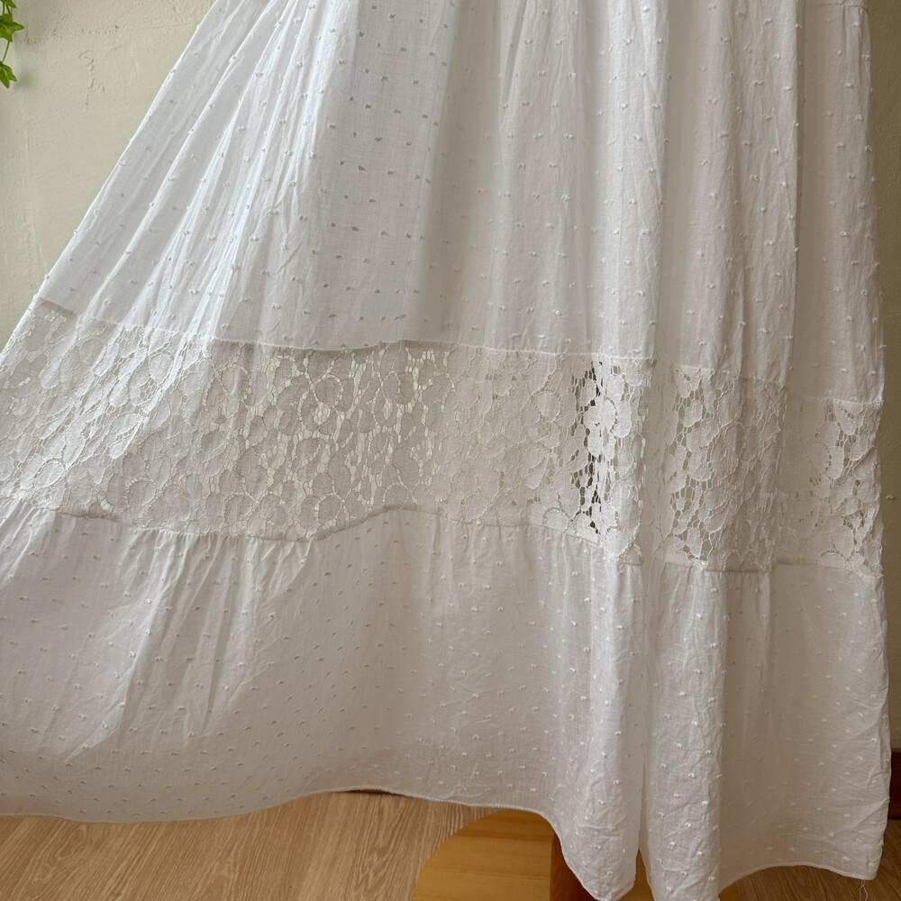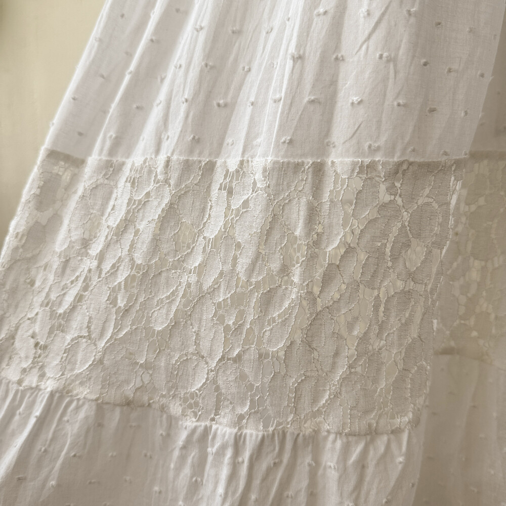 화이트 색감의 폼폼, 레이스 패치워크 끈원피스예요