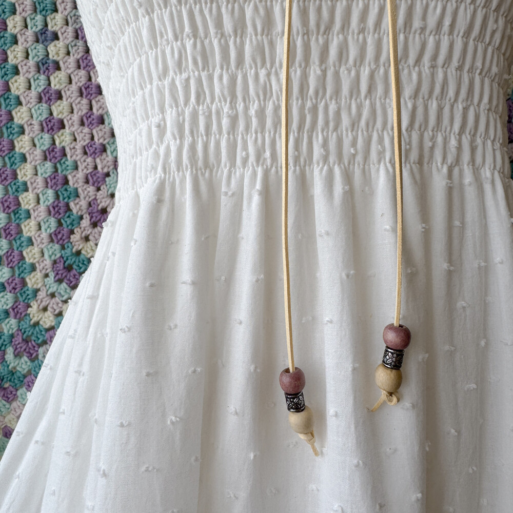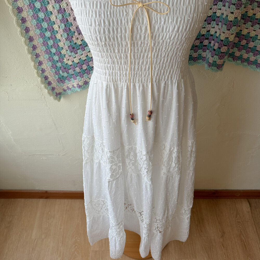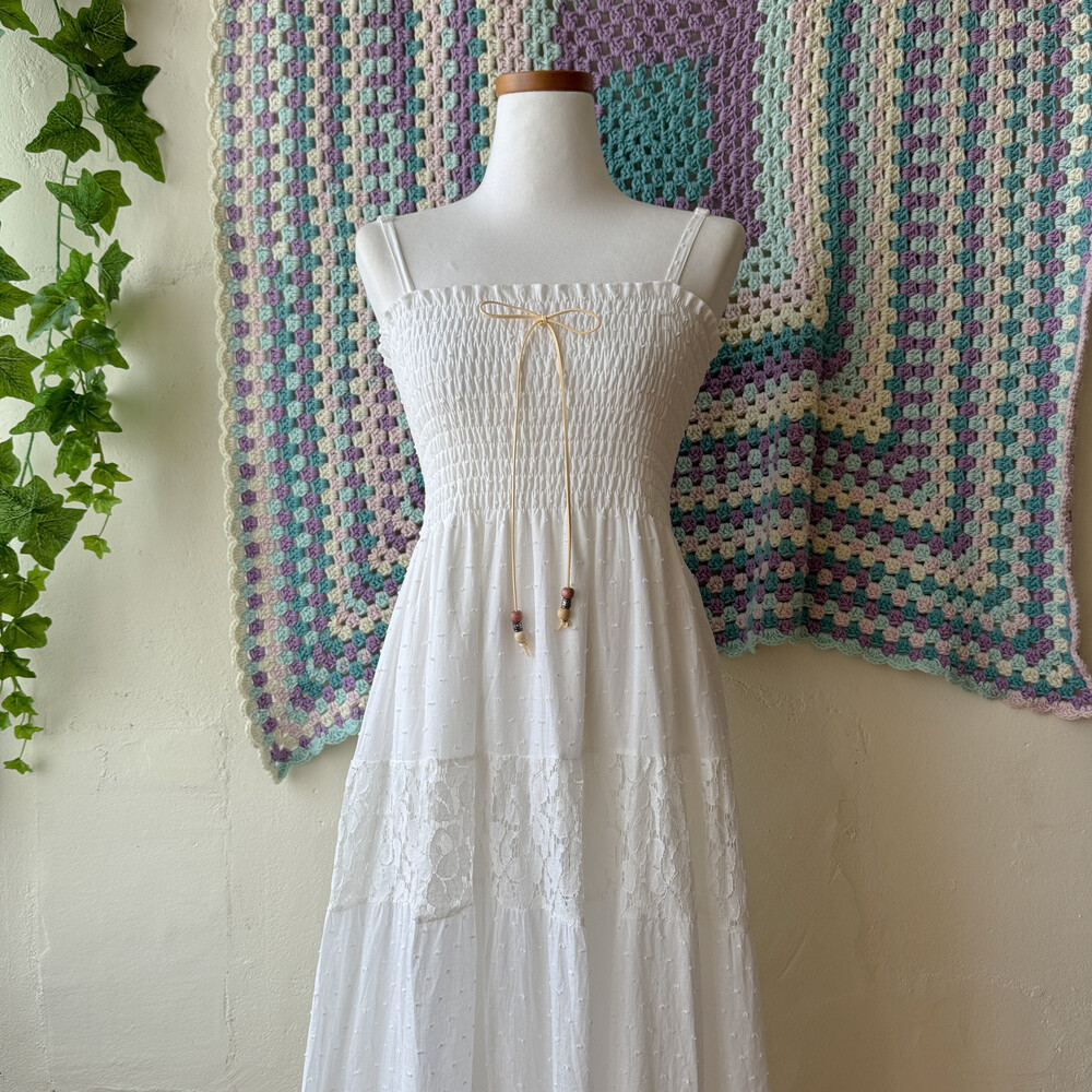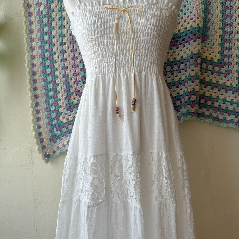 화이트 색감의 폼폼, 레이스 패치워크 끈원피스예요