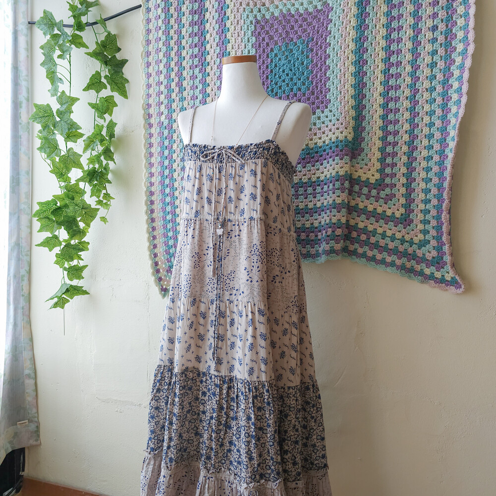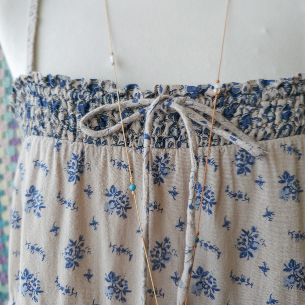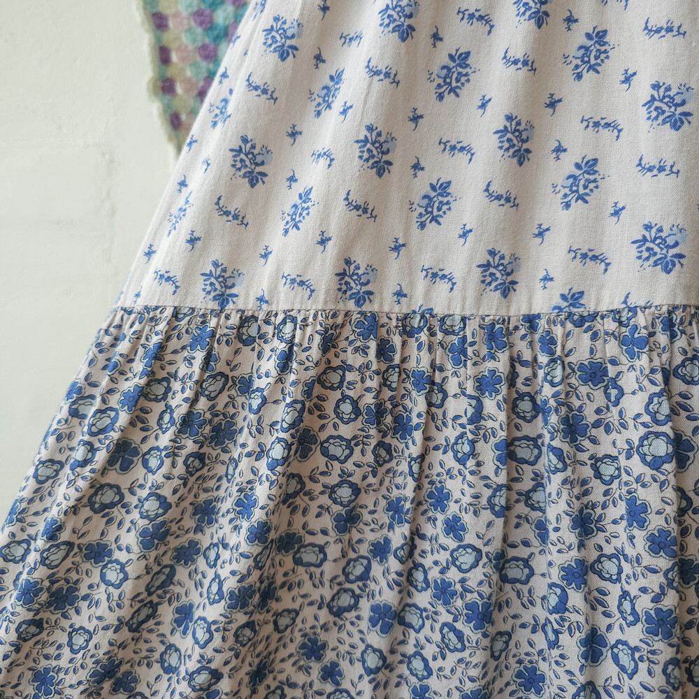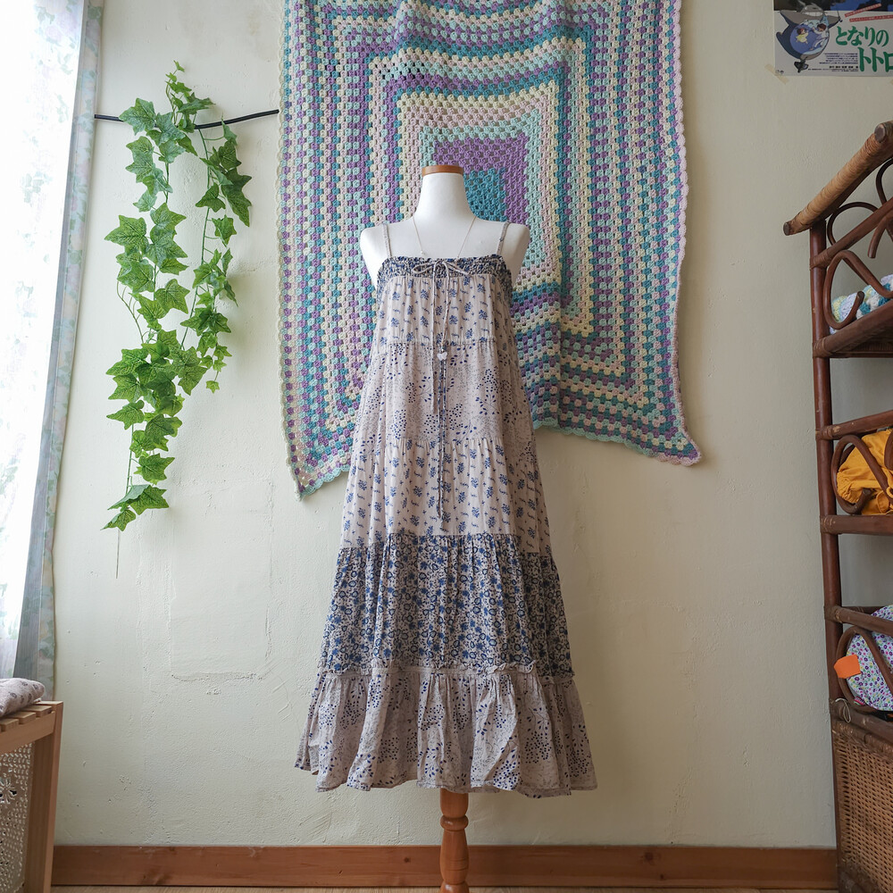 블루 꽃무늬 패턴의 코튼 패치워크 끈원피스예요