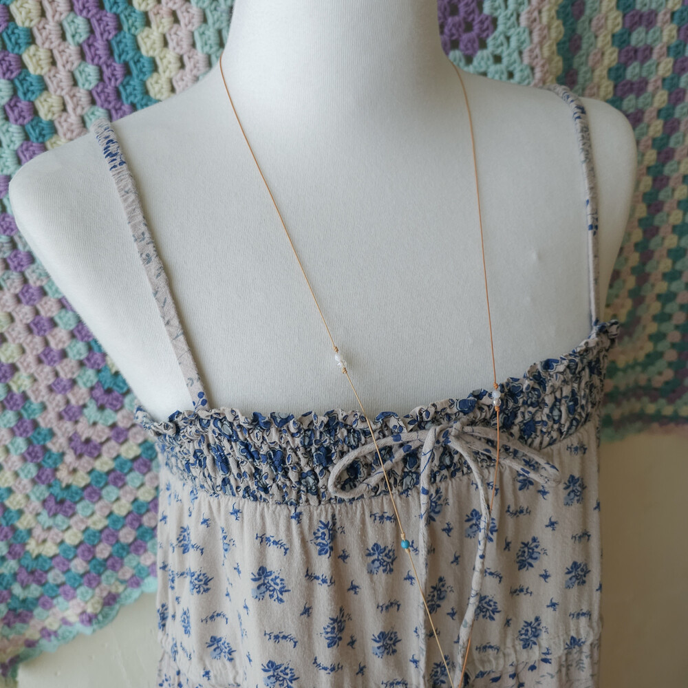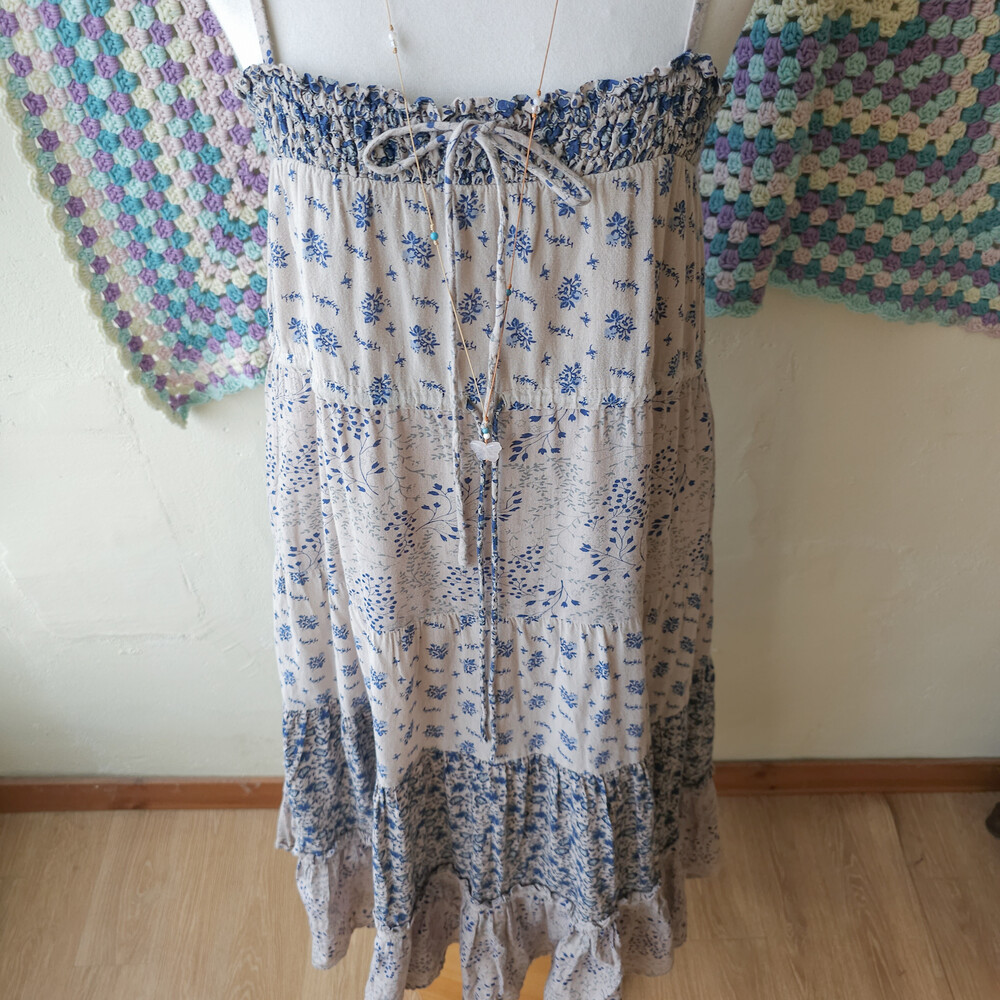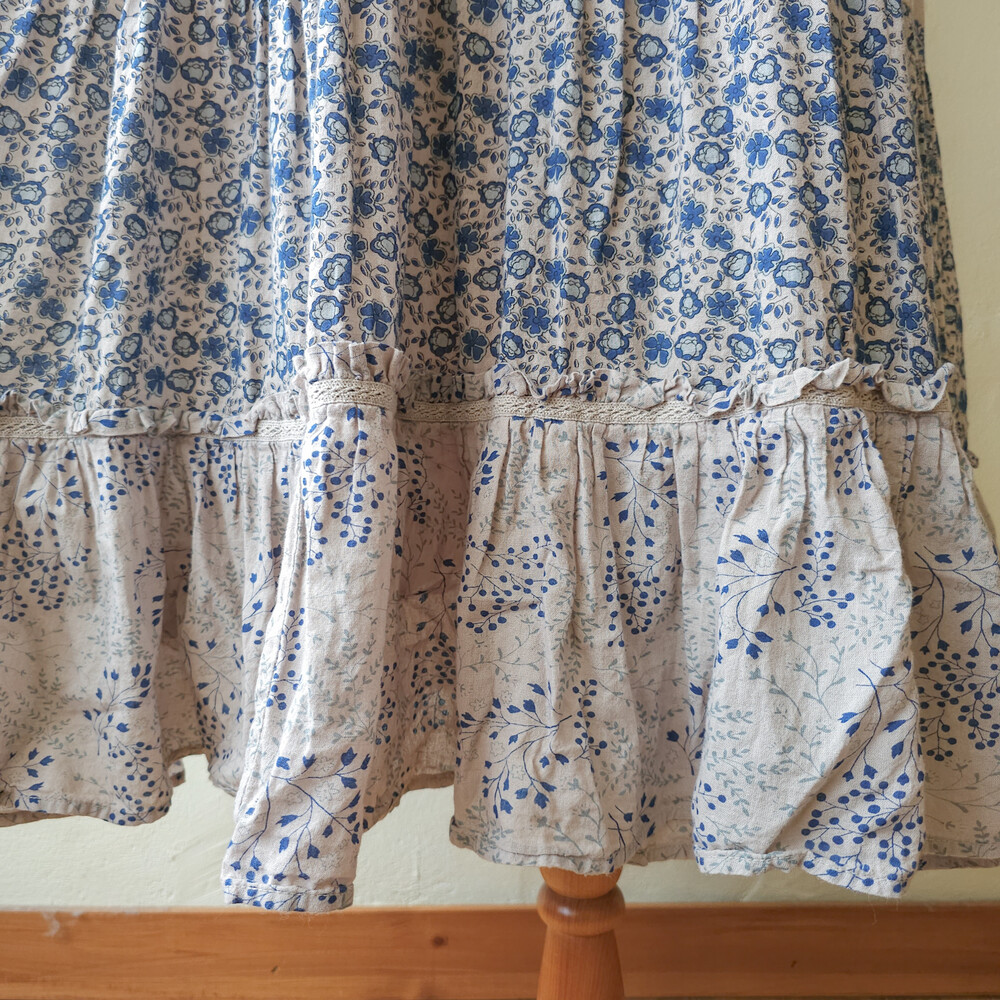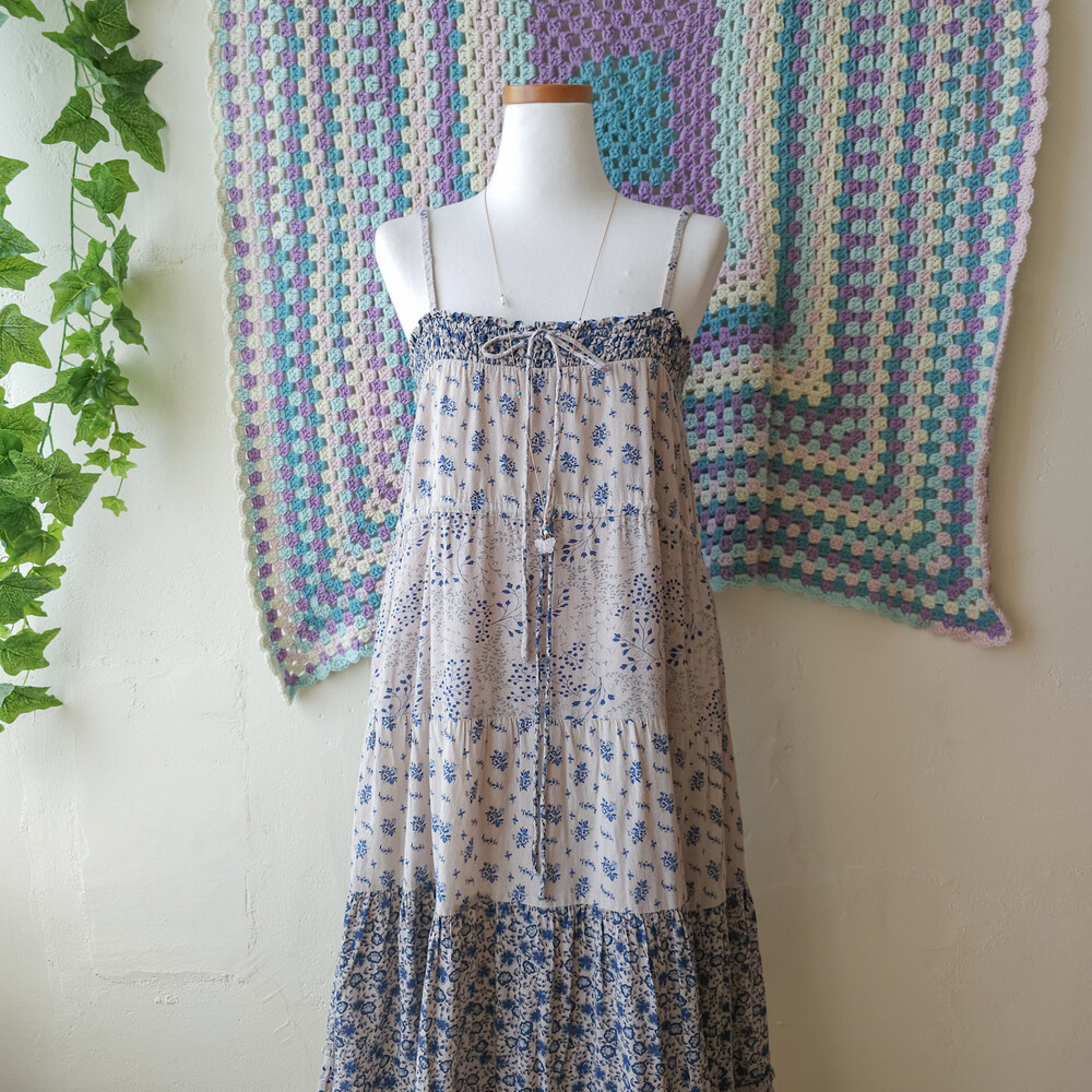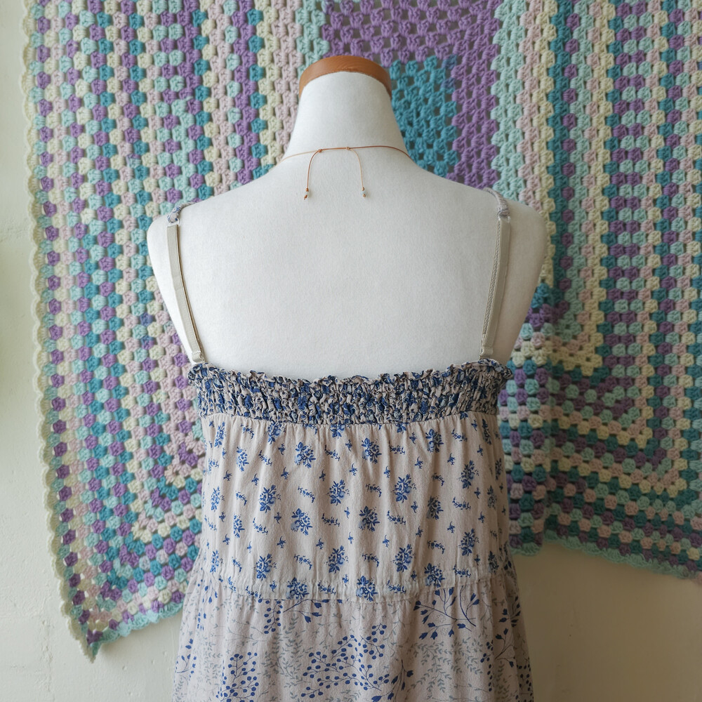 블루 꽃무늬 패턴의 코튼 패치워크 끈원피스예요