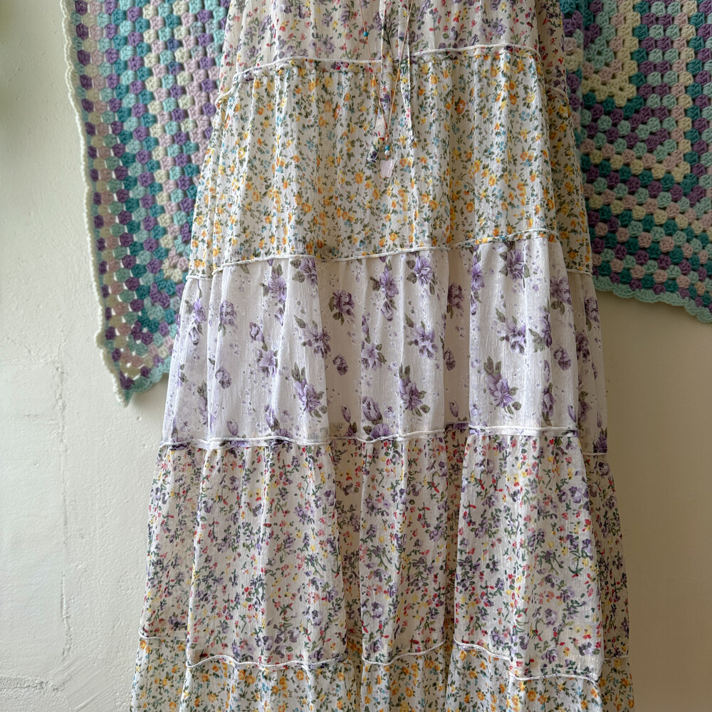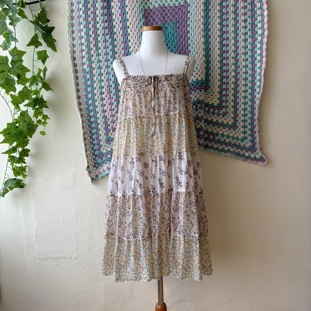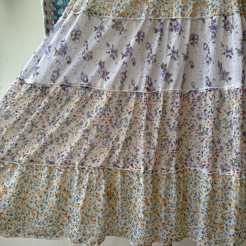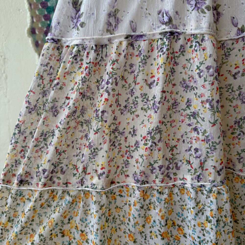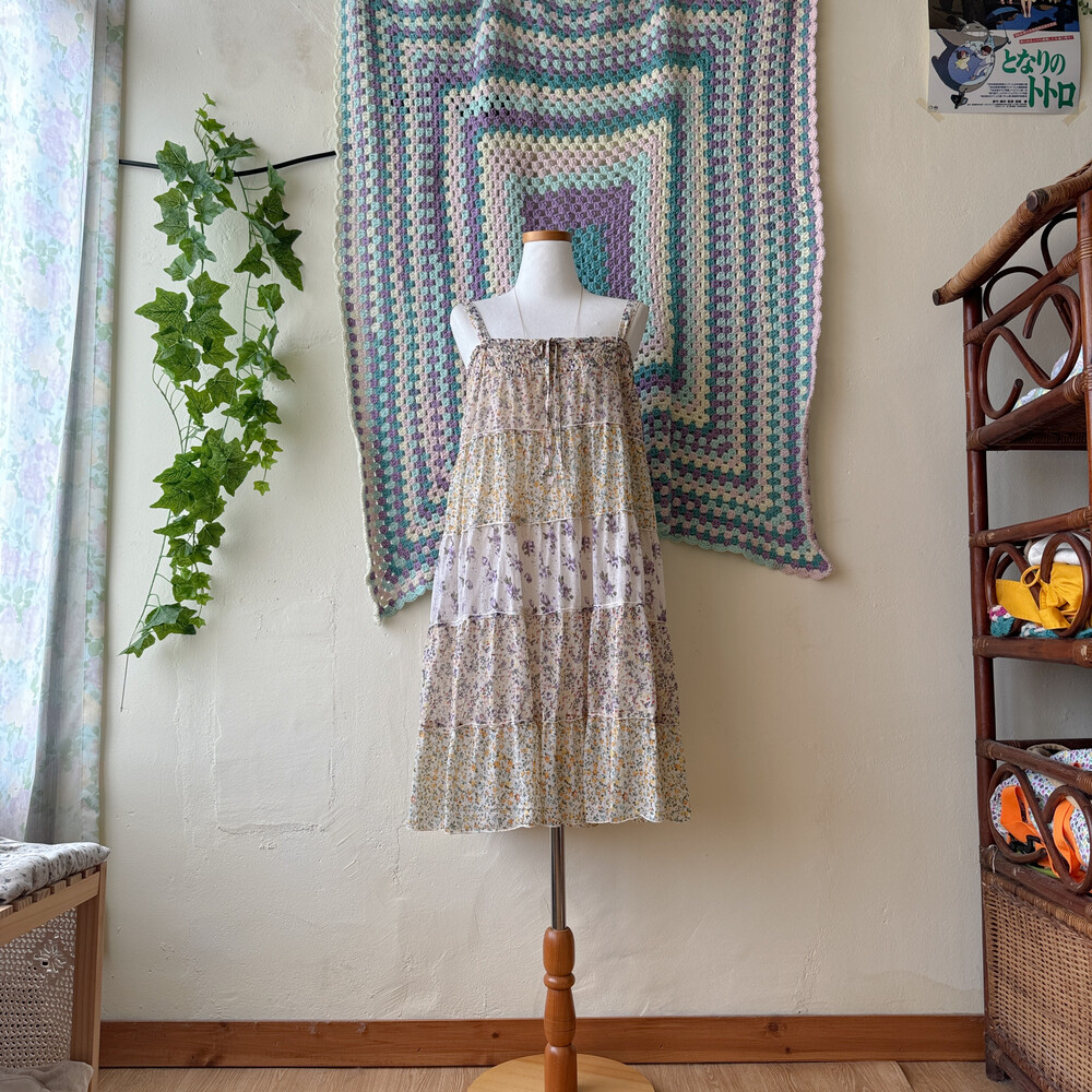 노랑, 보라 꽃무늬 패턴의 패치워크 끈원피스예요