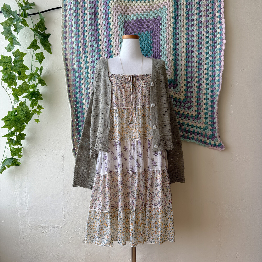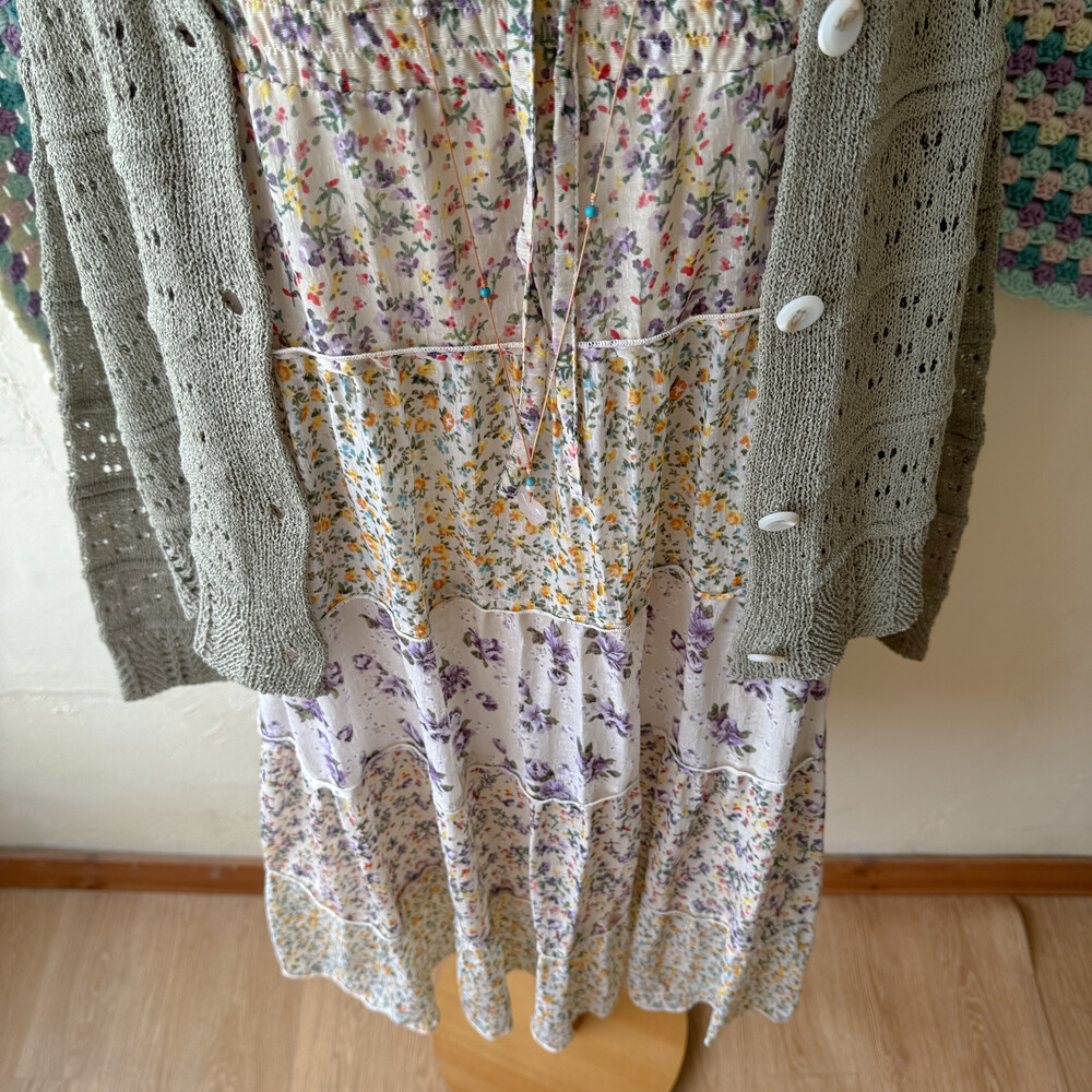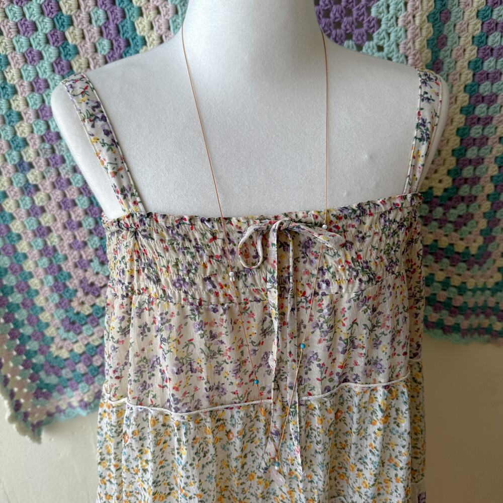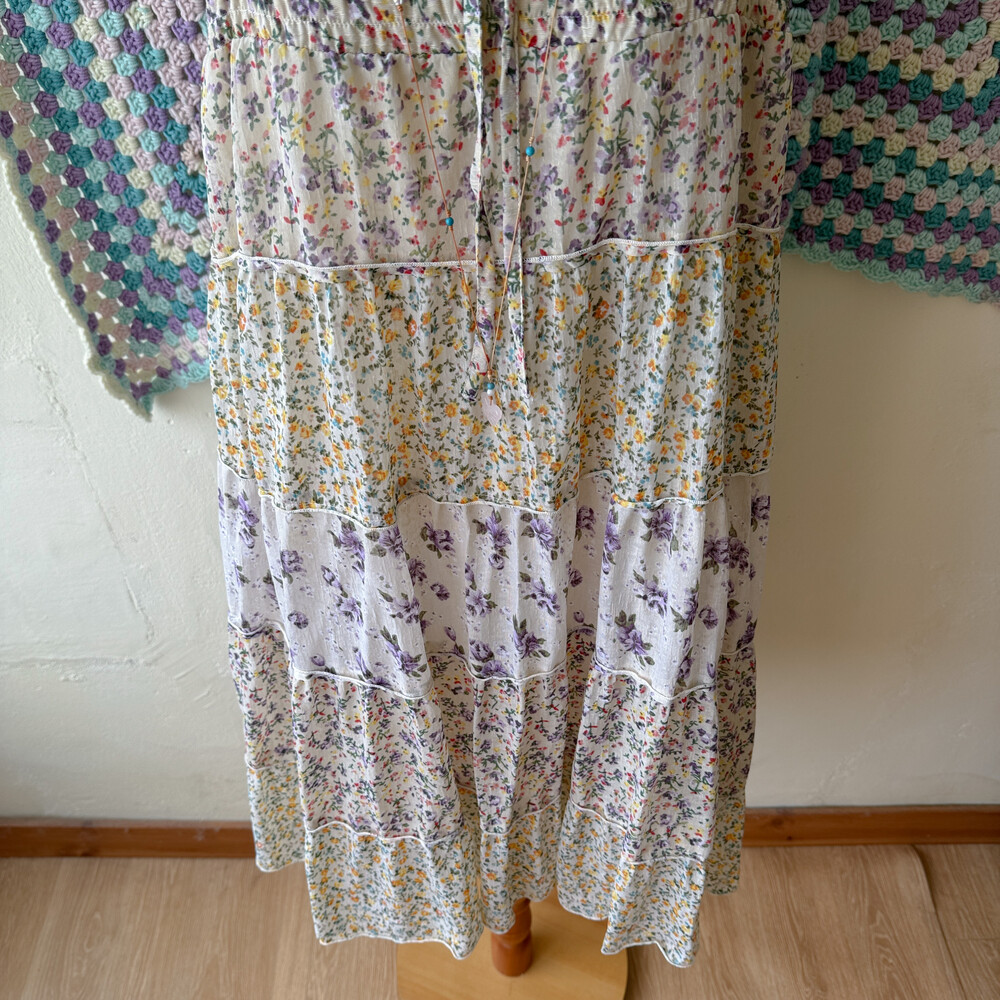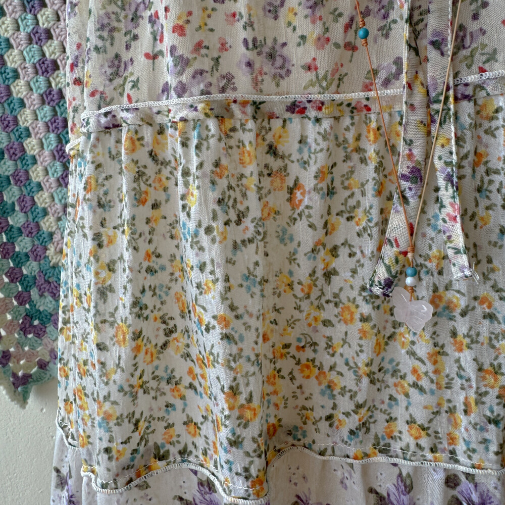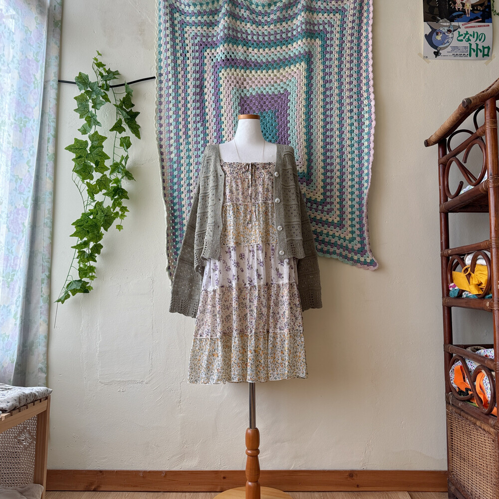 노랑, 보라 꽃무늬 패턴의 패치워크 끈원피스예요