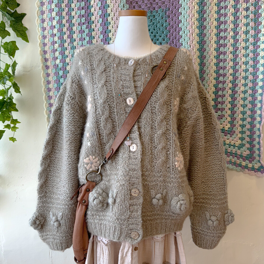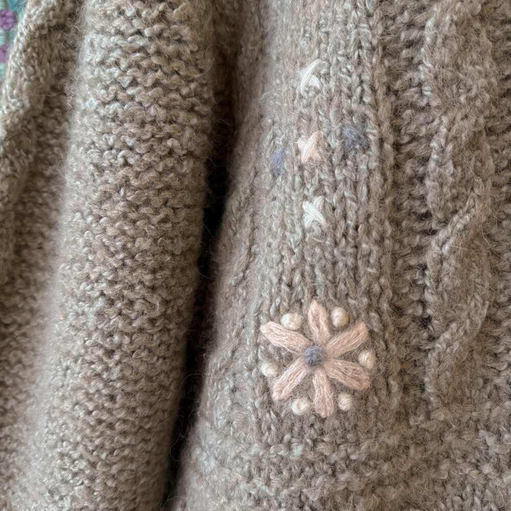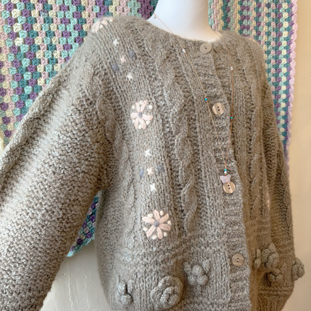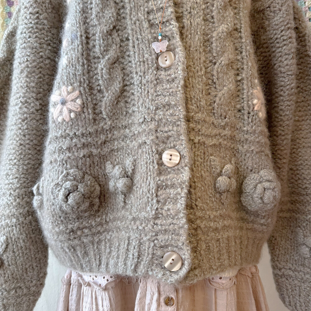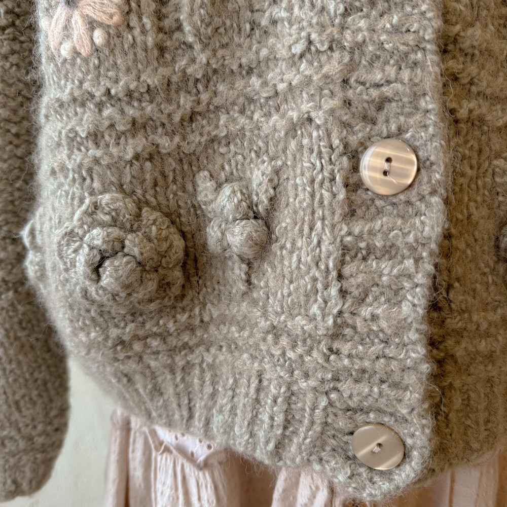 베이지+오트밀 색감 베이스의 자수 모티브 가디건이에요