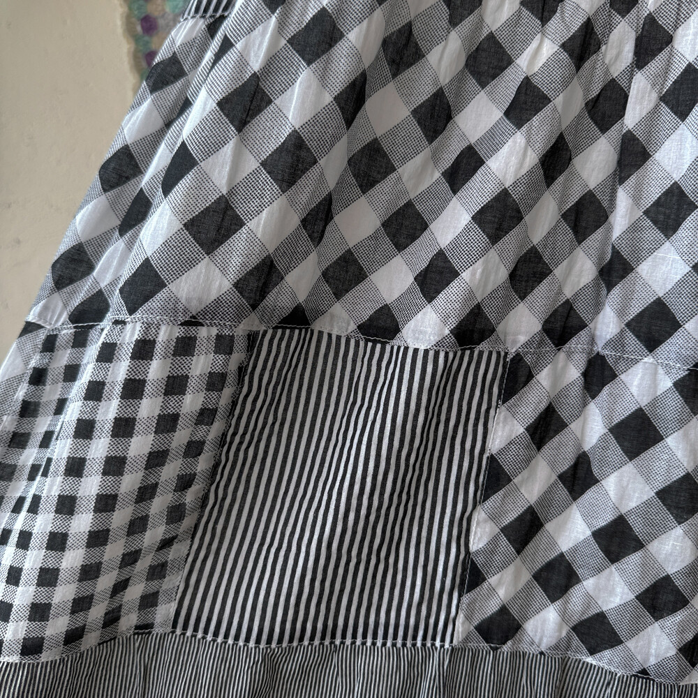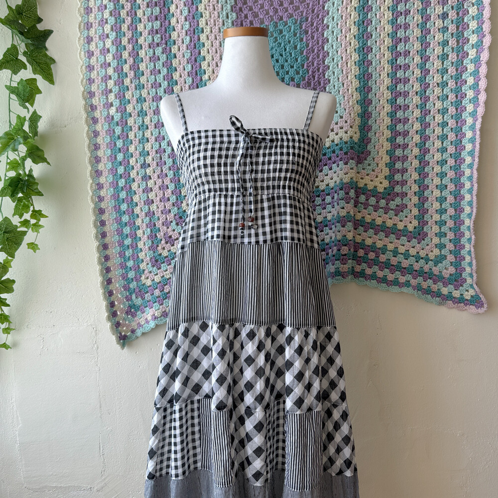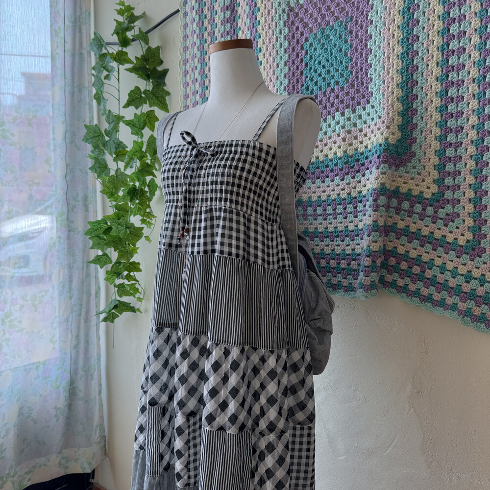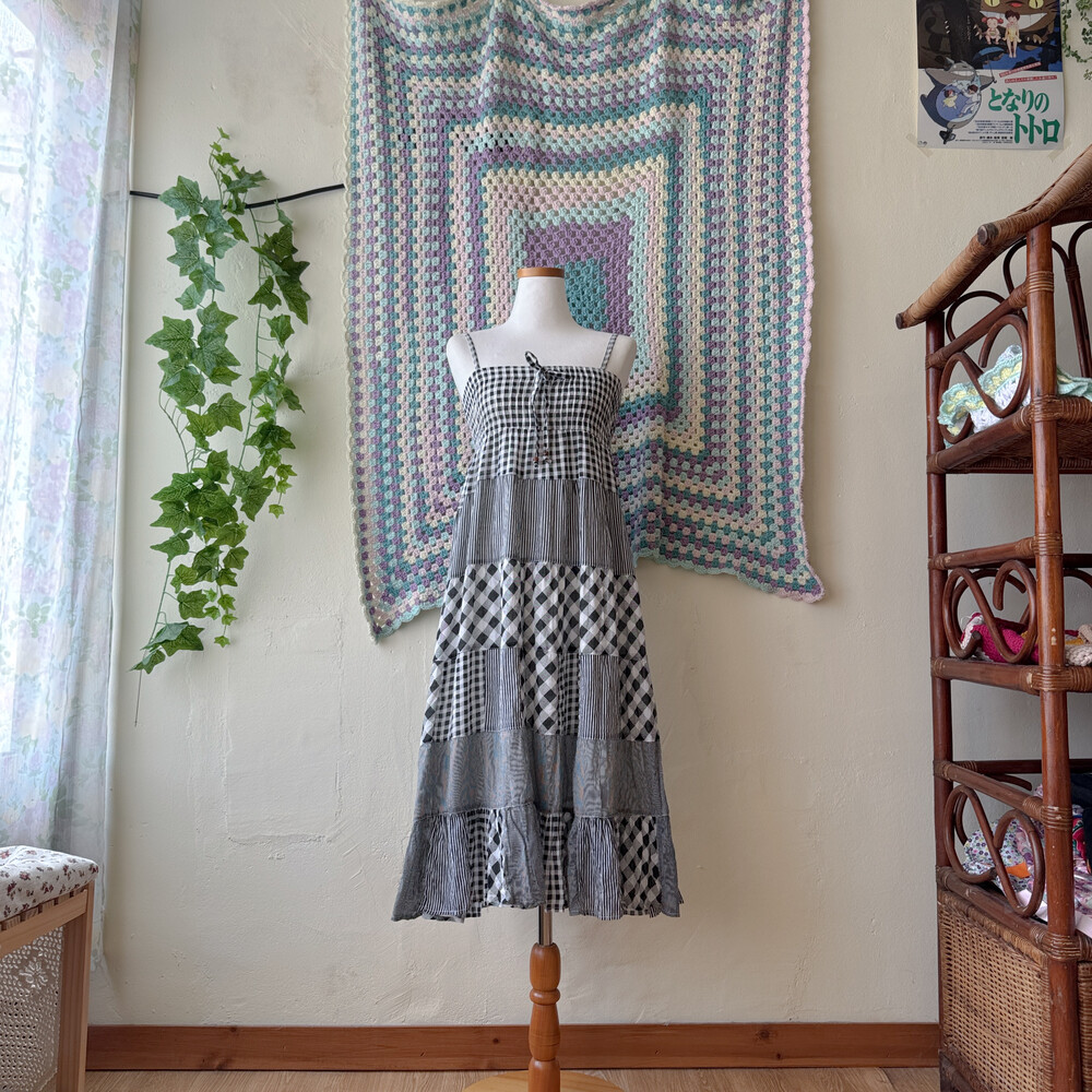 블랙 체크 패턴의 패치워크 끈원피스예요