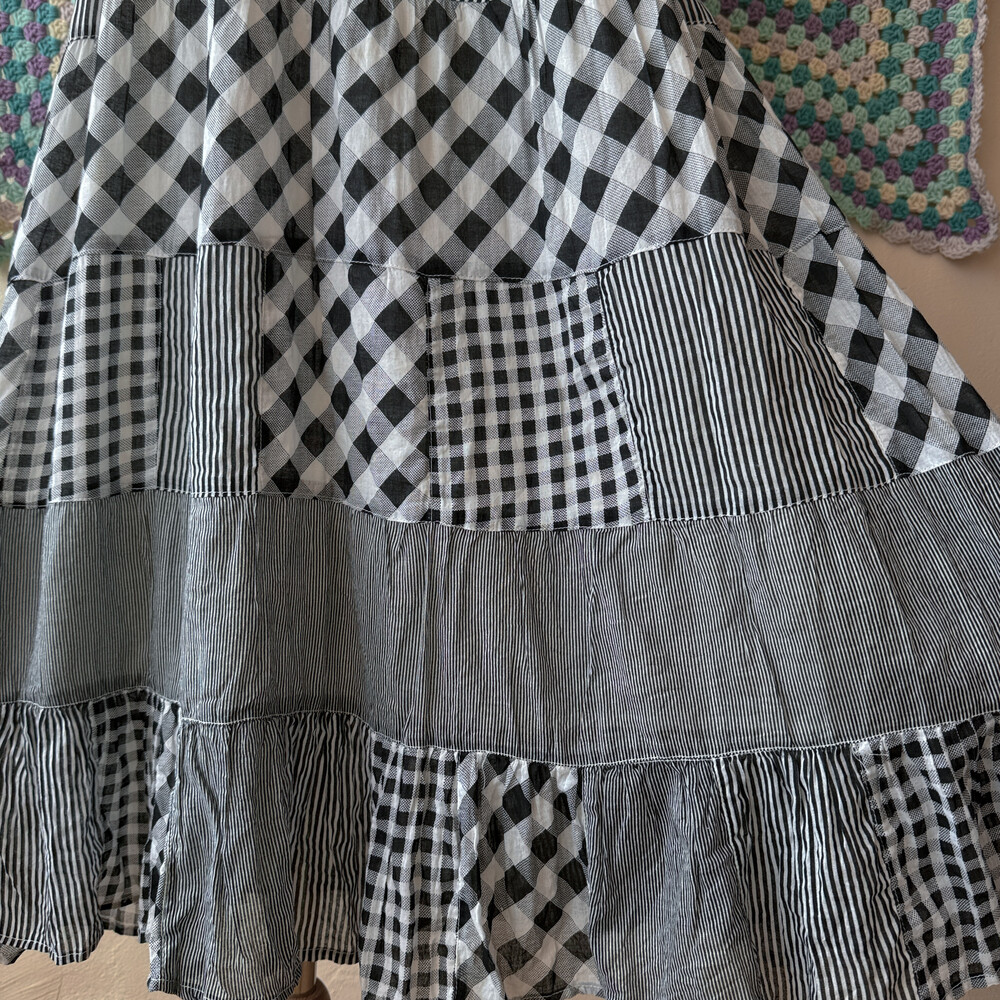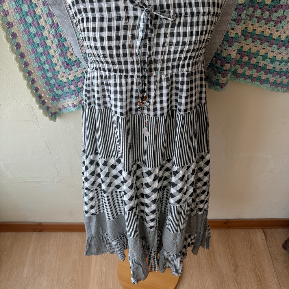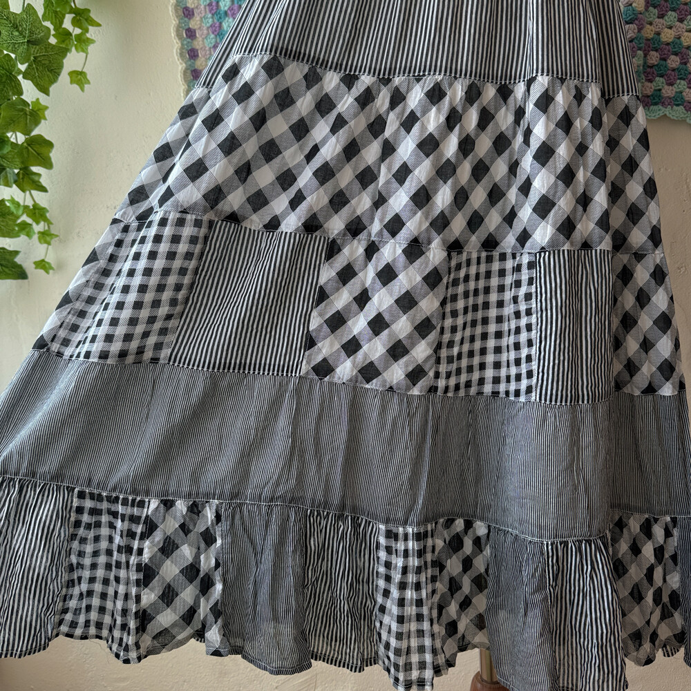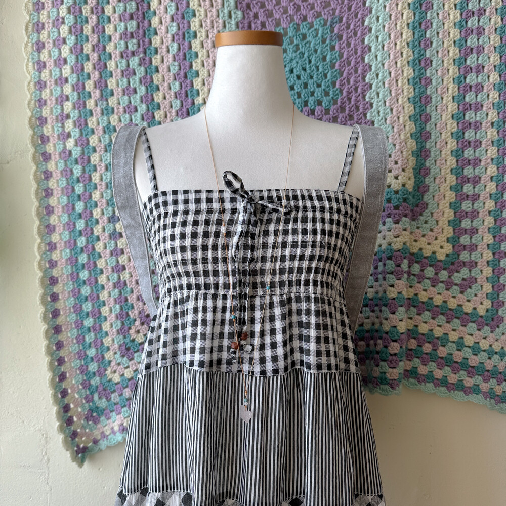 블랙 체크 패턴의 패치워크 끈원피스예요
