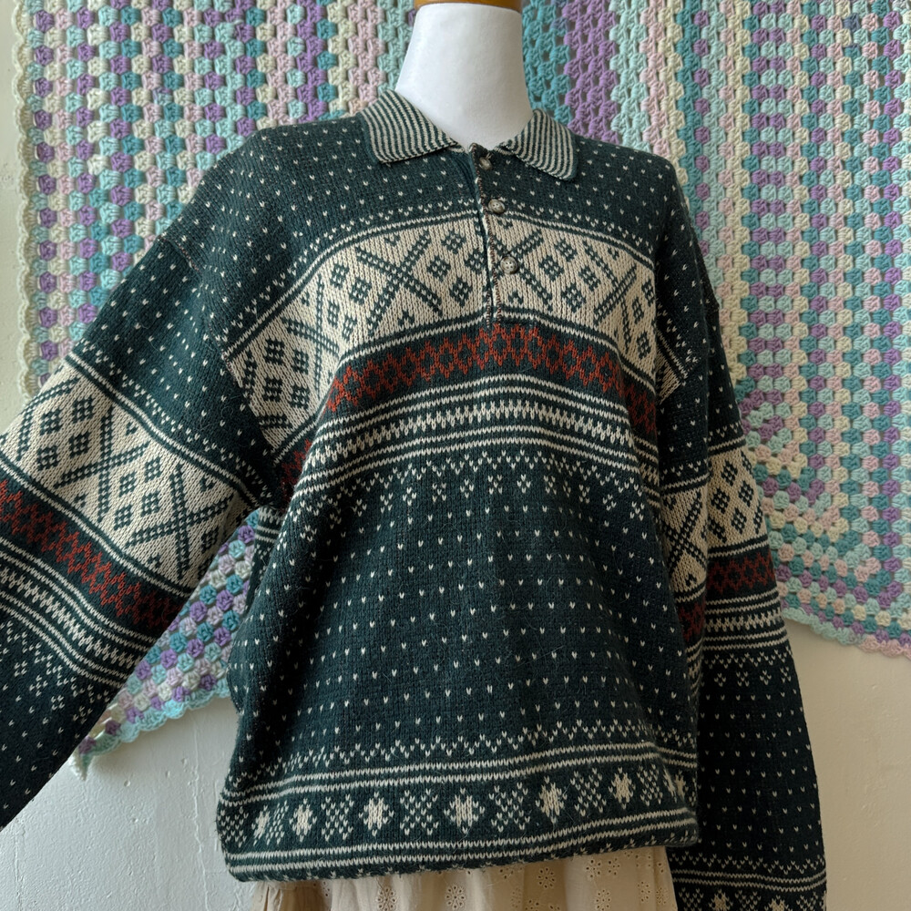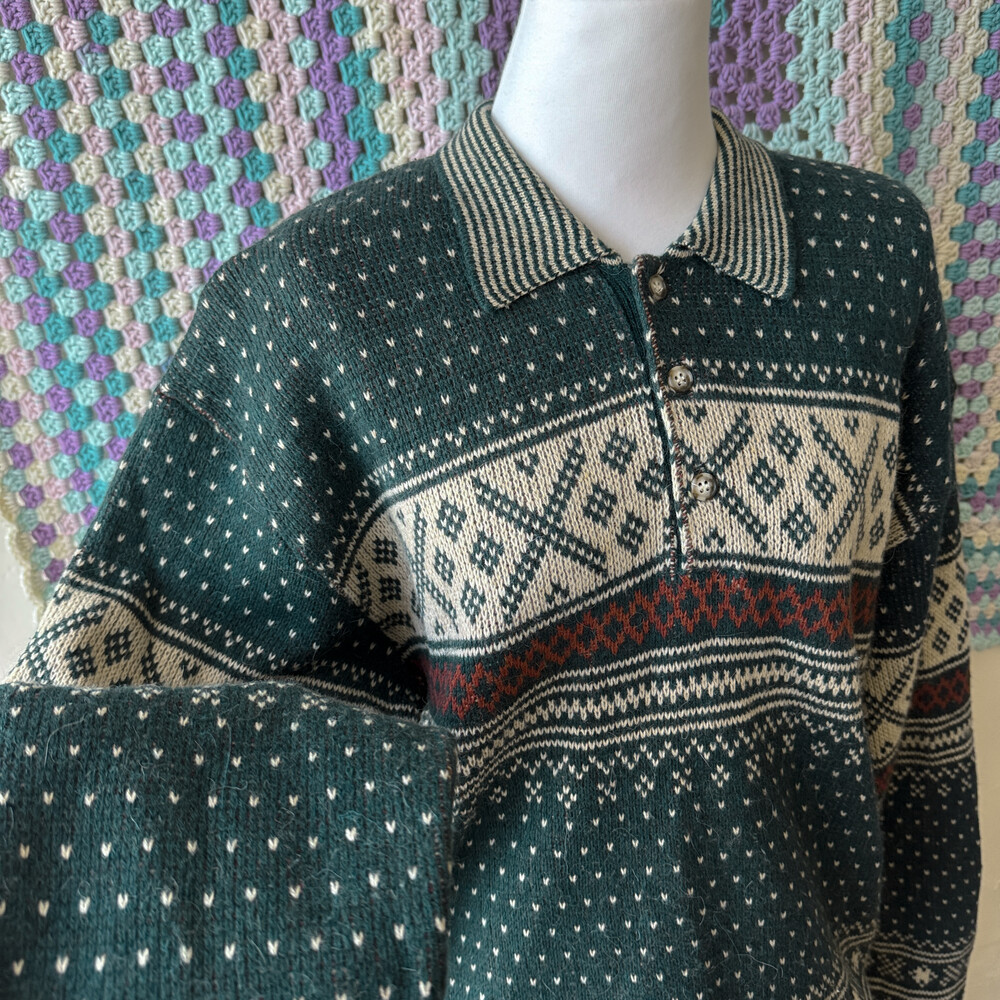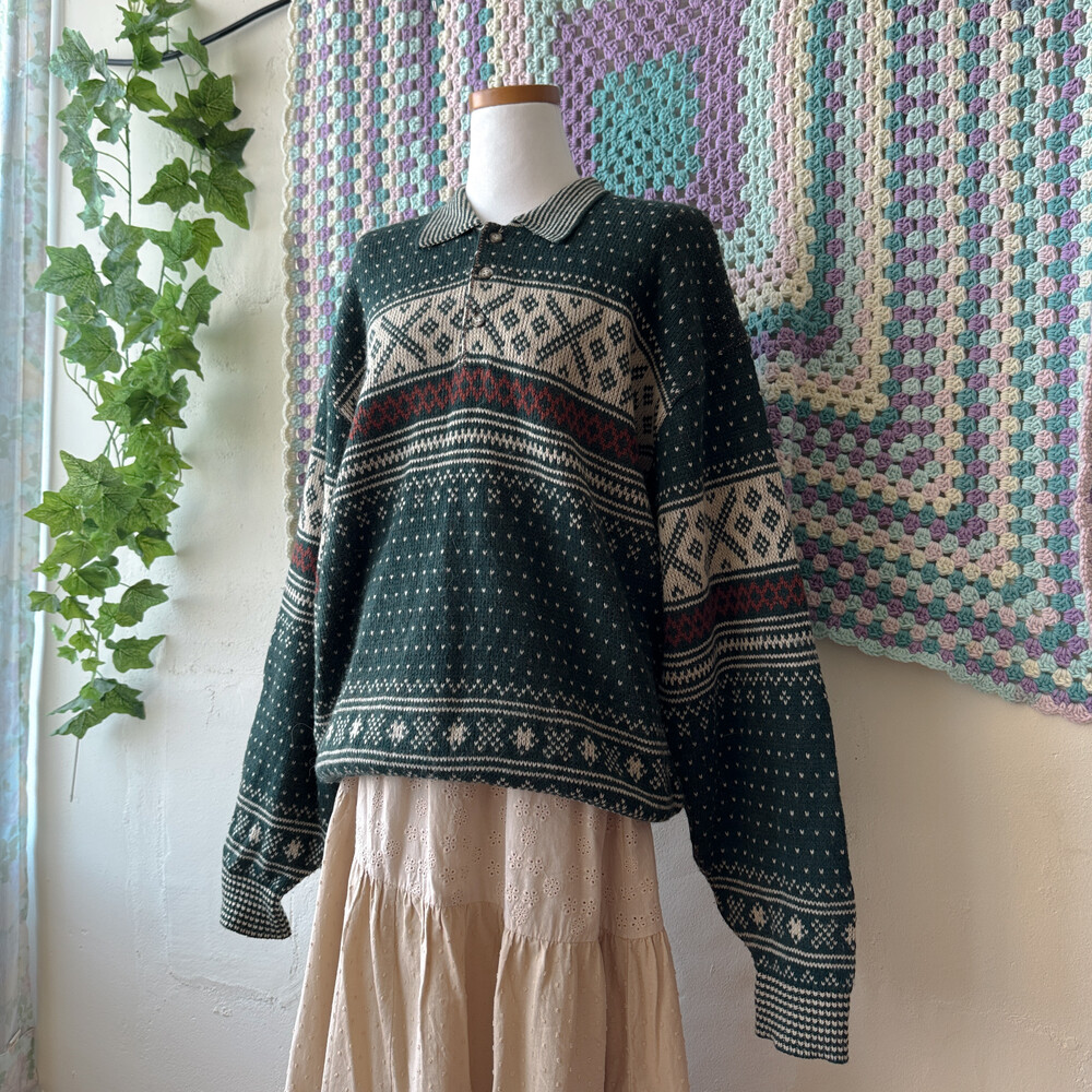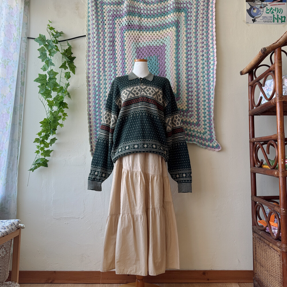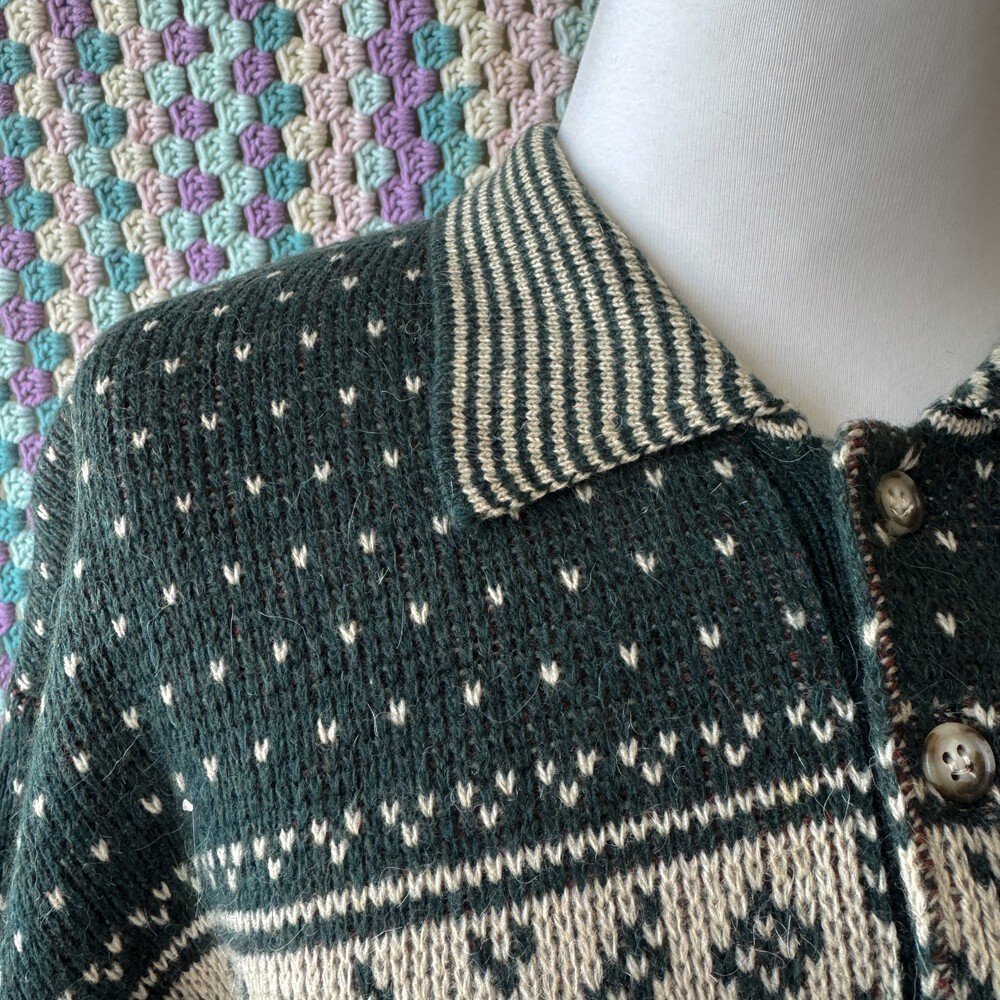 다크그린 색감의 잔하트 패턴의 카라 니트예요