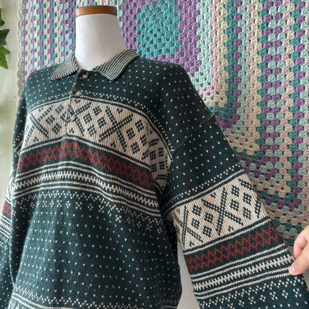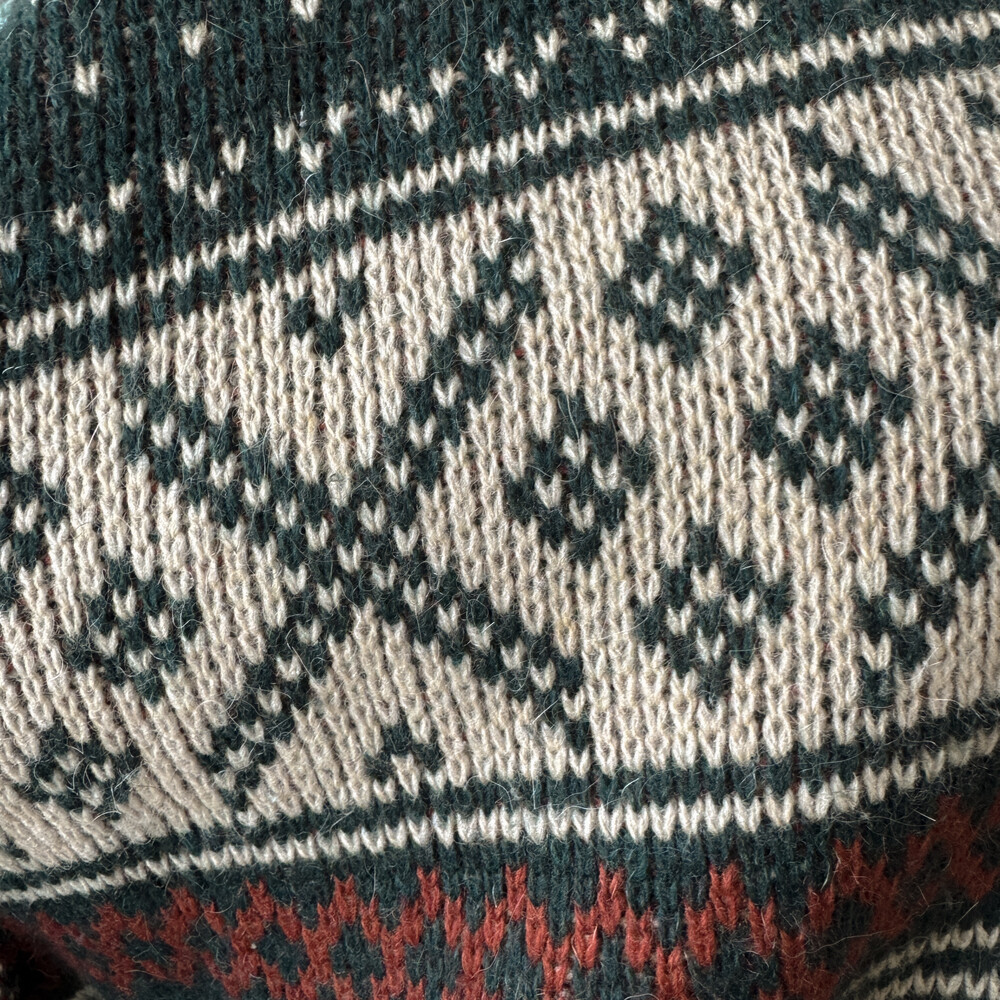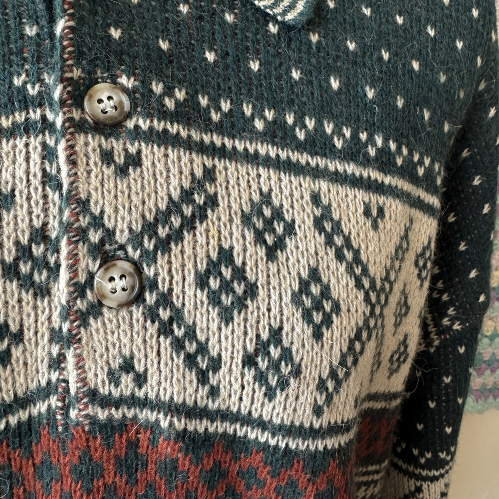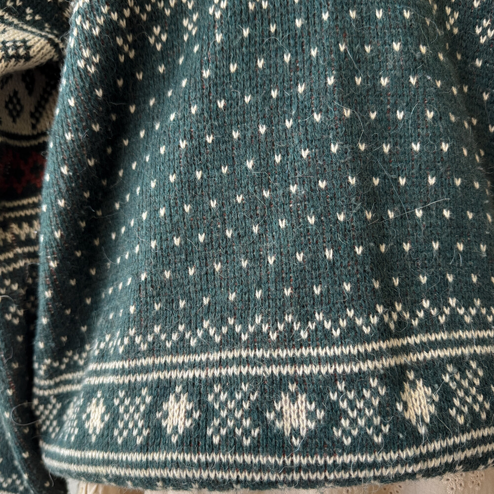 다크그린 색감의 잔하트 패턴의 카라 니트예요