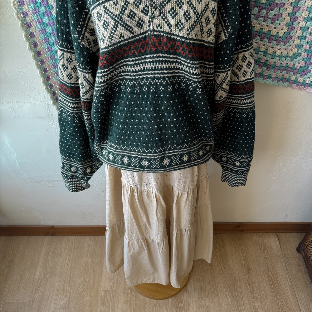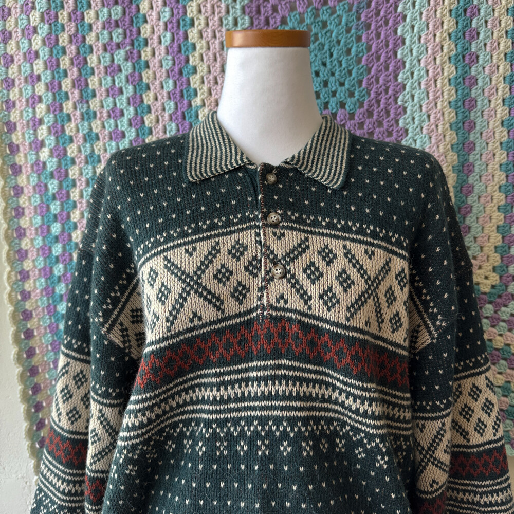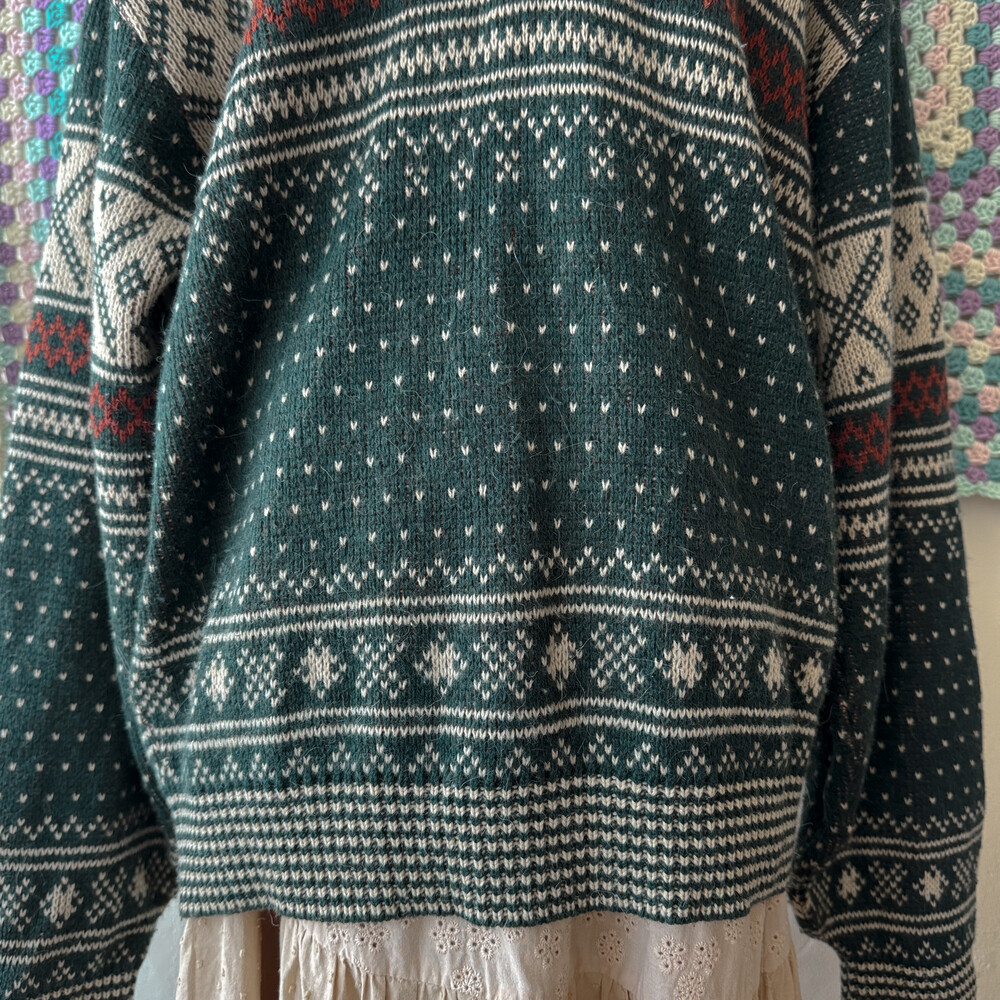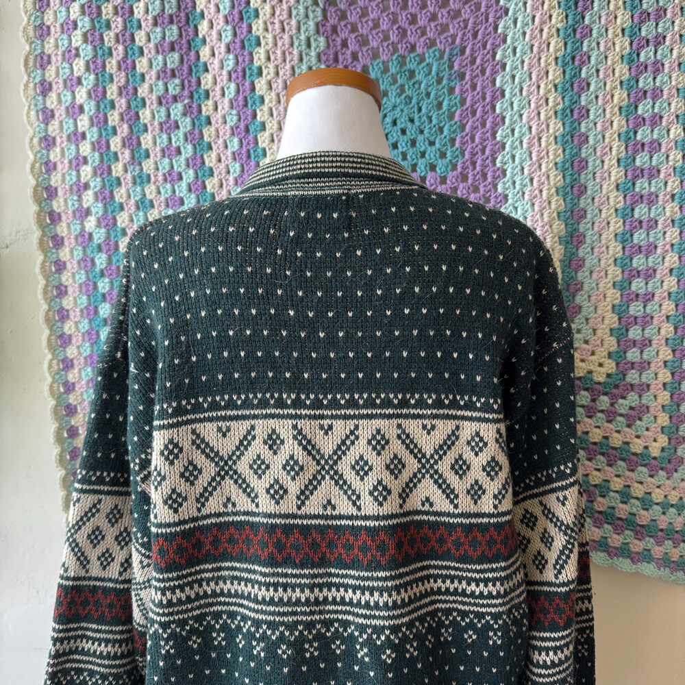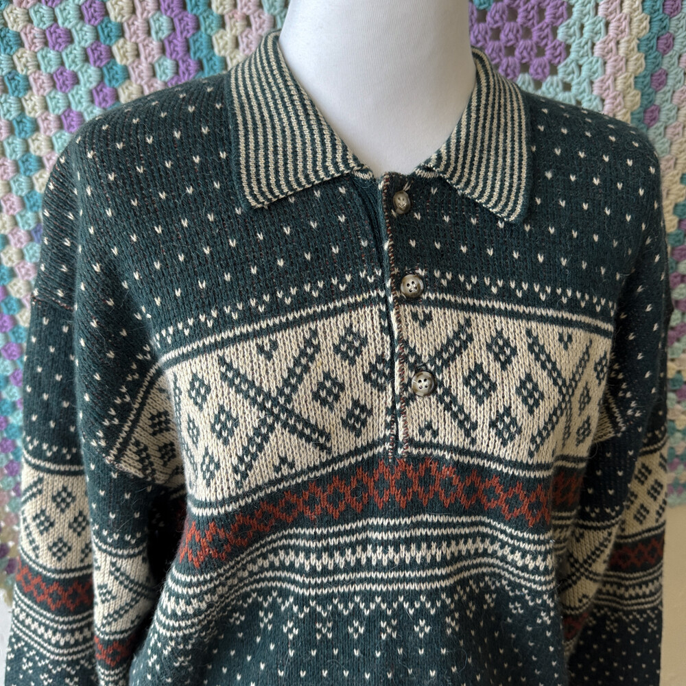 다크그린 색감의 잔하트 패턴의 카라 니트예요