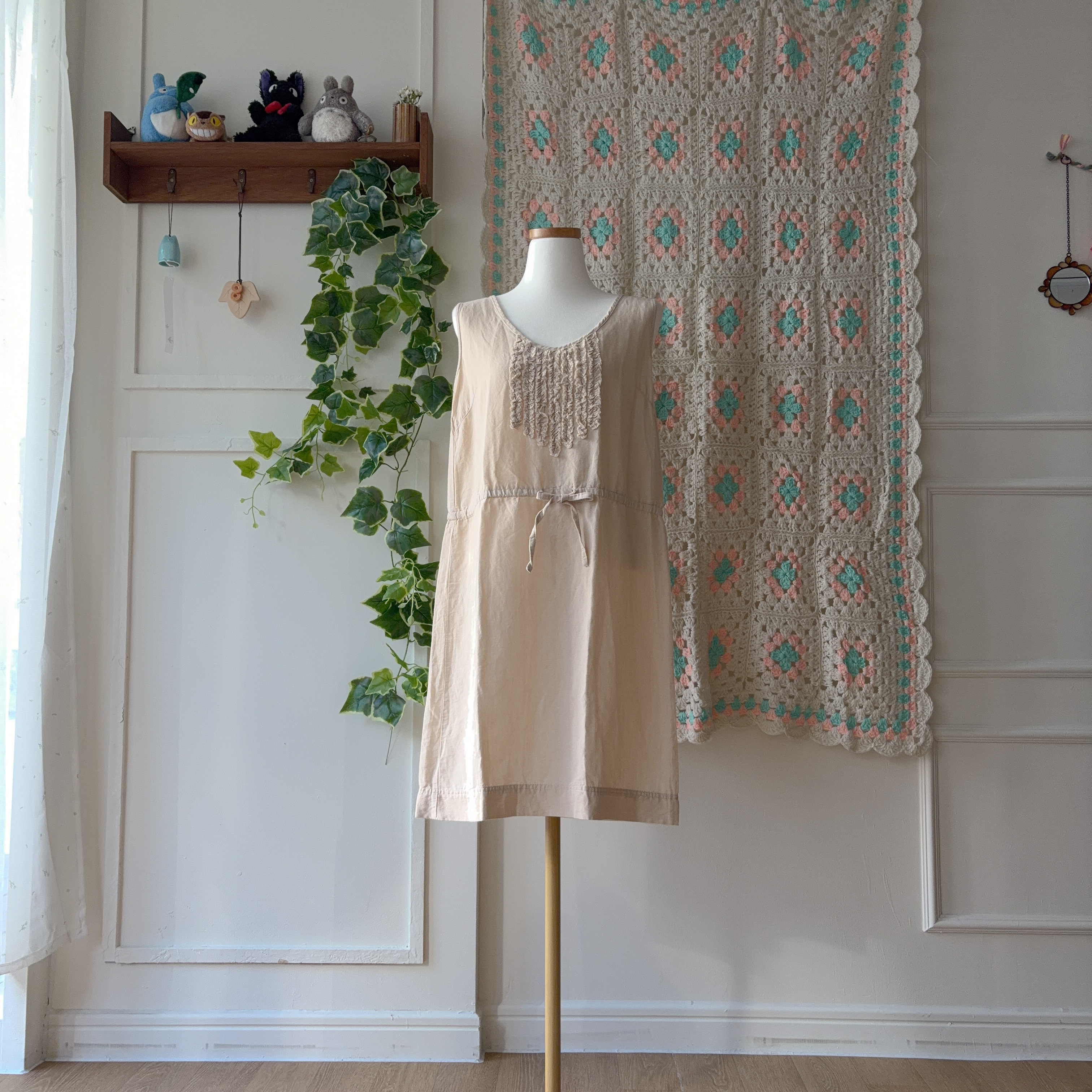베이지 색감의 민소매 원피스예요