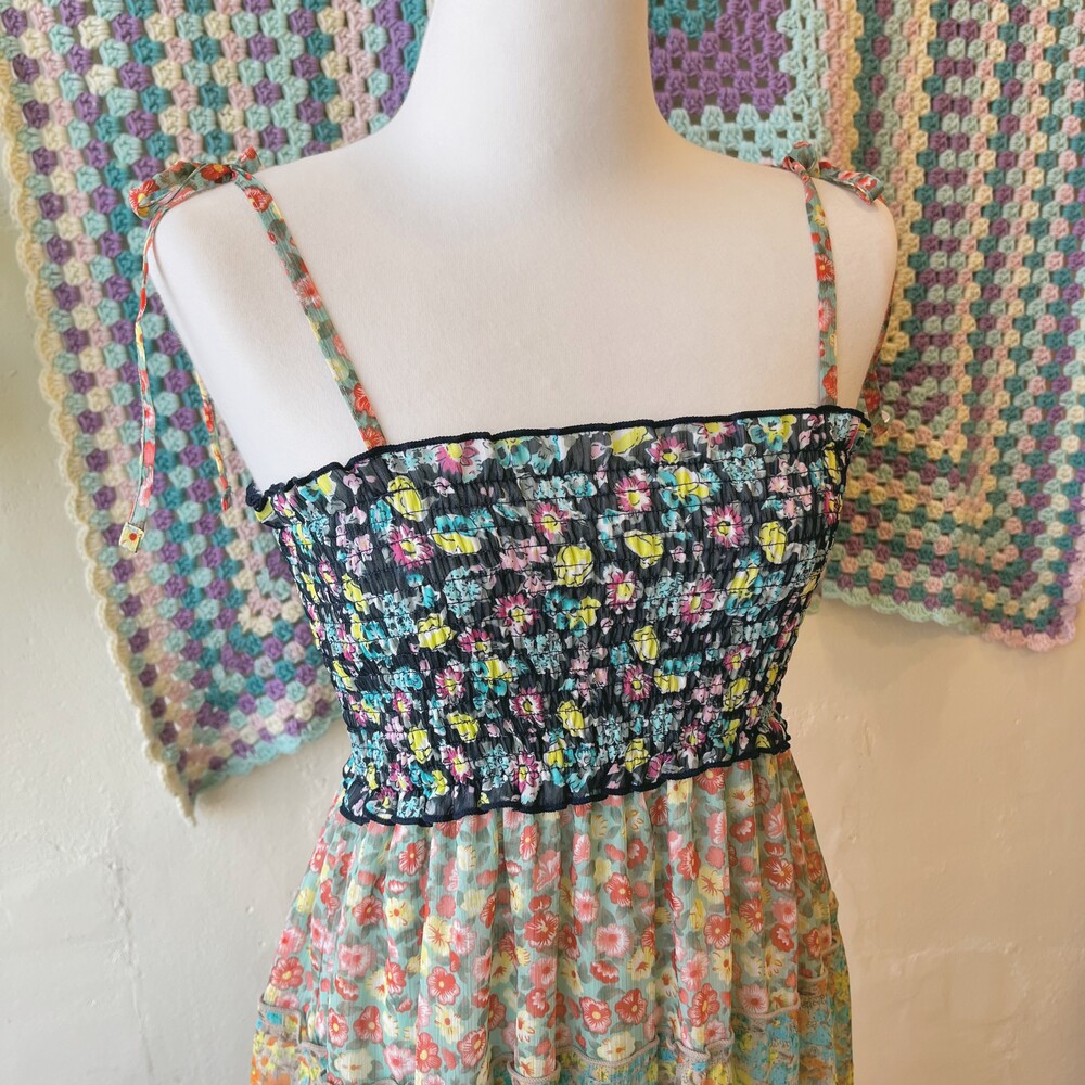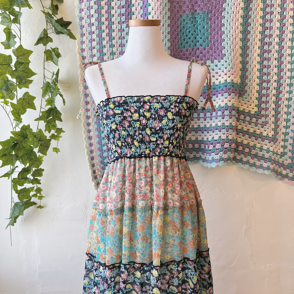 그린과 네이비 색감 조합의 플라워 패치 원피스예요