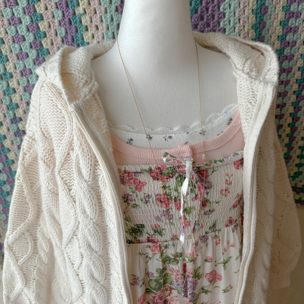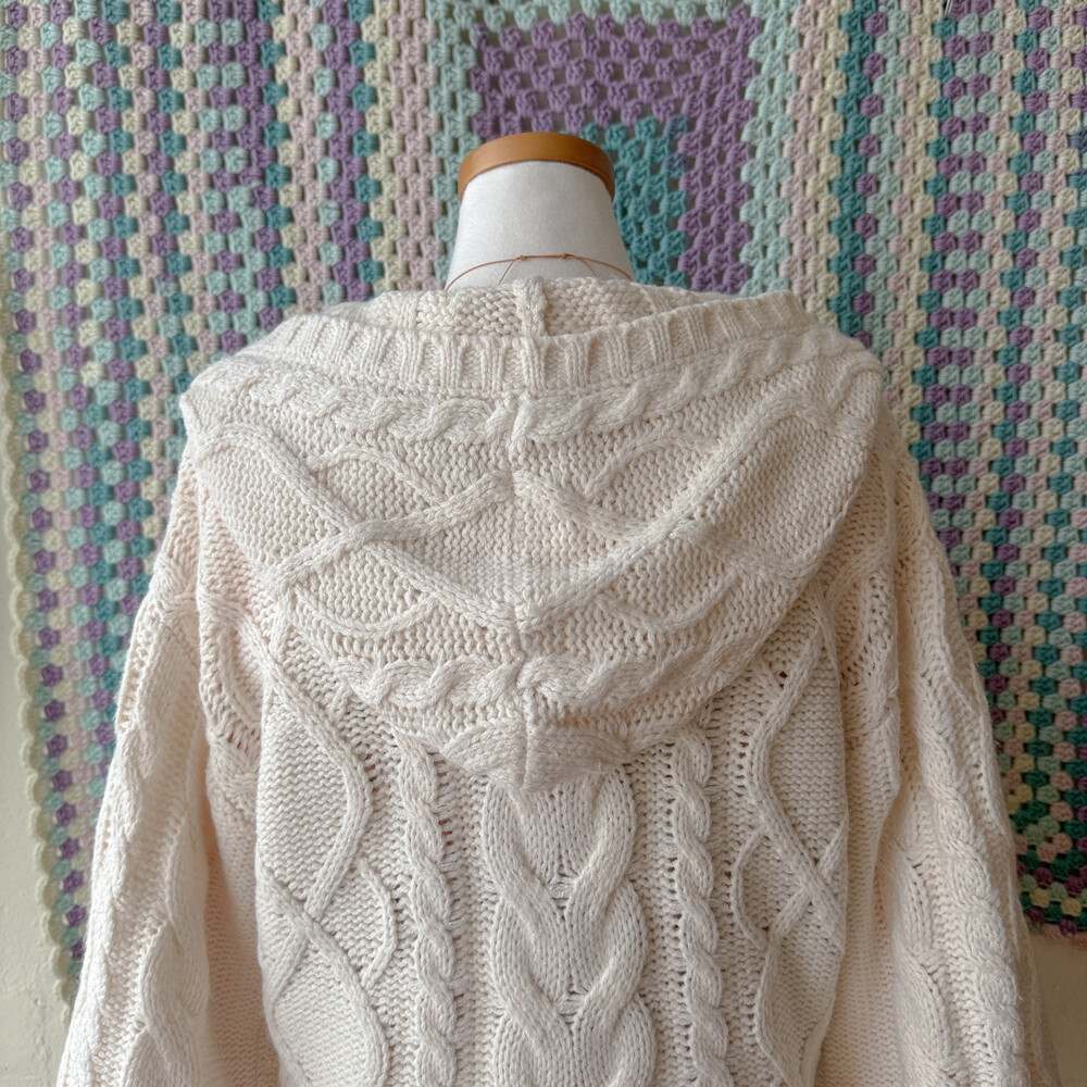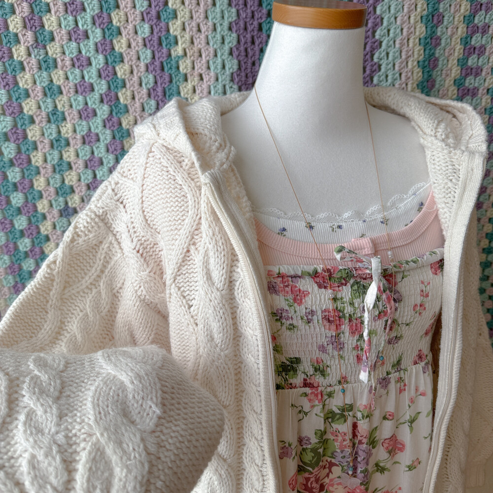 아이보리 색감의 케이블 후드집업 가디건이에요