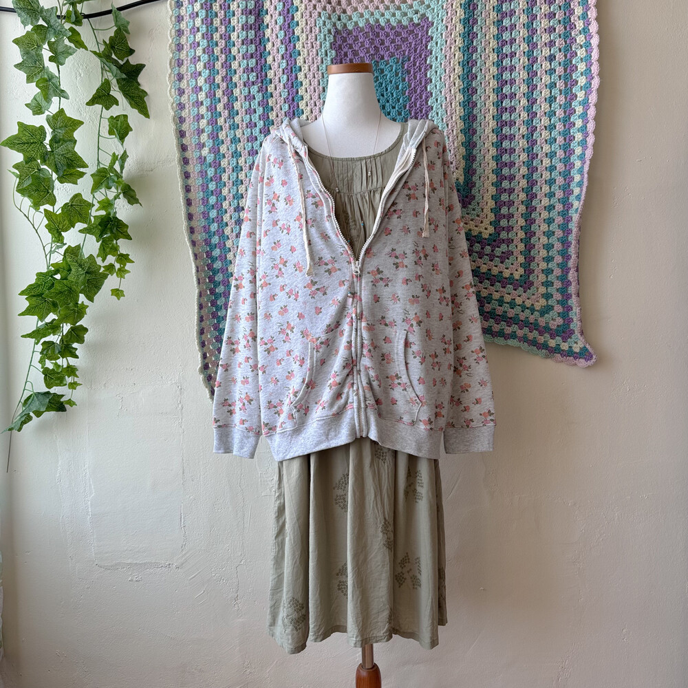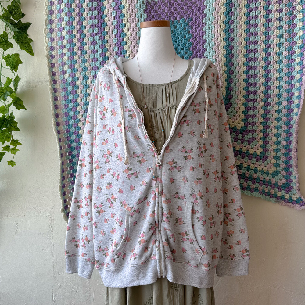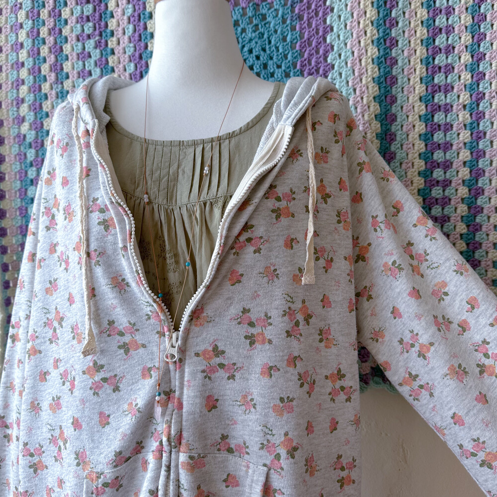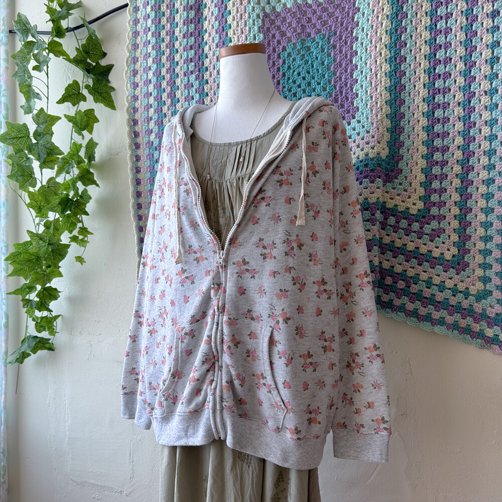 그레이 색감 바탕의 꽃무늬 후드집업이에요