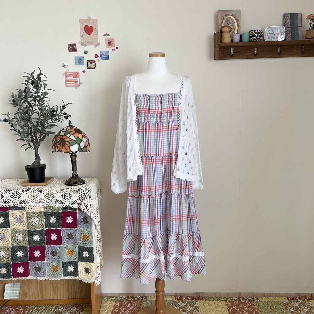 퍼플, 블루 색감의 체크 코튼 끈원피스예요