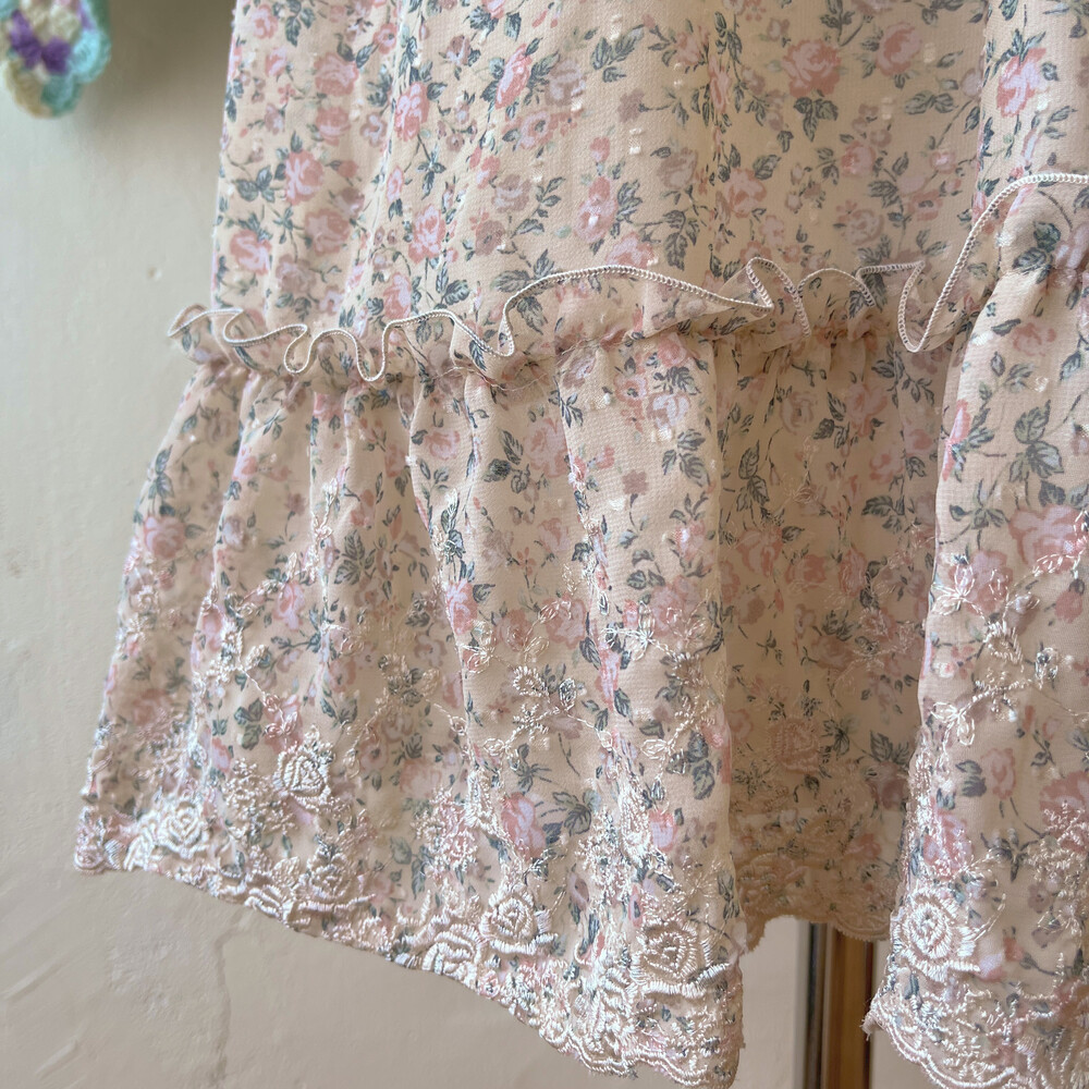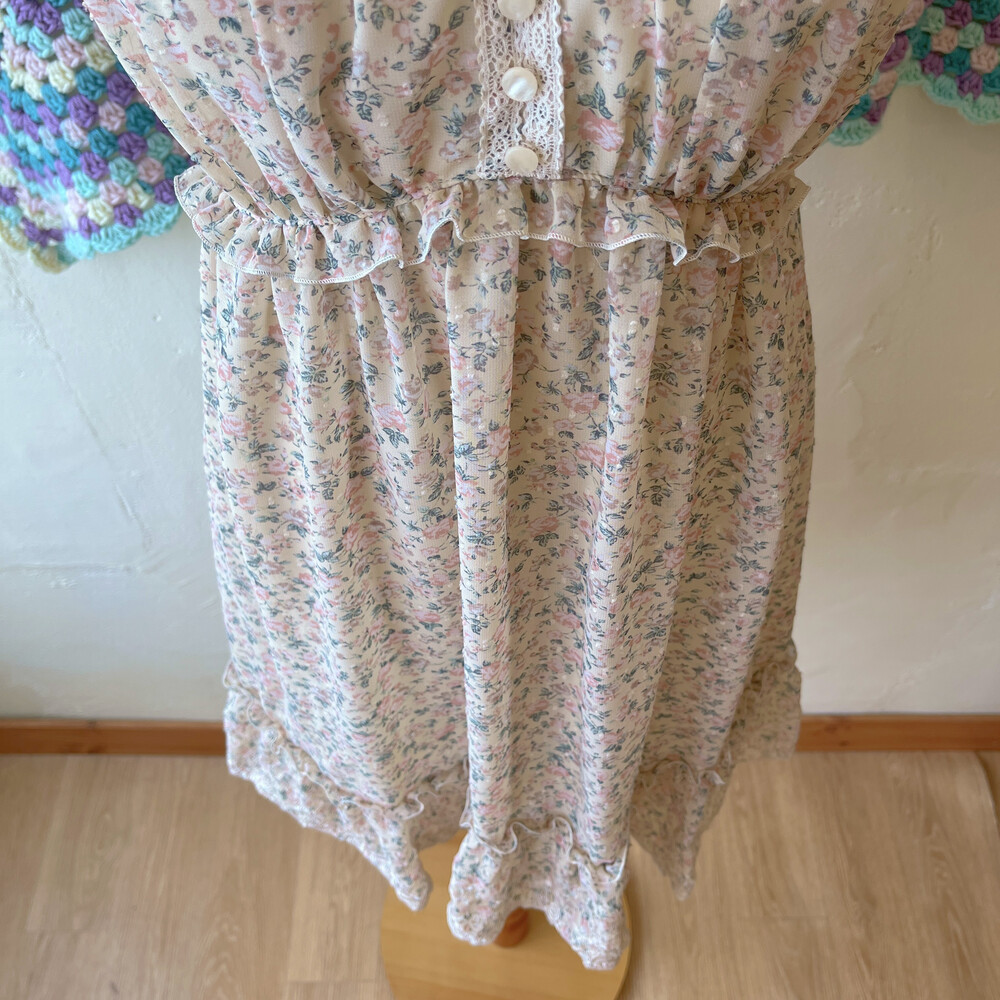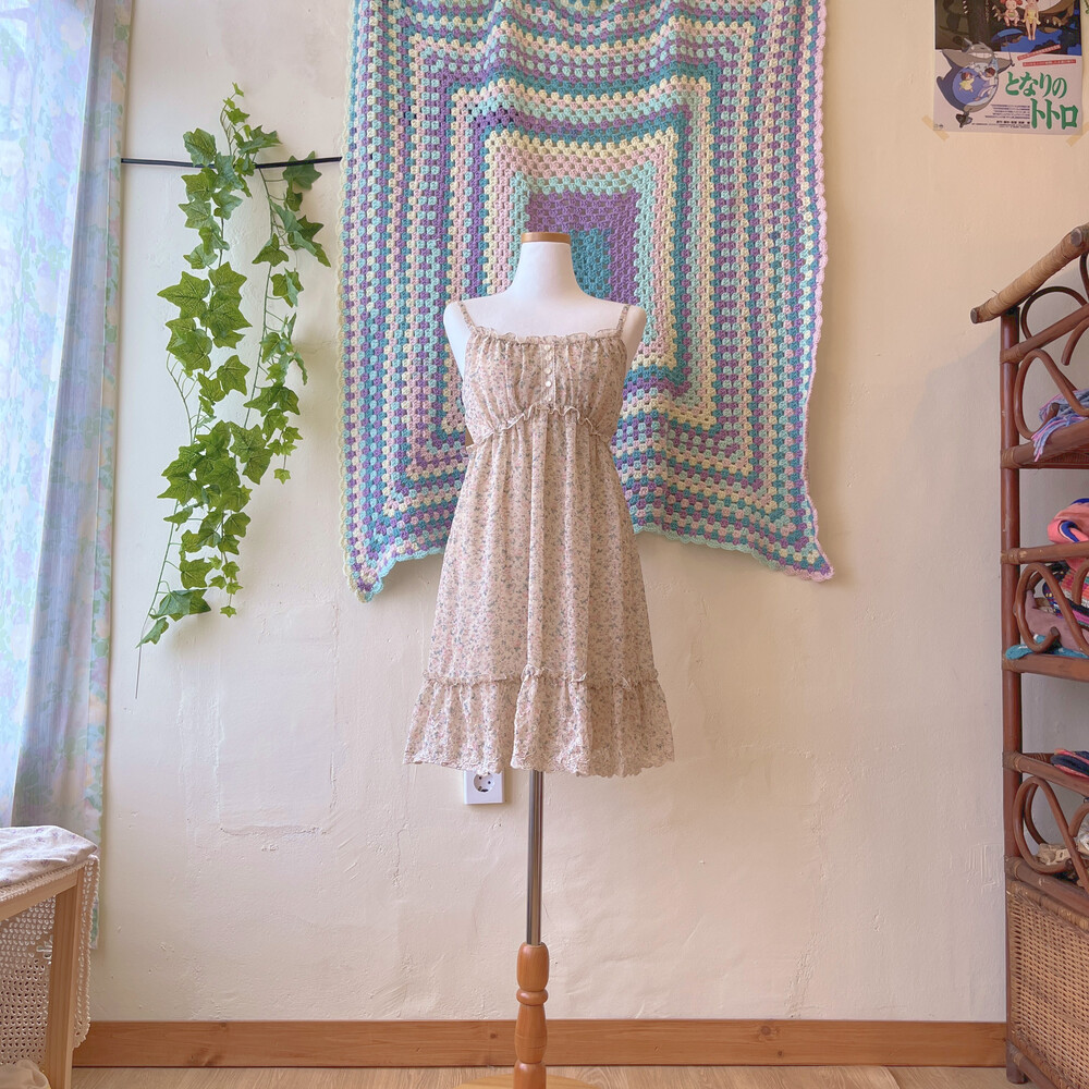 베이지 바탕에 연분홍 색감 꽃무늬 끈원피스예요