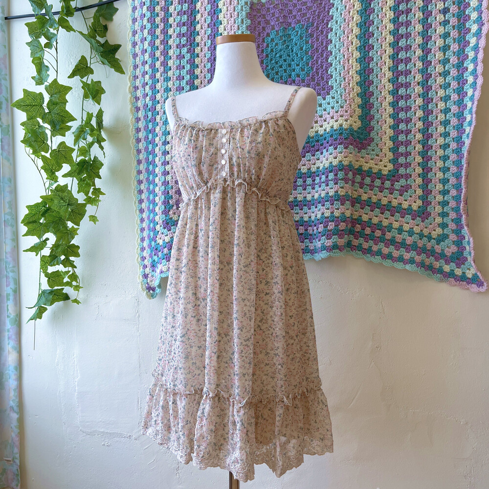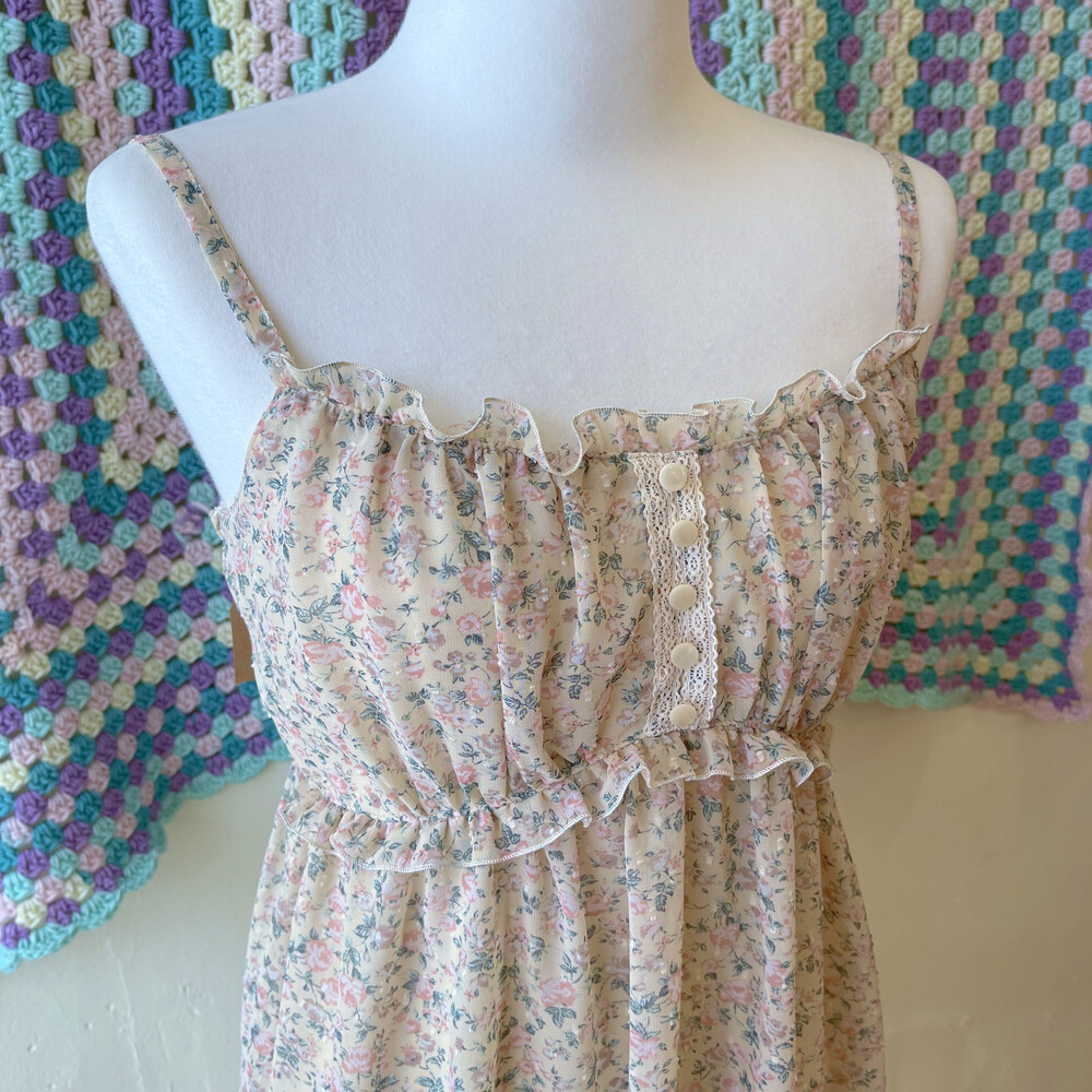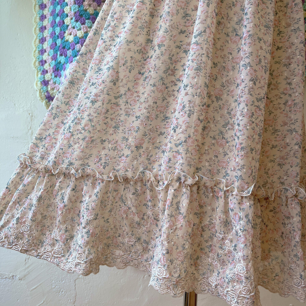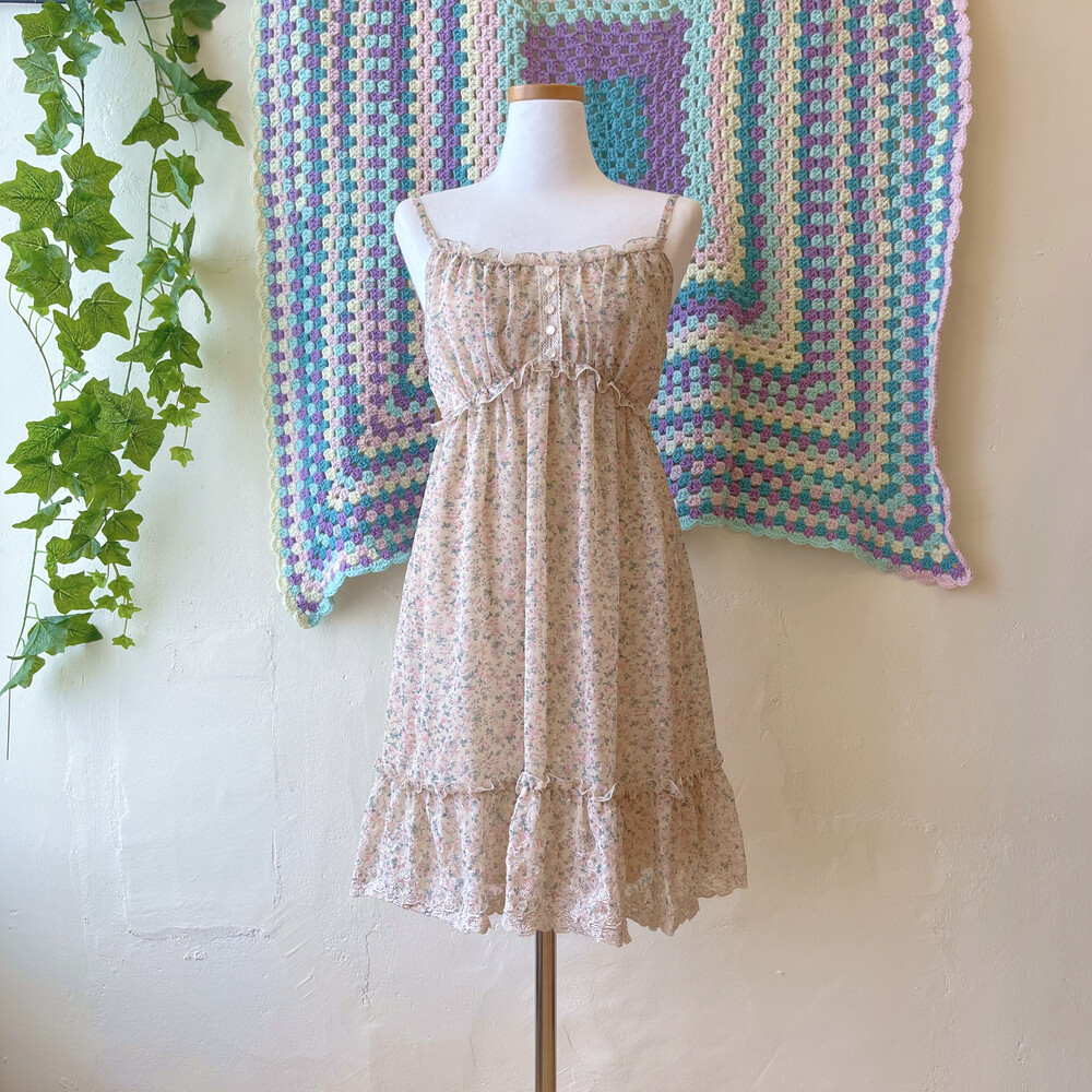 베이지 바탕에 연분홍 색감 꽃무늬 끈원피스예요