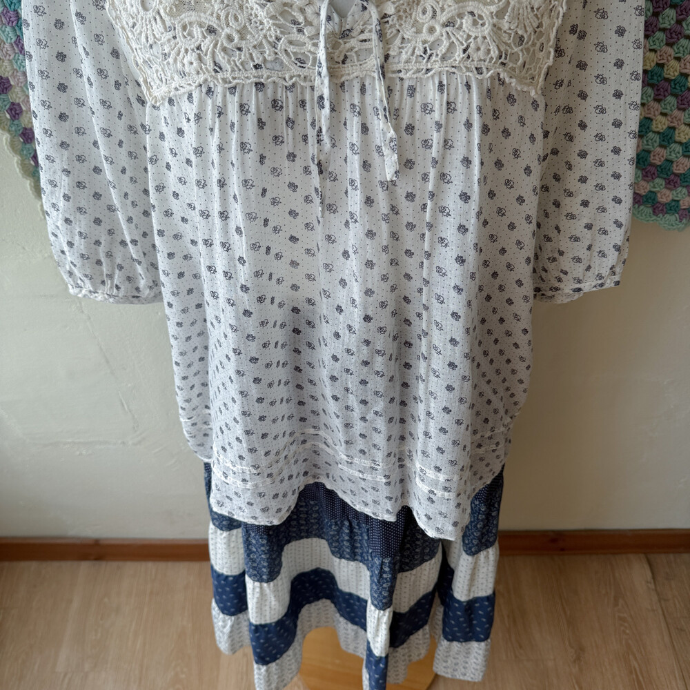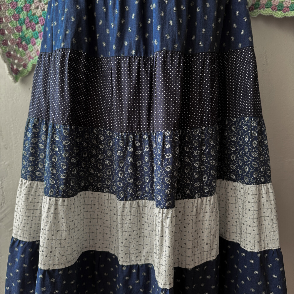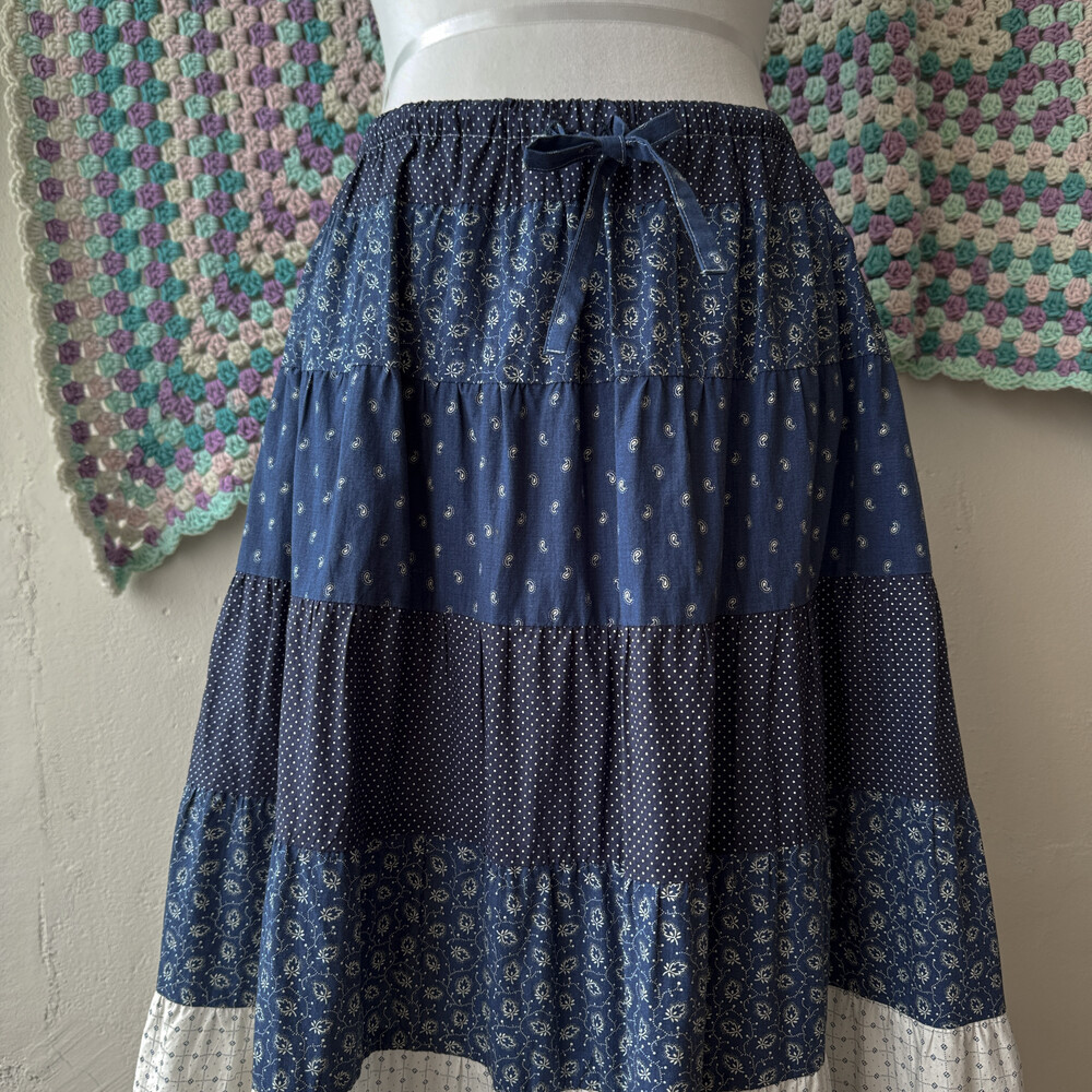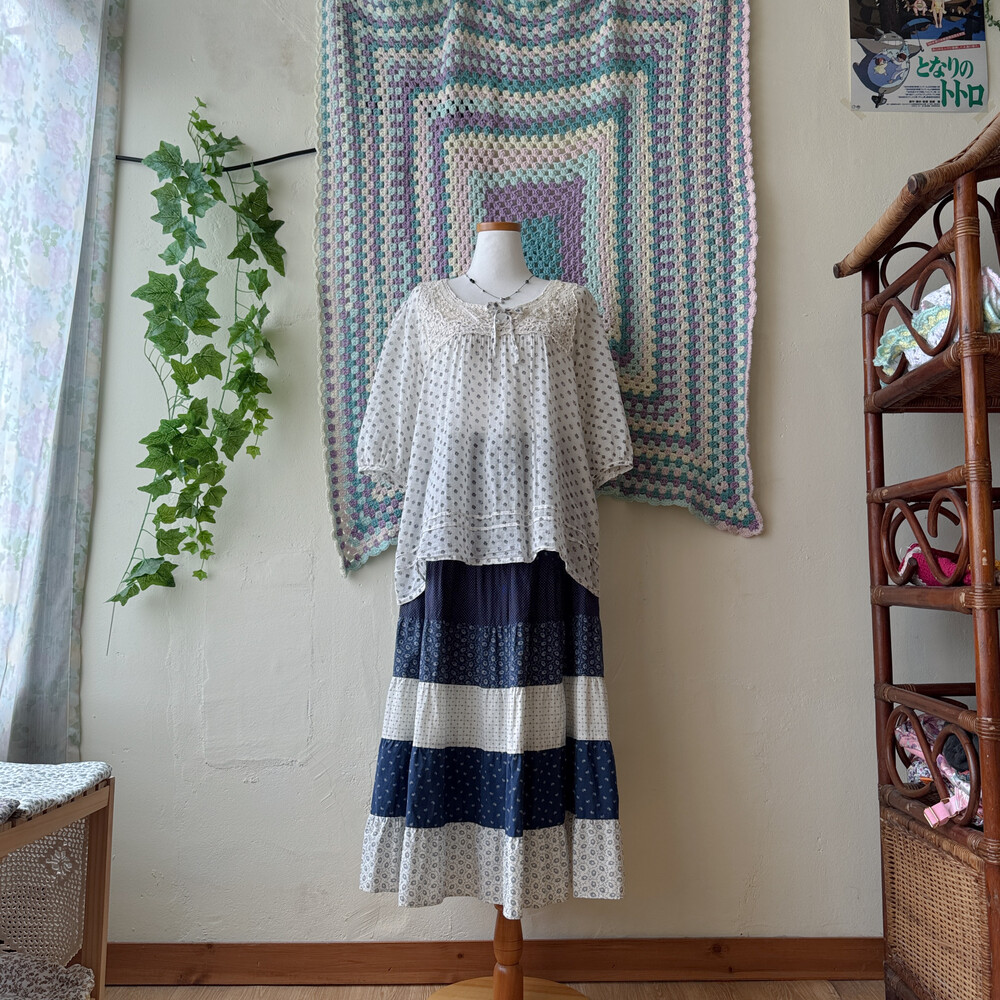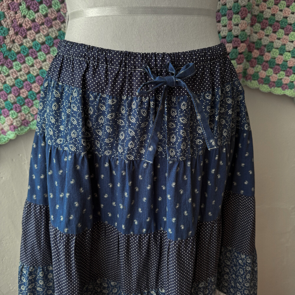 네이비, 아이보리 색감의 패치워크 스커트예요