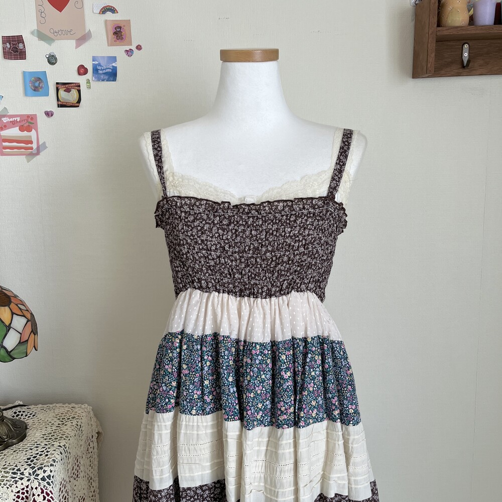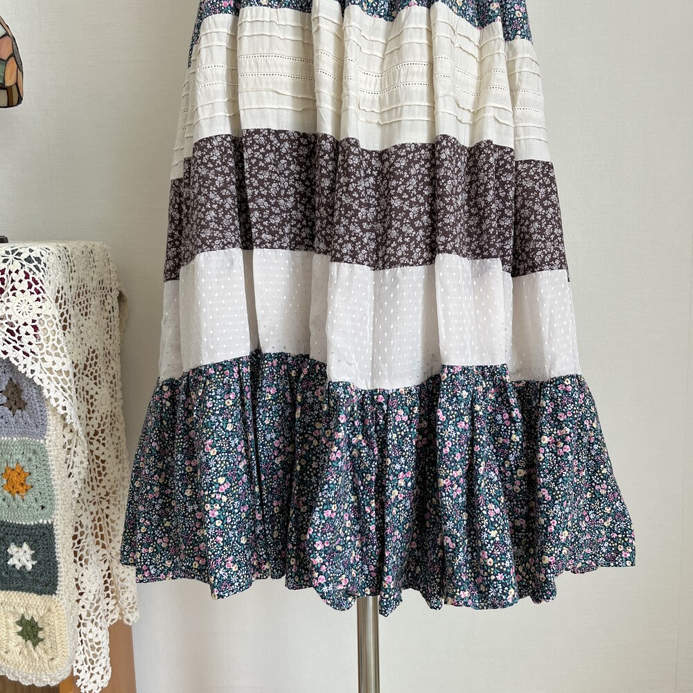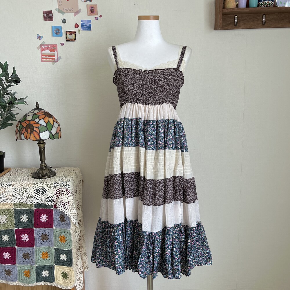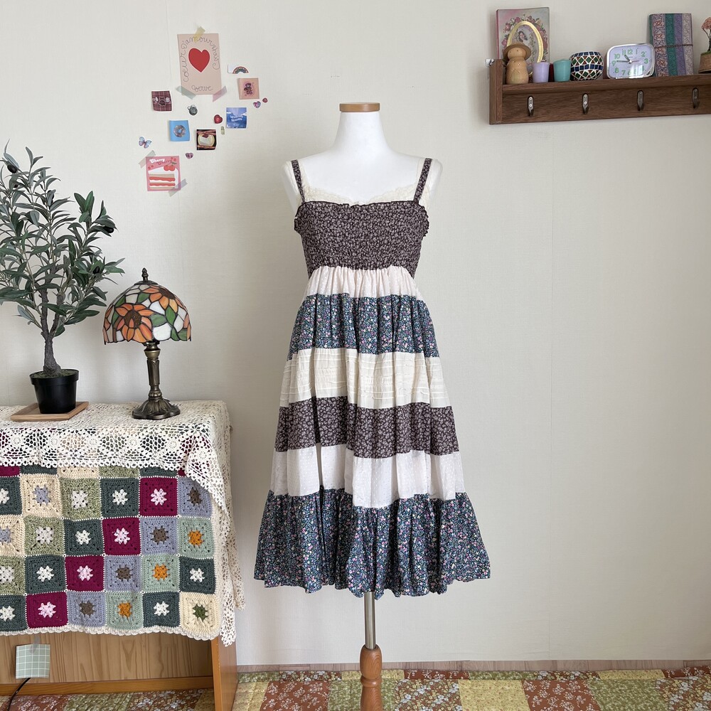 브라운과 블루 색감 베이스의 잔꽃 패치 원피스예요
