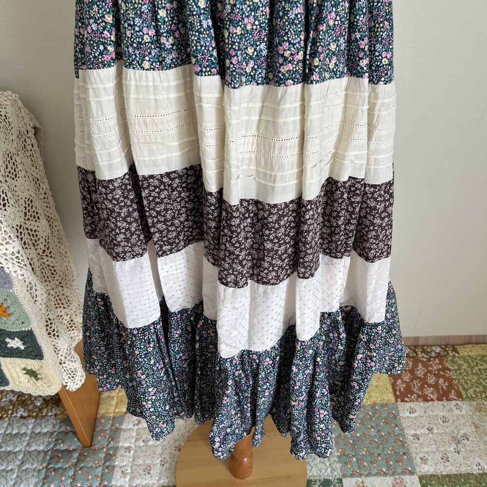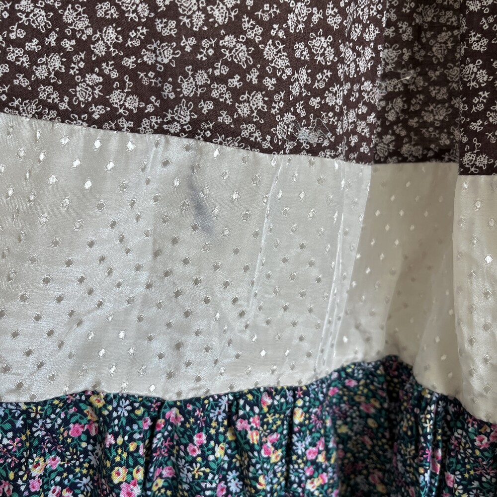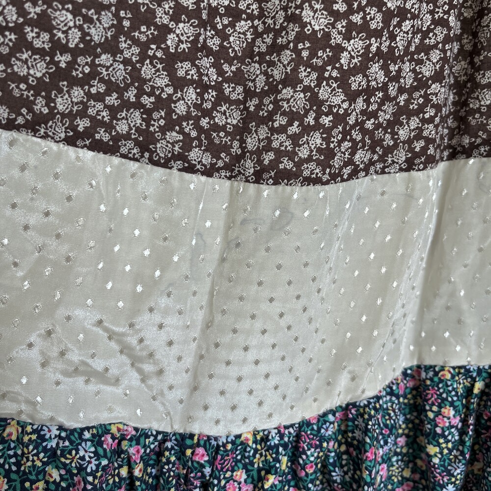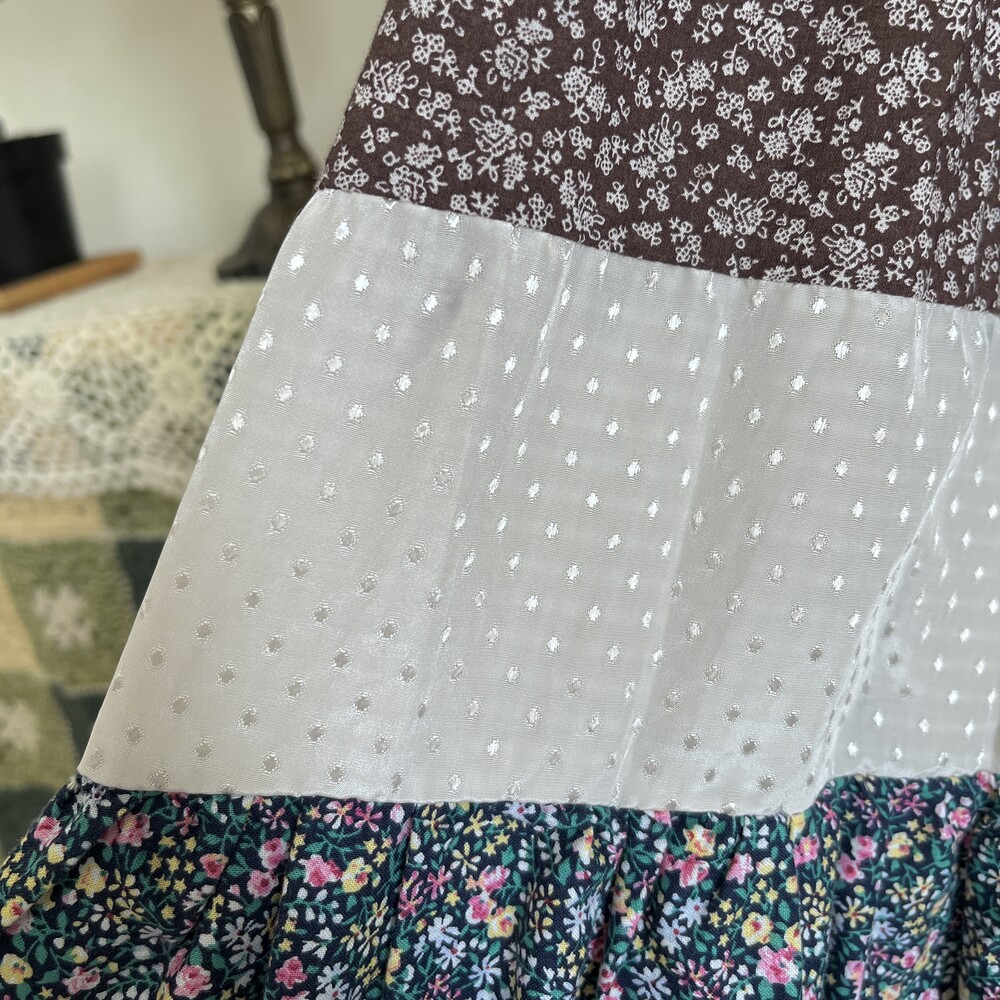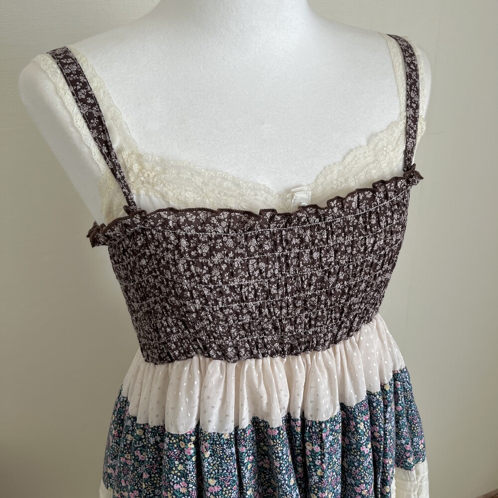 브라운과 블루 색감 베이스의 잔꽃 패치 원피스예요