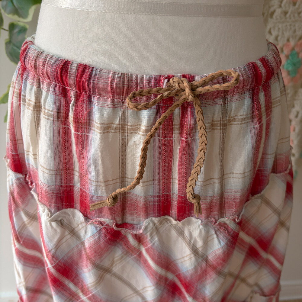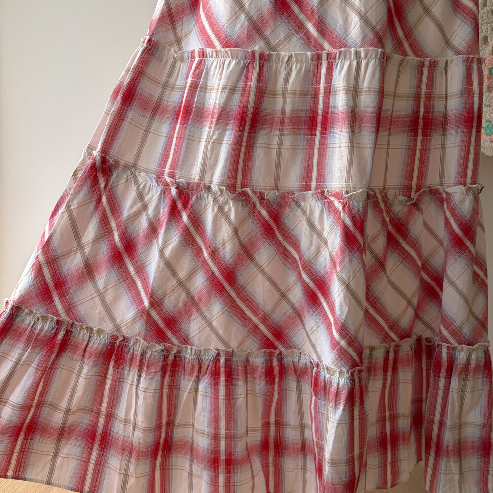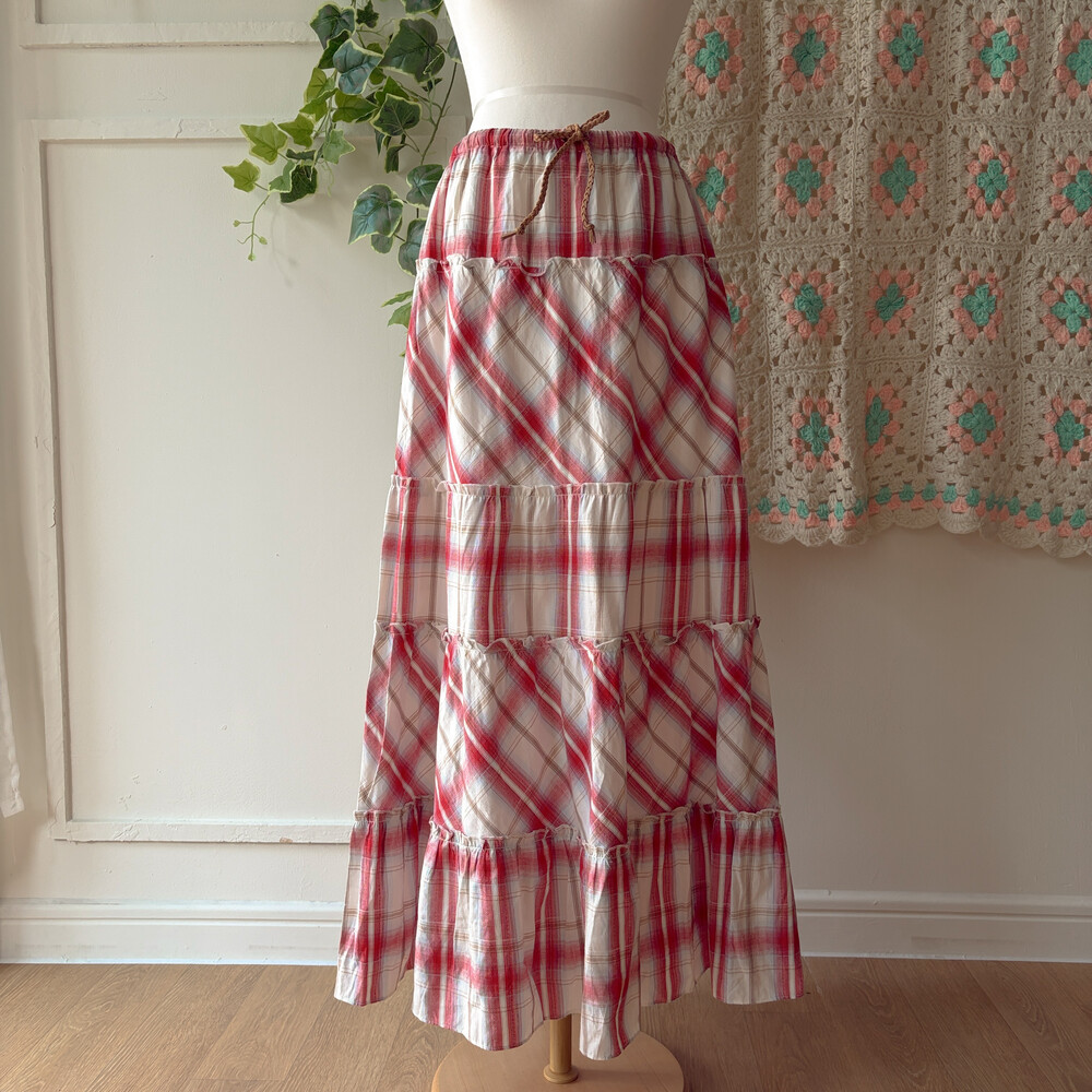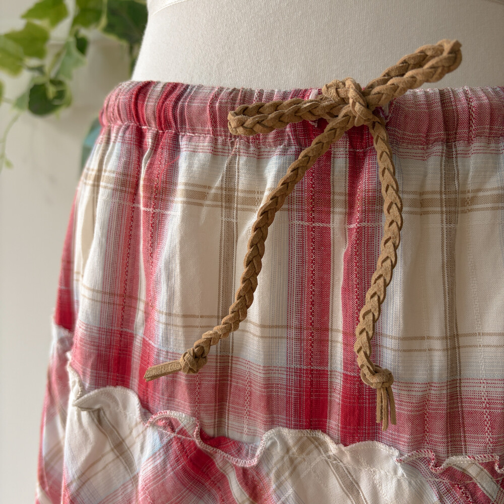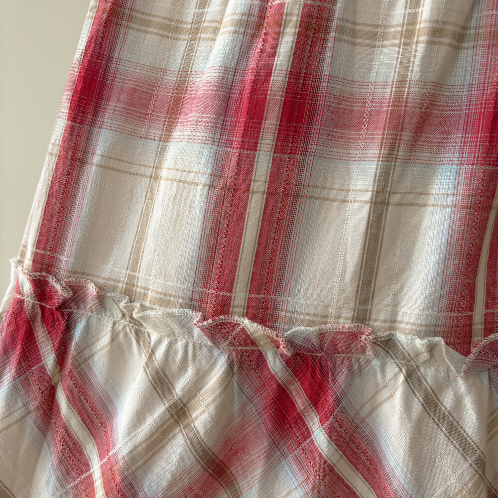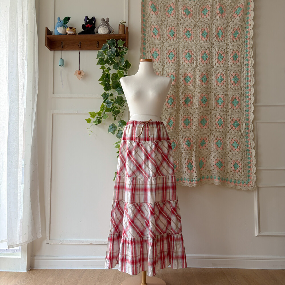 다홍, 아쿠아블루 색감 조합의 체크 스커트예요