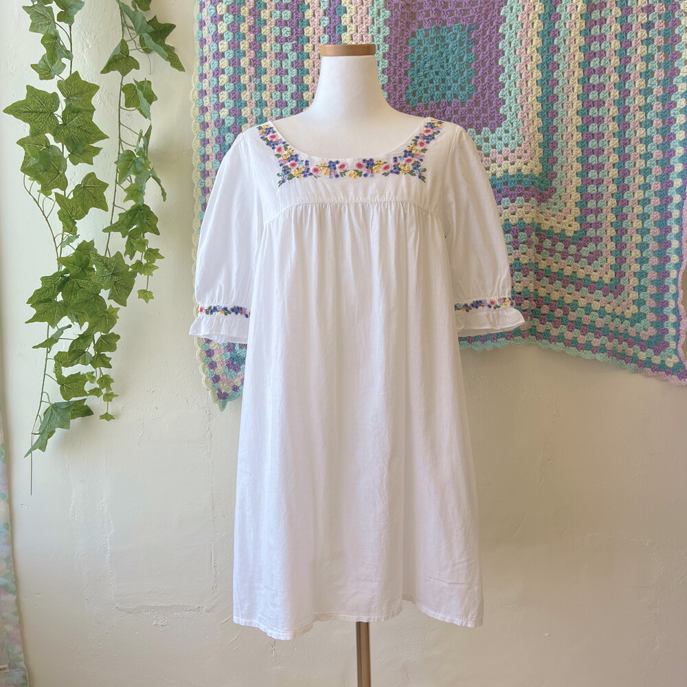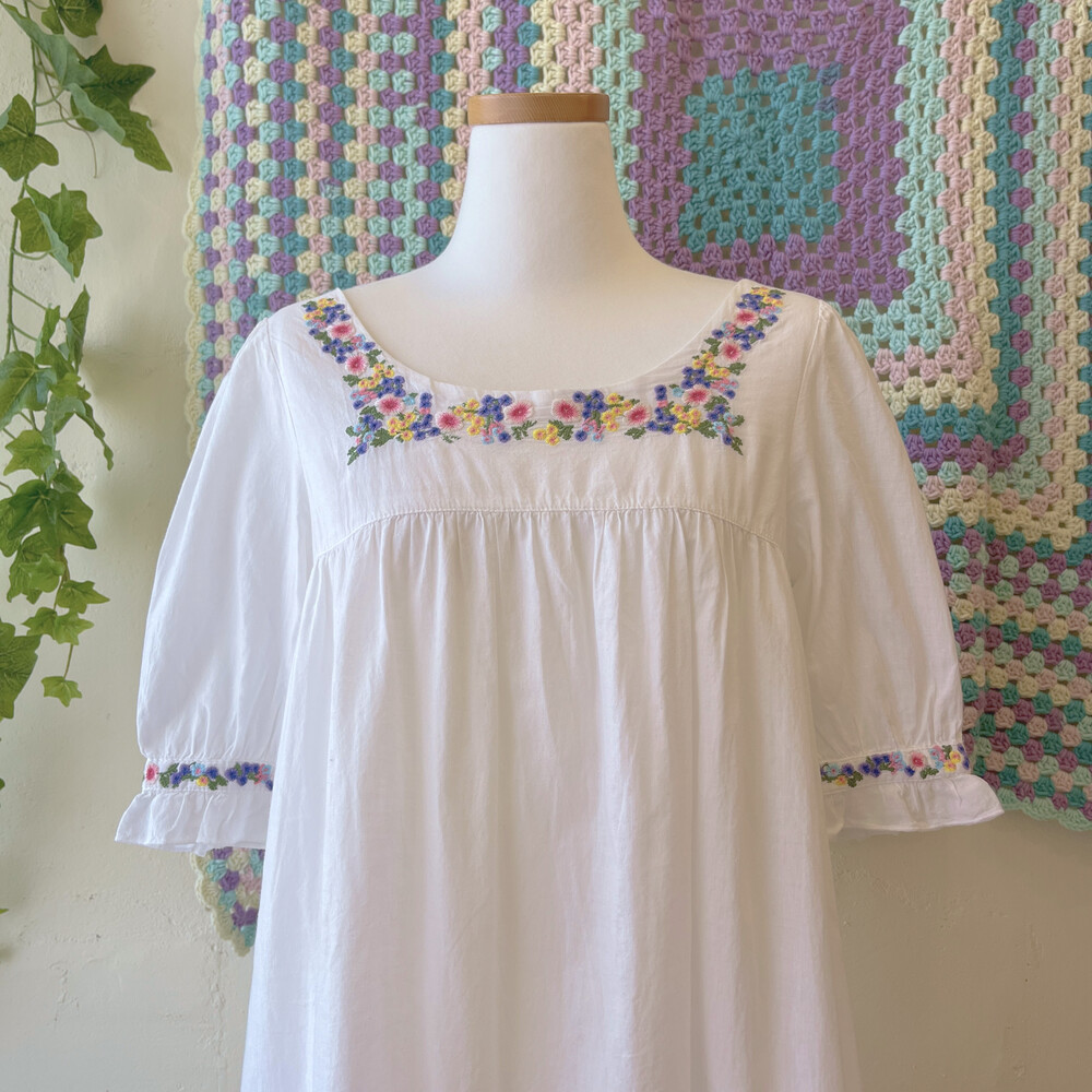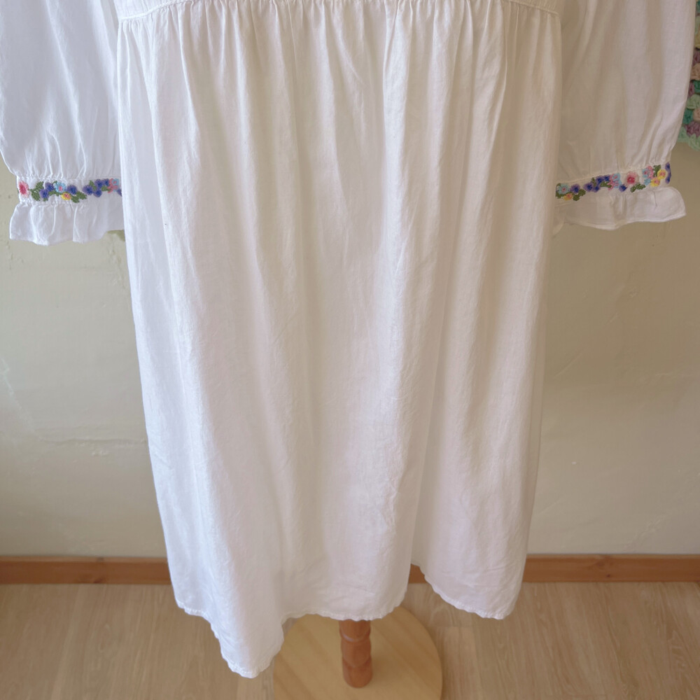 보라, 분홍, 노랑 꽃자수 포인트의 원피스예요